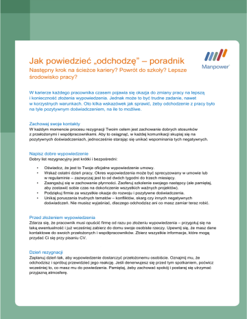 Jak powiedzieć „odchodzę” – poradnik Następny krok na ścieżce kariery? Powrót do szkoły? Lepsze środowisko pracy? W karierze każdego pracownika czasem pojawia się okazja do zmiany pracy na lepszą i konieczność złożenia wypowiedzenia. Jednak może to być trudne zadanie, nawet w korzystnych warunkach. Oto kilka wskazówek jak sprawić, żeby odchodzenie z pracy było na tyle pozytywnym doświadczeniem, na ile to możliwe. Zachowaj swoje kontakty W każdym momencie procesu rezygnacji Twoim celem jest zachowanie dobrych stosunków z przełożonymi i współpracownikami. Aby to osiągnąć, w każdej komunikacji skupiaj się na pozytywnych doświadczeniach, jednocześnie starając się unikać wspominania tych negatywnych. Napisz dobre wypowiedzenie Dobry list rezygnacyjny jest krótki i bezpośredni: • • • • • Oświadcz, że jest to Twoje oficjalne wypowiedzenie umowy. Wskaż ostatni dzień pracy. Okres wypowiedzenia może być sprecyzowany w umowie lub w regulaminie – zazwyczaj jest to od dwóch tygodni do trzech miesięcy. Zaangażuj się w zachowanie płynności. Zaoferuj szkolenie swojego następcy (ale pamiętaj, aby zostawić sobie czas na dokończenie wszystkich ważnych projektów). Podziękuj firmie za wszystkie okazje do rozwoju i pozytywne doświadczenia. Unikaj poruszania trudnych tematów – konfliktów, skarg czy innych negatywnych doświadczeń. Nie musisz wyjaśniać, dlaczego odchodzisz ani co masz zamiar teraz robić. Przed złożeniem wypowiedzenia Zdarza się, że pracownik musi opuścić firmę od razu po złożeniu wypowiedzenia – przygotuj się na taką ewentualność i już wcześniej zabierz do domu swoje osobiste rzeczy. Upewnij się, że masz dane kontaktowe do swoich przełożonych i współpracowników. Zbierz wszystkie informacje, które mogą przydać Ci się przy pisaniu CV. Dzień rezygnacji Zaplanuj dzień tak, aby wypowiedzenie dostarczyć przełożonemu osobiście. Oznajmij mu, że odchodzisz i spróbuj przewidzieć jego reakcję. Jeśli denerwujesz się przed tym spotkaniem, poćwicz wcześniej to, co masz mu do powiedzenia. Pamiętaj, żeby zachować spokój i postaraj się utrzymać przyjazną atmosferę. Zarezerwuj sobie trochę czasu na rozmowę. Prawdopodobnie Twój przełożony będzie chciał porozmawiać na temat niedokończonych projektów oraz Twojej ewentualnej roli w znalezieniu i wyszkoleniu zastępstwa. Rozmowa rezygnacyjna Możesz zostać poproszony o tzw. rozmowę rezygnacyjną z działem HR. Wykorzystaj ją, aby podkreślić wszystkie swoje pozytywne doświadczenia w firmie. Jeśli pojawią się pytania o konflikty, staraj się odpowiadać w neutralnym tonie. Zadbaj też o to, żeby doprecyzować kwestie ewentualnej odprawy czy niewykorzystanego urlopu. W ten sposób będziesz mógł spokojnie skoncentrować się na swojej przyszłości.