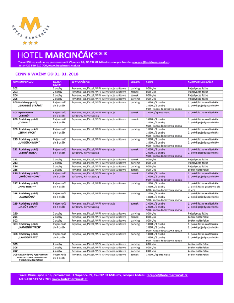 HOTEL MARCINČÁK*** Travel Wine, spol. s r.o, provozovna: K Vápence 69, CZ-692 01 Mikulov, recepce hotelu: [email protected], tel.:+420 519 512 700, www.hotelmarcincak.cz CENNIK WAŹNY OD 01. 01. 2016 NUMER POKOJU WYPOSAŹENIE WIDOK CENA KOMPOZYCJA ŁÓŹEK 202 203 204 205 206 Rodzinny pokój „BRODSKÉ STRÁNĚ“ LICZBA LÓZEK 2 osoby 2 osoby 2 osoby 2 osoby Pojemność do 3 osób Prysznic, wc,TV,tel.,WiFi, wentylacja sufitowa Prysznic, wc,TV,tel.,WiFi, wentylacja sufitowa Prysznic, wc,TV,tel.,WiFi, wentylacja sufitowa Prysznic, wc,TV,tel.,WiFi, wentylacja sufitowa Prysznic, wc,TV,tel.,WiFi, wentylacja sufitowa parking zamek zamek parking parking Pojedyncze łóżka Pojedyncze łóżka Pojedyncze łóżka Pojedyncze łóżka 1. pokój łóżko małżeńskie 2. pokój pojedyncze łóżko 207 Apartament „STARÉ“ 208 Rodzinny pokój „DANIEL“ Pojemność do 2 osób Pojemność do 3 osób Prysznic, wc,TV,tel.,WiFi, wentylacja sufitowa, klimatyzacją Prysznic, wc,TV,tel.,WiFi, wentylacja sufitowa zamek 800,-/os 800,-/os 800,-/os 800,-/os 1.800,-/1 osoba 1.800,-/2 osoby 900,- każda dodatkowa osoba 2.000,-/apartament 1. pokój łóżko małżeńskie 2. pokój pojedyncze łóżko 209 Rodzinny pokój „ZIMNÍ VRCH“ Pojemność do 4 osób Prysznic, wc,TV,tel.,WiFi, wentylacja sufitowa parking 210 Rodzinny pokój „U BOŽÍCH MUK“ Pojemność do 3 osób Prysznic, wc,TV,tel.,WiFi, wentylacja sufitowa parking 211 Rodzinny pokój „STARÁ HORA“ Pojemność do 4 osób Prysznic, wc,TV,tel.,WiFi, wentylacja sufitowa, klimatyzacją zamek 212 213 214 215 216 Rodzinny pokój „RŮŽOVÁ HORA“ 2 osoby 2 osoby 2 osoby 2 osoby Pojemność do 3 osób Prysznic, wc,TV,tel.,WiFi, wentylacja sufitowa Prysznic, wc,TV,tel.,WiFi, wentylacja sufitowa Prysznic, wc,TV,tel.,WiFi, wentylacja sufitowa Prysznic, wc,TV,tel.,WiFi, wentylacja sufitowa Prysznic, wc,TV,tel.,WiFi, wentylacja sufitowa, klimatyzacją zamek parking parking zamek zamek 217 Rodzinny pokój „NAD SKLEPY“ Pojemność do 4 osób Prysznic, wc,TV,tel.,WiFi, wentylacja sufitowa parking 218 Rodzinny pokój „SLUNEČNÁ“ Pojemność do 3 osób Prysznic, wc,TV,tel.,WiFi, wentylacja sufitowa parking 219 Rodzinny pokój „JANŮV VRCH“ Pojemność do 4 osób Prysznic, wc,TV,tel.,WiFi, wentylacja sufitowa, klimatyzacją zamek 220 221 302 303 Rodzinny pokój „KAMENNÝ VRCH“ 2 osoby 2 osoby 2 osoby Pojemność do 4 osób Prysznic, wc,TV,tel.,WiFi, wentylacja sufitowa Prysznic, wc,TV,tel.,WiFi, wentylacja sufitowa Prysznic, wc,TV,tel.,WiFi, wentylacja sufitowa Prysznic, wc,TV,tel.,WiFi, wentylacja sufitowa parking zamek parking parking 304 Rodzinny pokój „LANGEWARTE“ Pojemność do 4 osób Prysznic, wc,TV,tel.,WiFi, wentylacja sufitowa parking 305 306 307 308 Lawendowy Apartament 2 osoby 2 osoby 2 osoby Pojemność do 2 osób Prysznic, wc,TV,tel.,WiFi, wentylacja sufitowa Prysznic, wc,TV,tel.,WiFi, wentylacja sufitowa Prysznic, wc,TV,tel.,WiFi, wentylacja sufitowa Prysznic, wc,TV,tel.,WiFi, wentylacja sufitowa parking parking parking zamek 1.800,-/1 osoba 1.800,-/2 osoby 900,- każda dodatkowa osoba 1.800,-/1 osoba 1.800,-/2 osoby 900,- każda dodatkowa osoba 1.800,-/1 osoba 1.800,-/2 osoby 900,- każda dodatkowa osoba 2.000,-/1 osoba 2.000,-/2 osoby 900,- każda dodatkowa osoba 800,-/os 800,-/os 800,-/os 800,-/os 2.000,-/1 osoba 2.000,-/2 osoby 900,- każda dodatkowa osoba 1.800,-/1 osoba 1.800,-/2 osoby 800,- każda dodatkowa osoba 1.800,-/1 osoba 1.800,-/2 osoby 900,- każda dodatkowa osoba 2.000,-/1 osoba 2.000,-/2 osoby 900,- każda dodatkowa osoba 800,-/os 800,-/os 800,-/os 1.800,-/1 osoba 1.800,-/2 osoby 900,- każda dodatkowa osoba 1.800,-/1 osoba 1.800,-/2 osoby 900,- każda dodatkowa osoba 800,-/os 800,-/os 800,-/os 1.800,-/apartament ROMANTYCZNY APARTAMENT Z WIDOKIEM NA ZAMEK zamek 1. pokój łóżko małżeńskie 1. pokój łóżko małżeńskie 2. pokój pojedyncze łóżka 1. pokój łóżko małżeńskie 2. pokój pojedyncze łóżko 1. pokój łóżko małżeńskie 2. pokój pojedyncze łóżka Pojedyncze łóżka Pojedyncze łóżka Pojedyncze łóżka Łóżko małżeńskie 1. pokój łóżko małżeńskie 2. pokój pojedyncze łóżko 1. pokój łóżko małżeńskie 2. pokój łóżko piętrowe dla dzieci 1. pokój łóżko małżeńskie 2. pokój pojedyncze łóżko 1. pokój łóżko małżeńskie 2. pokój pojedyncze łóżka Pojedyncze łóżka Łóżko małżeńskie Łóżko małżeńskie 1. pokój łóżko małżeńskie 2. pokój pojedyncze łóżka 1. pokój łóżko małżeńskie 2. pokój pojedyncze łóżka Łóżko małżeńskie Łóżko małżeńskie Łóżko małżeńskie Łóżko małżeńskie 2 Travel Wine, spol. s r.o, provozovna: K Vápence 69, CZ-692 01 Mikulov, recepce hotelu: [email protected], tel.:+420 519 512 700, www.hotelmarcincak.cz HOTEL MARCINČÁK*** Travel Wine, spol. s r.o, provozovna: K Vápence 69, CZ-692 01 Mikulov, recepce hotelu: [email protected], tel.:+420 519 512 700, www.hotelmarcincak.cz CENNIK Przy pełnym obłożeniu w pokoju dwuosobowym, cena 800 CZK za osobę za noc W dwuosobowym pokoju przez jedną osobę, cena to 900 CZK za osobę za noc Apartament rodzinny lub apartament zajmowany przez jedną osobę kosztuje 1.800 CZK za noc Ceny zawierają śniadanie i podatek VAT Opłaty localna /6 CZK za osobę za dzień/ i rekreacji /15 CZK za osobę za dzień, przy zakwaterowaniu na 2 noce i więcej/ są płatne na miejscu Akceptujemy karty VISA, Maes, Amex, EC / MC, JCB, DC Zakwaterowanie dla dzieci poniżej 3 roku życia jest bezpłatny bez śniadanie w hotelu Bardzo nam przykro, ale swoje zwierzęta prosimy zostawić w domu ZNIŻKI NA NOCLEGI RABATU DLA STAŁYCH GOŚCI ZNIŻKA DLA DŁUGOTERMINOWEGO ZAKWATEROWANIA, MIN. TYDZIEŃ KORPORACYJNY RABAT ZNIŻKI GRUPOWE ZASADY ANULOWANIA ANULOWANIE REZERWACJI MUSI BYĆ DOKONANE NA PIŚMIE I STAJE SIĘ SKUTECZNE Z DNIEM OTRZYMANIA I POTWIERDZONE PRZEZ MARCINČÁK HOTELU***. HOTEL MARCINČÁK*** POTWIERDZENIE OTRZYMANIA ODWOŁ