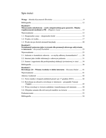 Spis treści Wstęp – Monika Kaczmarek-Śliwińska ............................................................. 9 Bibliografia ....................................................................................................... 12 Rozdział 1 Mieszczanin szlachcicem – czyli o niepotrzebnej grze pozorów. Między współczesnymi mediami a PR – Zbigniew Lazar ........................................... 13 Wprowadzenie .................................................................................................. 13 1.1. Desperackie czasy – desperackie kroki ..................................................... 14 1.2. Ni pies, ni wydra….. .................................................................................. 17 1.3. Wcale nie po dwóch stronach barykady .................................................... 20 Rozdział 2 Świadomość potoczna jako wyzwanie dla promocji zdrowego odżywiania w internecie – Krzysztof Puchalski .................................................................. 23 Wprowadzenie .................................................................................................. 23 2.1. Jedzenie w kontekście zdrowia – co myślą odbiorcy komunikatów? ....... 28 2.2. Internet jako źródło informacji o zdrowym jedzeniu ................................ 31 2.3. Szanse i zagrożenia dla profesjonalnej edukacji żywieniowej w sieci ...... 34 Bibliografia ....................................................................................................... 36 Rozdział 3 Rewolucja 2.0 – Wiosna Arabska w dobie internetu – Roszana Dalati ...... 41 Wprowadzenie .................................................................................................. 41 Aktorzy wydarzeń ............................................................................................ 42 3.1. Nowe media w krajach arabskich przed i po 17 grudnia 2010 r. ............... 42 3.2. Rewolucja na ulicach a rewolucja w internecie – przypadek Tunezji i Egiptu ...................................................................................................... 45 3.3. Wirus rewolucji w świecie arabskim i transformacja roli internetu .......... 50 3.4. Oficjalne uznanie dla roli nowych mediów na świecie ............................. 52 Podsumowanie .................................................................................................. 53 Bibliografia ....................................................................................................... 54 6 Spis treści Rozdział 4 CSR w branży energetycznej na przykładzie współpracy z uniwersytetem – Monika Bogdał ................................................................................................. 57 Wprowadzenie .................................................................................................. 57 4.1. Społeczna odpowiedzialność biznesu w branży energetycznej ................. 57 4.2. CSR ukierunkowany na rynek pracy w Polsce .......................................... 63 4.3.Kształcenie pracowników elektrowni jądrowych jako element strategii CSR ............................................................................................. 65 Podsumowanie .................................................................................................. 68 Bibliografia ....................................................................................................... 69 Rozdział 5 Street art jako forma komunikacji w przestrzeni publicznej – Sandra Recka .................................................................................................... 73 Wprowadzenie .................................................................................................. 73 5.1. Graffiti a komunikacja ............................................................................... 74 5.2. Inteligentny dialog na… murze ................................................................. 75 5.3. Sztuka odpowiedzialna .............................................................................. 77 Podsumowanie .................................................................................................. 80 Bibliografia ....................................................................................................... 81 Rozdział 6 Komunikacja marketingowa na rynku usług telekomunikacyjnych w praktyce działalności operatorów – Anna Korzeniewska .......................... 83 Wprowadzenie .................................................................................................. 83 6.1. Istota rynku usług telekomunikacyjnych ................................................... 84 6.2. Otoczenie przedsiębiorstwa telekomunikacyjnego .................................... 89 6.3. Formy promocji usług telekomunikacyjnych .......................................... 102 6.4. Przykłady wykorzystania nowych kanałów komunikacji marketingowej przez polskich operatorów ...................................................................... 108 Podsumowanie ................................................................................................ 118 Bibliografia ..................................................................................................... 119 Spis treści 7 Rozdział 7 Muzeum firmowe jako forma komunikowania się marki z otoczeniem – Monika Kaczmarek-Śliwińska ........................................................................ 123 Wprowadzenie ................................................................................................ 123 7.1. Pojęcie marki ........................................................................................... 124 7.2. Kultura wspomagająca biznes ................................................................. 125 7.3. Wartość komunikowania się marki przez kulturę ................................... 131 Podsumowanie .............................................