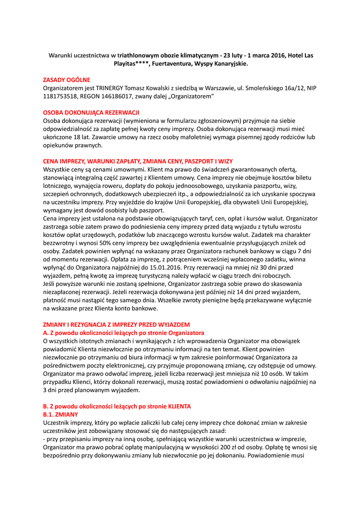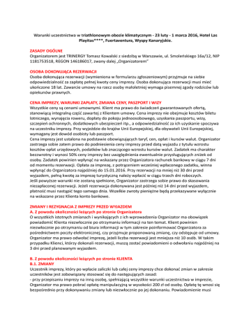 Warunki uczestnictwa w triathlonowym obozie klimatycznym - 23 luty - 1 marca 2016, Hotel Las Playitas****, Fuertaventura, Wyspy Kanaryjskie. ZASADY OGÓLNE Organizatorem jest TRINERGY Tomasz Kowalski z siedzibą w Warszawie, ul. Smoleńskiego 16a/12, NIP 1181753518, REGON 146186017, zwany dalej „Organizatorem” OSOBA DOKONUJĄCA REZERWACJI Osoba dokonująca rezerwacji (wymieniona w formularzu zgłoszeniowym) przyjmuje na siebie odpowiedzialność za zapłatę pełnej kwoty ceny imprezy. Osoba dokonująca rezerwacji musi mieć ukończone 18 lat. Zawarcie umowy na rzecz osoby małoletniej wymaga pisemnej zgody rodziców lub opiekunów prawnych. CENA IMPREZY, WARUNKI ZAPŁATY, ZMIANA CENY, PASZPORT I WIZY Wszystkie ceny są cenami umownymi. Klient ma prawo do świadczeń gwarantowanych ofertą, stanowiącą integralną część zawartej z Klientem umowy. Cena imprezy nie obejmuje kosztów biletu lotniczego, wynajęcia roweru, dopłaty do pokoju jednoosobowego, uzyskania paszportu, wizy, szczepień ochronnych, dodatkowych ubezpieczeń itp., a odpowiedzialność za ich uzyskanie spoczywa na uczestniku imprezy. Przy wyjeździe do krajów Unii Europejskiej, dla obywateli Unii Europejskiej, wymagany jest dowód osobisty lub paszport. Cena imprezy jest ustalona na podstawie obowiązujących taryf, cen, opłat i kursów walut. Organizator zastrzega sobie zatem prawo do podniesienia ceny imprezy przed datą wyjazdu z tytułu wzrostu kosztów opłat urzędowych, podatków lub znaczącego wzrostu kursów walut. Zadatek ma charakter bezzwrotny i wynosi 50% ceny imprezy bez uwzględnienia ewentualnie przysługujących zniżek od osoby. Zadatek powinien wpłynąć na wskazany przez Organizatora rachunek bankowy w ciągu 7 dni od momentu rezerwacji. Opłata za imprezę, z potrąceniem wcześniej wpłaconego zadatku, winna wpłynąć do Organizatora najpóźniej do 15.01.2016. Przy rezerwacji na mniej niż 30 dni przed wyjazdem, pełną kwotę za imprezę turystyczną należy wpłacić w ciągu trzech dni roboczych. Jeśli powyższe warunki nie zostaną spełnione, Organizator zastrzega sobie prawo do skasowania niezapłaconej rezerwacji. Jeżeli rezerwacja dokonywana jest później niż 14 dni przed wyjazdem, płatność musi nastąpić tego samego dnia. Wszelkie zwroty pieniężne będą przekazywane wyłącznie na wskazane przez Klienta konto bankowe. ZMIANY I REZYGNACJA Z IMPREZY PRZED WYJAZDEM A. Z powodu okoliczności leżących po stronie Organizatora O wszystkich istotnych zmianach i wynikających z ich wprowadzenia Organizator ma obowiązek powiadomić Klienta niezwłocznie po otrzymaniu informacji na ten temat. Klient powinien niezwłocznie po otrzymaniu od biura informacji w tym zakresie poinformować Organizatora za pośrednictwem poczty elektronicznej, czy przyjmuje proponowaną zmianę, czy odstępuje od umowy. Organizator ma prawo odwołać imprezę, jeżeli liczba rezerwacji jest mniejsza niż 10 osób. W takim przypadku Klienci, którzy dokonali rezerwacji, muszą zostać powiadomieni o odwołaniu najpóźniej na 3 dni przed planowanym wyjazdem. B. Z powodu okoliczności leżących po stronie KLIENTA B.1. ZMIANY Uczestnik imprezy, który po wpłacie zaliczki lub całej ceny imprezy chce dokonać zmian w zakresie uczestników jest zobowiązany stosować się do następujących zasad: - przy przepisaniu imprezy na inną osobę, spełniającą wszystkie warunki uczestnictwa w imprezie, Organizator ma prawo pobrać opłatę manipulacyjną w wysokości 200 zł od osoby. Opłatę tę wnosi się bezpośrednio przy dokonywaniu zmiany lub niezwłocznie po jej dokonaniu. Powiadomienie musi nastąpić niezwłocznie po powzięciu przez Klienta decyzji o zmianie uczestnika. Przy przepisywaniu imprezy z osoby na osobę odpowiedzialni solidarnie za zapłatę ceny imprezy są obaj Klienci; B.2. REZYGNACJA Z IMPREZY Rezygnacja przez Klienta z zakupionej imprezy wymaga pisemnego oświadczenia pod rygorem nieważności. Jeżeli Klient zrezygnuje z uczestnictwa w imprezie lub jeżeli nie rozpocznie imprezy z powodów niezależnych od Organizatora, Klientowi przysługuje zwrot wpłaconej części wpłaconej kwoty po potrąceniu przez kwoty stanowiącej zadatek. Koszty potrąceń – względem całkowitej wartości zawartej umowy – kształtują się następująco: • do 45 dni przed datą wyjazdu – do 50% ceny imprezy (zadatek), • od 45 dni przed datą wyjazdu – do 100% ceny imprezy. Jeżeli jedna z dwóch osób uczestniczących razem w imprezie rezygnuje, to druga z tych osób, która podróżować będzie samotnie, zobowiązana jest do uiszczenia opłaty odpowiadającej dodatkowi za pokój jednoosobowy. W przypadku braku dopłaty do pokoju jednoosobowego lub braku możliwości zakwaterowania w pokoju jednoosobowym osoba taka zostanie dokwaterowana do innej osoby tej samej płci w przypadku odpowiednich możliwości organizacyjnych. OBOWIĄZKI I ODPOWIEDZIALNOŚĆ ORGANIZATORA PO WYJEŹDZIE Organizator nie jest odpowiedzialne za informacje zawarte w publikacjach, broszurach, folderach, ulotkach itp. wydawanych przez hotel. REKLAMACJE Jeżeli uczestnik stwierdzi wady imprezy, winien on wnieść reklamację względem Organizatora celem umożliwienia usunięcia wady na miejscu. Okres rozpatrywania reklamacji wynosi 30 dni od daty zakończenia imprezy turystycznej, a w wypadku zgłoszenia tej reklamacji po zakończeniu imprezy turystycznej 30 dni od jej złożenia (obowiązuje data wpłynięcia pisma do Organizatora). Podstawą reklamacji nie mogą być okoliczności, za które Organizator nie ponosi odpowiedzialności. POSTANOWIENIA KOŃCOWE W sprawach nieuregulowanych niniejszymi Warunkami Uczestnictwa zastosowanie mają odpowiednio przepisy Kodeksu Cywilnego . Ewentualne spory strony będą rozstrzygały polubownie, a w przypadku nieosiągnięcia porozumienia przez właściwy miejscowo sąd.