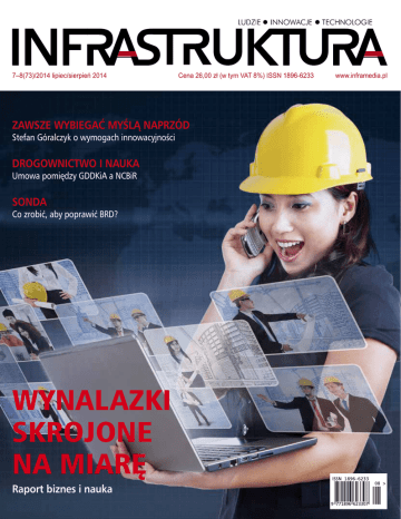7–8(73)/2014 lipiec/sierpień 2014 Cena 26,00 zł (w tym VAT 8%) ISSN 1896-6233 ZAWSZE WYBIEGAĆ MYŚLĄ NAPRZÓD Stefan Góralczyk o wymogach innowacyjności DROGOWNICTWO I NAUKA Umowa pomiędzy GDDKiA a NCBiR SONDA Co zrobić, aby poprawić BRD? WYNALAZKI SKROJONE NA MIARĘ Raport biznes i nauka www.inframedia.pl od dwudziestu lat z Wami ul. Kamienna 7, Wysogotowo, 62-081 Przeźmierowo tel. +48 61 668 17 00, fax +48 61 668 17 35 [email protected] www.msrtraffic.com.pl M ądrego menedżera nie trzeba przekonywać do wdrażania innowacji w przedsiębiorstwie. Nie znaczy to, że współpraca z biznesem jest łatwa, wręcz przeciwnie, ale to być albo nie być jednostek naukowo-badawczych – przekonuje w rozmowie miesiąca dr hab. inż. Stefan Góralczyk, prof. nadzw. i dyrektor Instytutu Mechanizacji Budow nictwa i Górnictwa Skalnego. Stwierdzenie to było przyczynkiem do dyskusji nad rolą współczesnej nauki oraz jej powiązaniami z biznesem. Dobrych przykładów jest już mnóstwo, a kolejnych przybywa jak grzybów po deszczu. To rezultat tego, że nauka wychodzi do biznesu i dopasowuje swoje projekty do wyzwań gospodarki. Powstają „Wynalazki skrojone na miarę”, które stały się zresztą głównym bohaterem naszego raportu. Idąc dalej śladem nowoczesnej nauki, odkrywaliśmy istotne dla niej zagadnienia. Obok bardzo popularnego określenia „innowacja” drugim równie często pojawiającym się jest „interdyscyplinarność”. To nic innego jak budowanie zespołów składających się z ekspertów w różnych dziedzinach. W ten sposób kreuje się rzeczywistość – to z kolei moje ulubione sformułowanie. G d y by m po w y sł uch a n iu wszystkich prezentowanych w wydaniu opinii miała Państwu opisać, jak powinna wyglądać nowoczesna gospodarka oparta na wiedzy, musiałabym zacząć od stwierdzenia, że przede wszystkim potrzebni są jej menedżerowie o otwartych umysłach i bardzo rozwiniętych zdolnościach interpersonalnych. To one umożliwiają budowanie interdyscyplinarnych teamów, a także osobisty rozwój osób je tworzących. Mądry menedżer to nie ten, który błyszczy w zespole, ale ten, który pozwala zabłyszczeć innym, wysłuchuje ich pomysłów i sprawia, że czują się w tym zespole niezbędni. Więc choć dopada codzienność: terminy i czas, który nie stoi w miejscu, pamiętajmy, że obecnie na budowaniu relacji możemy zyskać bardziej niż kiedykolwiek. Właśnie dlatego w tym wydaniu „Infrastruktury” dużo wywiadów – chcemy zaprezentować opinie wielu osób. A w roli wisienki na naszym torcie – sonda nt. warunków poprawy bezpieczeństwa ruchu drogowego. Pysznej lektury. ■ INFRASTRUKTURA: Ludzie Innowacje Technologie – 7–8/2014 Zdjęcie: Paweł Ławreszuk Anna Krawczyk, wydawca www.inframedia.pl OD REDAKCJI 3 SPIS TREŚCI nr 7–8(73)/2014 (lipiec/sierpień 2014) 10 ROZMOWA MIESIĄCA 10 Zawsze wybiegać myślą naprzód Rozmowa z dr. hab. inż. Stefanem Góralczykiem prof. nadzw., dyrektorem Instytutu Mechanizacji Budownictwa i Górnictwa Skalnego Musimy zdać sobie sprawę, że bez współpracy z nauką nie może być mowy o rozwoju przedsiębiorstw. Rolą nauki jest wypracowywanie nowych innowacyjnych rozwiązań. RAPORT 14Wynalazki skrojone na miarę 14 Marzena Zbierska Świat nauki stoi otworem przed tymi przedsiębiorcami, którzy poszukują innowacji. Współpraca często wiąże się z ekstremalnym wysiłkiem, ale może dać jeszcze więcej – pozycję na światowym rynku. 20 Drogownictwo i nauka Jan Krynicki 22 Wiedza to produkt Rozmowa z Markiem Krajewskim, prezesem zarządu Instytutu Badawczego Materiałów Budowlanych GOSPODARKA 26 Dla zdrowia kierowców Rozmowa z Alexandrą Gwiazdowicz, koordynatorem projektów w Fundacji Trans.org 28 Prawne konsekwencje nieprzestrzegania przez pracowników przepisów BHP Karolina Wilmowska 36 4 KOLEJ 32 Siedlce–Terespol – nowoczesność i wygoda Włodzimierz Włoch INFRASTRUKTURA: Ludzie Innowacje Technologie – 7–8/2014 42 Wydawca Anna Krawczyk e-mail: [email protected] 48 Adres redakcji ul. Balonowa 21/3 02-635 Warszawa tel. 22 856 45 00÷04 fax 22 270 20 55 Adres internetowy: www.inframedia.pl e-mail: [email protected] Redaktor naczelna Anna Krawczyk Redaktor prowadzący Leszek Mikołajków DROGI Adiustacja tekstów Joanna Reszko-Wróblewska 34 Wyzwania i innowacje Korekta Ewa Popławska Rozmowa z Horstem Erdlenem, dyrektorem zarządzającym Pionem Budowy Dróg w J. Rettenmaier & Söhne GmbH + Co. KG 36 Zmiany w umowach o roboty budowlane Rozmowa z Barbarą Dzieciuchowicz, p.o. prezesa Ogólnopolskiej Izby Gospodarczej Drogownictwa Czekają nas daleko idące zmiany, na których większość branża od dawna czeka. Mamy świadomość, że nie wszystkie sugestie zmian, które zgłaszaliśmy, zostały uwzględnione. 40 Kujawsko-pomorskie stawia na bezpieczeństwo Rozmowa z Dariuszem Kurzawą, wicemarszałkiem województwa kujawsko-pomorskiego 42 Nadmierna prędkość – wciąż palący problem Rozmowa z Maciejem Mosiejem, sekretarzem Krajowej Rady Bezpieczeństwa Ruchu Drogowego Narodowy Program Bezpieczeństwa Ruchu Drogowego 2013–2020 nawiązuje do międzynarodowych i krajowych dokumentów strategicznych, opiera się na 5 filarach: bezpieczne zachowania uczestników ruchu, bezpieczna infrastruktura drogowa, bezpieczna prędkość, bezpieczne pojazdy oraz system ratownictwa i pomocy medycznej. 45 Zawsze można lepiej Rozmowa z Bartłomiejem Morzyckim, prezesem, i Andrzejem Grzegorczykiem, wiceprezesem Stowarzyszenia Partnerstwo dla Bezpieczeństwa Drogowego Dziennikarze współpracujący Beata Kopeć Marzena Zbierska Współpraca merytoryczna Dział Technologie Stanisław Styk Dział Drogi/Inżynieria ruchu Marek Bujalski Marek Wierzchowski Dział Ochrona środowiska Anna Ceroń Radosław Kucharski Kamilla Olejniczak Zbigniew Szymański Dział Kruszywa Aleksander Kabziński Marek Krajewski Janusz Olejnik Piotr Sobczyński Prenumerata Kolporter SA oraz redakcja fax