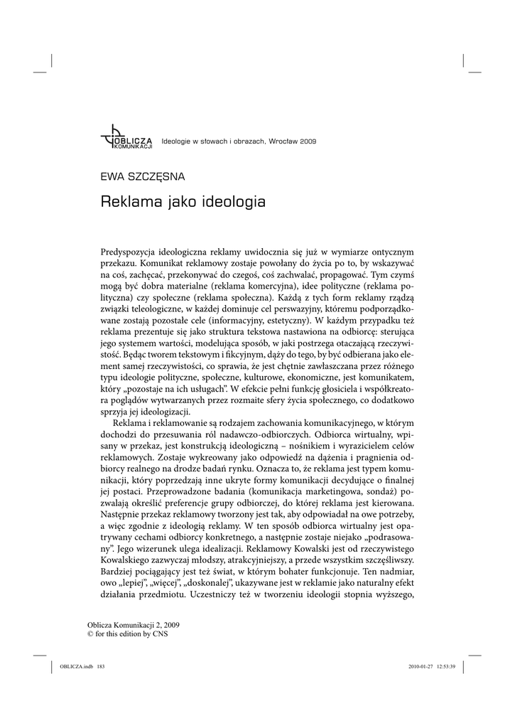 Ideologie w słowach i obrazach, Wrocław 2009 EWA SZCZĘSNA Reklama jako ideologia Predyspozycja ideologiczna reklamy uwidocznia się już w wymiarze ontycznym przekazu. Komunikat reklamowy zostaje powołany do życia po to, by wskazywać na coś, zachęcać, przekonywać do czegoś, coś zachwalać, propagować. Tym czymś mogą być dobra materialne (reklama komercyjna), idee polityczne (reklama polityczna) czy społeczne (reklama społeczna). Każdą z tych form reklamy rządzą związki teleologiczne, w każdej dominuje cel perswazyjny, któremu podporządkowane zostają pozostałe cele (informacyjny, estetyczny). W każdym przypadku też reklama prezentuje się jako struktura tekstowa nastawiona na odbiorcę: sterująca jego systemem wartości, modelująca sposób, w jaki postrzega otaczającą rzeczywistość. Będąc tworem tekstowym i fikcyjnym, dąży do tego, by być odbierana jako element samej rzeczywistości, co sprawia, że jest chętnie zawłaszczana przez różnego typu ideologie polityczne, społeczne, kulturowe, ekonomiczne, jest komunikatem, który „pozostaje na ich usługach”. W efekcie pełni funkcję głosiciela i współkreatora poglądów wytwarzanych przez rozmaite sfery życia społecznego, co dodatkowo sprzyja jej ideologizacji. Reklama i reklamowanie są rodzajem zachowania komunikacyjnego, w którym dochodzi do przesuwania ról nadawczo-odbiorczych. Odbiorca wirtualny, wpisany w przekaz, jest konstrukcją ideologiczną – nośnikiem i wyrazicielem celów reklamowych. Zostaje wykreowany jako odpowiedź na dążenia i pragnienia odbiorcy realnego na drodze badań rynku. Oznacza to, że reklama jest typem komunikacji, który poprzedzają inne ukryte formy komunikacji decydujące o finalnej jej postaci. Przeprowadzone badania (komunikacja marketingowa, sondaż) pozwalają określić preferencje grupy odbiorczej, do której reklama jest kierowana. Następnie przekaz reklamowy tworzony jest tak, aby odpowiadał na owe potrzeby, a więc zgodnie z ideologią reklamy. W ten sposób odbiorca wirtualny jest opatrywany cechami odbiorcy konkretnego, a następnie zostaje niejako „podrasowany”. Jego wizerunek ulega idealizacji. Reklamowy Kowalski jest od rzeczywistego Kowalskiego zazwyczaj młodszy, atrakcyjniejszy, a przede wszystkim szczęśliwszy. Bardziej pociągający jest też świat, w którym bohater funkcjonuje. Ten nadmiar, owo „lepiej”, „więcej”, „doskonalej”, ukazywane jest w reklamie jako naturalny efekt działania przedmiotu. Uczestniczy też w tworzeniu ideologii stopnia wyższego, Oblicza Komunikacji 2, 2009 © for this edition by CNS OBLICZA.indb 183 2010-01-27 12:53:39 184 EWA SZCZĘSNA zgodnie z którą warunkiem owego „więcej”, „doskonalej”, „szczęśliwiej” jest nabycie przedmiotu reklamy. Reklama, podobnie jak każda ideologia, tworzy zamknięty, pełny i wyrazisty obraz świata. Dotyczy to zarówno reklamy jako fenomenu kultury współczesnej, jak i poszczególnych przekazów, które mimo że ukazują wycinek kreowanego przez siebie świata, chcą za każdym razem uchodzić za gotową jego propozycję i „receptę” na lepsze życie. Podobnie jak w przypadku innych ideologii, odnaleźć tu można charakterystyczną, składającą się z trzech części strukturę systemu myślowego. Pierwsza część odnosi się do dotychczasowej rzeczywistości, wskazując na jej niedoskonałość w postaci nieobecności reklamowanego przedmiotu, w czym upatruje się przyczyny braku szczęścia; druga dotyczy teraźniejszości, w której pojawienie się przedmiotu reklamy umożliwia zmiany, dlatego jest to czas, w którym należy działać (formuły typu: zrób to teraz, nie czekaj, nareszcie możesz…). Trzecią część stanowi wizja szczęśliwej przyszłości, nad którą czuwa reklamowany przedmiot. Jak każda ideologia, reklama prezentuje też postawę głębokiego przekonania o słuszności głoszonych przez siebie poglądów i ich prawdziwości. Wykreowaną siatkę tez nakłada na zastaną rzeczywistość, dokonując istotnych przesunięć w dotychczasowym sposobie jej funkcjonowania. Jednocześnie ukazuje wykreowany świat jako jedynie słuszny, motywowany pragnieniem szczęścia odbiorcy i jako taki wpisujący się w naturalne dążenia człowieka. Ogromna ilość komunikatów reklamowych, wymienialnych, chwilowych, choć jednocześnie zamieszkujących niemal wszystkie media, uczestniczy w tworzeniu swoistego „programu ideologicznego” reklamy. Jego podstawową cechą jest inwersja aksjologiczna polegająca na nobilitacji przedmiotu reklamy, nadaniu mu statusu bytu szczególnego, wyjątkowego, doskonałego, wyodrębnieniu go spośród pozostałych przedmiotów, określanych jako „wszystkie inne”, „zwykłe”; na uczynieniu go dominantą świata przedstawionego i nośnikiem wartości pożądanych – często wartości wyższych (szczęścia, dobra, piękna); wreszcie na uzależnieniu oceny człowieka od jego postawy wobec tego przedmiotu. Świat podzielony zostaje na dwie skontrastowane części: tę gorszą, mniej doskonałą – bez reklamowanego przedmiotu oraz tę lepszą, doskonalszą – z nim. W przedmiocie zogniskowane zostaje spełnienie wszystkich pragnień odbiorcy, przy czym wszystkie pragnienia to te, które zostały uznane za takie, czy wręcz wykreowane przez reklamę. Pod tym względem ideologia reklamowa nie odbiega niczym od innych ideologii, jak choćby politycznych. Według Kennetha Minogue ideologia jest wyzwaniem dla polityki w imię ideału, w którym wszystkie pragnienia są zaspokojone. Wszystkie, ponieważ wcześniej dla uproszczenia zagadnienia dokonuje się amputacji znacznej ich części, pozostawiając jedynie te, które zostały zaaprobowane przez te ideologię; zwykle nazywa się je „potrzebami” (Minogue 1997: 115). Z tą swoistą tyranią przedmiotu związana jest pochwała konsumpcjonizmu, ukazywanego jako medium wszelkich wartości. Konstytutywną cechą reklamowej ideolog