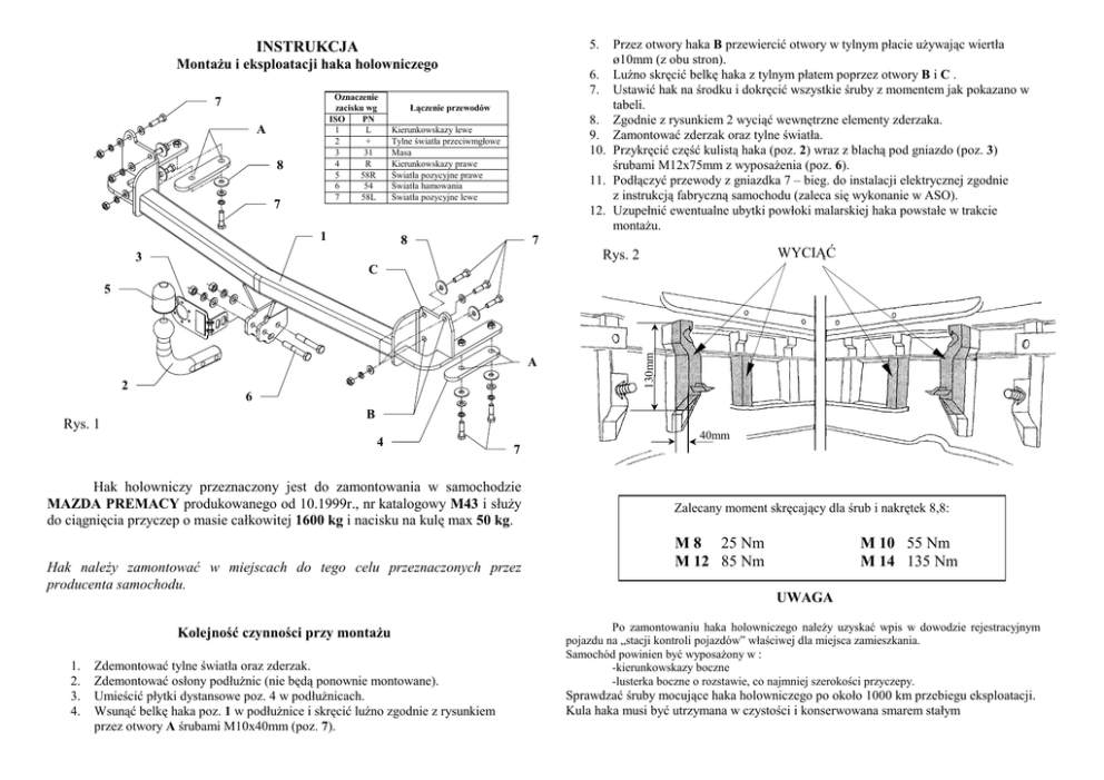 5. Przez otwory haka B przewiercić otwory w tylnym płacie uŜywając wiertła ø10mm (z obu stron). 6. Luźno skręcić belkę haka z tylnym płatem poprzez otwory B i C . 7. Ustawić hak na środku i dokręcić wszystkie śruby z momentem jak pokazano w tabeli. 8. Zgodnie z rysunkiem 2 wyciąć wewnętrzne elementy zderzaka. 9. Zamontować zderzak oraz tylne światła. 10. Przykręcić część kulistą haka (poz. 2) wraz z blachą pod gniazdo (poz. 3) śrubami M12x75mm z wyposaŜenia (poz. 6). 11. Podłączyć przewody z gniazdka 7 – bieg. do instalacji elektrycznej zgodnie z instrukcją fabryczną samochodu (zaleca się wykonanie w ASO). 12. Uzupełnić ewentualne ubytki powłoki malarskiej haka powstałe w trakcie montaŜu. INSTRUKCJA MontaŜu i eksploatacji haka holowniczego Oznaczenie zacisku wg ISO PN 1 L 2 + 3 31 4 R 5 58R 6 54 7 58L 7 A 8 7 1 Łączenie przewodów Kierunkowskazy lewe Tylne światła przeciwmgłowe Masa Kierunkowskazy prawe Światła pozycyjne prawe Światła hamowania Światła pozycyjne lewe 7 8 WYCIĄĆ Rys. 2 3 C A 2 Rys. 1 130mm 5 6 B 4 40mm 7 Hak holowniczy przeznaczony jest do zamontowania w samochodzie MAZDA PREMACY produkowanego od 10.1999r., nr katalogowy M43 i słuŜy do ciągnięcia przyczep o masie całkowitej 1600 kg i nacisku na kulę max 50 kg. Hak naleŜy zamontować w miejscach do tego celu przeznaczonych przez producenta samochodu. Zalecany moment skręcający dla śrub i nakrętek 8,8: M 8 25 Nm M 12 85 Nm M 10 55 Nm M 14 135 Nm UWAGA Kolejność czynności przy montaŜu 1. 2. 3. 4. Zdemontować tylne światła oraz zderzak. Zdemontować osłony podłuŜnic (nie będą ponownie montowane). Umieścić płytki dystansowe poz. 4 w podłuŜnicach. Wsunąć belkę haka poz. 1 w podłuŜnice i skręcić luźno zgodnie z rysunkiem przez otwory A śrubami M10x40mm (poz. 7). Po zamontowaniu haka holowniczego naleŜy uzyskać wpis w dowodzie rejestracyjnym pojazdu na „stacji kontroli pojazdów” właściwej dla miejsca zamieszkania. Samochód powinien być wyposaŜony w : -kierunkowskazy boczne -lusterka boczne o rozstawie, co najmniej szerokości przyczepy. Sprawdzać śruby mocujące haka holowniczego po około 1000 km przebiegu eksploatacji. Kula haka musi być utrzymana w czystości i konserwowana smarem stałym WyposaŜenie haka: PPUH AUTO-HAK S.J. Produkcja Haków Holowniczych Henryk & Zbigniew Nejman 76-200 SŁUPSK ul. Słoneczna 16K tel/fax (059) 8-414-414; 8-414-413 E-mail: [email protected] www. autohak.com.pl Hak holowniczy bez wyposaŜenia elektrycznego Klasa: A50-X Nr kat. M43 Przeznaczony do zamontowania w samochodzie: Producent: MAZDA Model: PREMACY produkowanego od 10.1999r. Dane techniczne: Wartość siły D: 8,4 kN maksymalna masa przyczepy: 1600 kg maksymalny nacisk na kulę: 50 kg Numer homologacji zgodnie z wytycznymi regulaminu EKG/ONZ 55.01: E20-55R-01 1337 KARTA GWARANCYJNA Producent udziela gwarancji niniejszą kartą gwarancyjną na okres 24 miesięcy licząc od dnia zakupu haka holowniczego do samochodu: MAZDA PREMACY produkowanego od 10.1999 r. Data produkcji .............................. Data zakupu.......................................... Zakres gwarancji obejmuje wyłącznie wady jakościowe wynikające z winy producenta. Gwarancja nie obejmuje natomiast uszkodzeń zawinionych przez nabywcę, wynikających z niewłaściwego montaŜu, uŜytkowania lub konserwacji, uszkodzeń mechanicznych, normalnego zuŜycia podczas eksploatacji itp. Gwarancja udzielona na zakupiony towar nie wyłącza, nie ogranicza ani nie zawiesza uprawnień kupującego wynikających z niezgodności towaru z umową. Reklamacje naleŜy zgłaszać w punkcie sprzedaŜy, składając jednocześnie kartę gwarancyjną. Usunięcie "wady" następuje po stwierdzeniu przez punkt sprzedaŜy wspólnie z producentem słuszności złoŜonej reklamacji. Reklamacja powinna być załatwiona w ciągu 14 dni od dnia uznania reklamacji. Karta gwarancyjna jest niewaŜna jeŜeli nie jest wypełniona i podpisana. Data zgłoszenia reklamacji: ................................................................... INFORMACJA WSTĘPNA Hak holowniczy jest skonstruowany zgodnie z zasadami bezpieczeństwa ruchu drogowego. Hak holowniczy jest elementem wpływającym na bezpieczeństwo jazdy i moŜe zostać zainstalowany wyłącznie przez personel wyspecjalizowany. Niedopuszczalne jest dokonywanie jakichkolwiek zmian w konstrukcji haka. Powoduje to wygaśniecie dopuszczenia do stosowania. W przypadku obecności masy izolacyjnej lub osłony podwozia w miejscu przylegania haka, naleŜy ją usunąć. Nieosłonięte miejsca karoserii oraz wywiercone otwory naleŜy pomalować farbą antykorozyjną. Informacjami wiąŜącymi odnośnie wartości obciąŜeń są dane podawane przez producenta samochodu, względnie wartości maksymalnej masy przyczepy oraz maksymalnego nacisku na kulę, przy czym wartości parametrów haka holowniczego nie mogą być przekroczone. Wzór do obliczania wartości siły D: Maks. masa przyczepy [kg] x Masa całkowita samochodu [kg] 9,81 = X + 1000 Maks. masa przyczepy [kg] + Masa całkowita samochodu [kg] + D [kN]