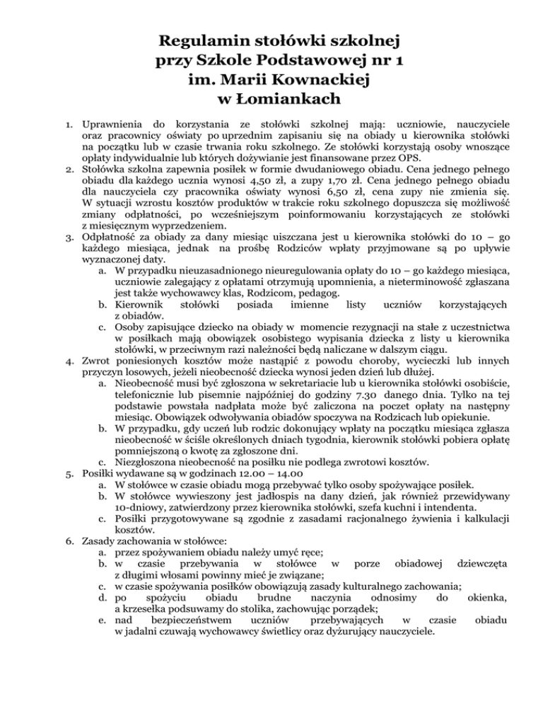 Regulamin stołówki szkolnej przy Szkole Podstawowej nr 1 im. Marii Kownackiej w Łomiankach 1. Uprawnienia do korzystania ze stołówki szkolnej mają: uczniowie, nauczyciele oraz pracownicy oświaty po uprzednim zapisaniu się na obiady u kierownika stołówki na początku lub w czasie trwania roku szkolnego. Ze stołówki korzystają osoby wnoszące opłaty indywidualnie lub których dożywianie jest finansowane przez OPS. 2. Stołówka szkolna zapewnia posiłek w formie dwudaniowego obiadu. Cena jednego pełnego obiadu dla każdego ucznia wynosi 4,50 zł, a zupy 1,70 zł. Cena jednego pełnego obiadu dla nauczyciela czy pracownika oświaty wynosi 6,50 zł, cena zupy nie zmienia się. W sytuacji wzrostu kosztów produktów w trakcie roku szkolnego dopuszcza się możliwość zmiany odpłatności, po wcześniejszym poinformowaniu korzystających ze stołówki z miesięcznym wyprzedzeniem. 3. Odpłatność za obiady za dany miesiąc uiszczana jest u kierownika stołówki do 10 – go każdego miesiąca, jednak na prośbę Rodziców wpłaty przyjmowane są po upływie wyznaczonej daty. a. W przypadku nieuzasadnionego nieuregulowania opłaty do 10 – go każdego miesiąca, uczniowie zalegający z opłatami otrzymują upomnienia, a nieterminowość zgłaszana jest także wychowawcy klas, Rodzicom, pedagog. b. Kierownik stołówki posiada imienne listy uczniów korzystających z obiadów. c. Osoby zapisujące dziecko na obiady w momencie rezygnacji na stałe z uczestnictwa w posiłkach mają obowiązek osobistego wypisania dziecka z listy u kierownika stołówki, w przeciwnym razi należności będą naliczane w dalszym ciągu. 4. Zwrot poniesionych kosztów może nastąpić z powodu choroby, wycieczki lub innych przyczyn losowych, jeżeli nieobecność dziecka wynosi jeden dzień lub dłużej. a. Nieobecność musi być zgłoszona w sekretariacie lub u kierownika stołówki osobiście, telefonicznie lub pisemnie najpóźniej do godziny 7.30 danego dnia. Tylko na tej podstawie powstała nadpłata może być zaliczona na poczet opłaty na następny miesiąc. Obowiązek odwoływania obiadów spoczywa na Rodzicach lub opiekunie. b. W przypadku, gdy uczeń lub rodzic dokonujący wpłaty na początku miesiąca zgłasza nieobecność w ściśle określonych dniach tygodnia, kierownik stołówki pobiera opłatę pomniejszoną o kwotę za zgłoszone dni. c. Niezgłoszona nieobecność na posiłku nie podlega zwrotowi kosztów. 5. Posiłki wydawane są w godzinach 12.00 – 14.00 a. W stołówce w czasie obiadu mogą przebywać tylko osoby spożywające posiłek. b. W stołówce wywieszony jest jadłospis na dany dzień, jak również przewidywany 10-dniowy, zatwierdzony przez kierownika stołówki, szefa kuchni i intendenta. c. Posiłki przygotowywane są zgodnie z zasadami racjonalnego żywienia i kalkulacji kosztów. 6. Zasady zachowania w stołówce: a. przez spożywaniem obiadu należy umyć ręce; b. w czasie przebywania w stołówce w porze obiadowej dziewczęta z długimi włosami powinny mieć je związane; c. w czasie spożywania posiłków obowiązują zasady kulturalnego zachowania; d. po spożyciu obiadu brudne naczynia odnosimy do okienka, a krzesełka podsuwamy do stolika, zachowując porządek; e. nad bezpieczeństwem uczniów przebywających w czasie obiadu w jadalni czuwają wychowawcy świetlicy oraz dyżurujący nauczyciele.
