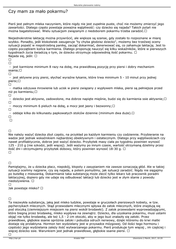 Naturalne planowanie rodziny Czy mam za mało pokarmu? Pierś jest pełnym mleka naczyniem, które nigdy nie jest zupełnie puste, choć nie możemy zmierzyć jego zawartości. Dlatego często powstaje poważna wątpliwość: czy dziecko się najada? Takich pytań nie można bagatelizować. Wielu sytuacjom związanym z niedoborem pokarmu trzeba zaradzić. Niejednokrotnie laktację można przywrócić, ale większe są szanse, gdy zostało to rozpoznane w miarę szybko. Ponadto, jeśli ktokolwiek zasugeruje "ty chyba głodzisz dziecko", możemy bez trzeźwej oceny sytuacji popaść w niepotrzebną panikę, zacząć dokarmiać, denerwować się, co zahamuje laktację. Jest to często początkiem końca karmienia. Dlatego proponuję nauczyć się kilku wskaźników, które w pierwszych tygodniach życia świadczą o tym, że dziecko otrzymuje odpowiednią ilość pokarmu. Najada się, jeśli: - jest karmione minimum 8 razy na dobę, ma prawidłową pozycję przy piersi i dobry mechanizm ssania; - jest aktywne przy piersi, słychać wyraźne łykanie, które trwa minimum 5 - 10 minut przy jednej piersi; - matka odczuwa mrowienie lub ucisk w piersi związany z wypływem mleka, piersi są pełniejsze przed niż po karmieniu; - dziecko jest aktywne, zadowolone, ma dobrze napięte mięśnie, budzi się do karmienia ssie aktywnie; - moczy minimum 6 pieluch na dobę, a mocz jest jasny i bezwonny; - oddaje kilka do kilkunastu papkowatych stolców dziennie (minimum dwa duże). Nie należy ważyć dziecka zbyt często, na przykład po każdym karmieniu czy codziennie. Przybieranie na wadze jest jednak wskaźnikiem najbardziej obiektywnym i ostatecznym. Dlatego przy wątpliwościach czy nawet profilaktycznie, dobrze jest ważyć dziecko. Przybytek masy ciała po tygodniu powinien wynosić 125 - 210 g (nie szkodzi, jeśli więcej). Jeśli ważymy po innym czasie, wartość otrzymaną dzielimy przez ilość dni i otrzymujemy przybytek dobowy, który powinien wynosić 18-30 g. Pamiętajmy, że u dziecka płacz, niepokój, kłopoty z zasypianiem nie zawsze oznaczają głód. Ale w takiej sytuacji oceńmy najpierw, czy się najada, a potem pomyślmy, jak sytuacji zaradzić. Nigdy nie sięgajmy po butelkę z mieszanką. Dokarmianie taka substancją może zlecić tylko lekarz lub pracownik poradni laktacyjnej, dopiero gdy nie udaje się odbudować laktacji lub dziecko jest w złym stanie z powodu niedożywienia. Jak powstaje mleko? Ta niezwykła substancja, jaką jest mleko ludzkie, powstaje w gruczołach piersiowych kobiety, w tzw. pęcherzykach mlecznych. Stąd przewodami mlecznymi spływa do zatok mlecznych, które znajdują się pod otoczką (ciemniejszym miejscem na piersi wokół brodawki). Z zatok przewodami wyprowadzającymi, które biegną przez brodawkę, mleko wypływa na zewnątrz. Dziecko, dla uzyskania pokarmu, musi ustami objąć nie tylko brodawkę, ale też 1,5 - 2 cm otoczki, aby w jego buzi znalazły się zatoki. Przez prawidłowe, głębokie ssanie opróżnia zatoki i pobudza odruch nerwowy, dzięki któremu do krwi matki dostaje się prolaktyna. Hormon ten wydzielany jest w przysadce mózgowej. Od ilości tego hormonu i częstości jego wydzielania zależy ilość wytwarzanego pokarmu. Pierś produkuje tym więcej , im częściej i więcej dziecko ssie. Warunkiem jest jednak prawidłowe, głębokie ssanie piersi. http://npr.pl/ Kreator PDF Utworzono 2 March, 2017, 10:29 Naturalne planowanie rodziny Istnieje jeszcze drugi odruch nerwowy, zwany odruchem wypływu. Na skutek ssania przysadka kobiety wydziela oksytocynę (hormon ten odpowiedzialny jest też za skurcze macicy w czasie porodu i połogu), która kurczy maleńkie mięśnie wokół przewodów mlecznych, dzięki czemu pokarm może wypływać z piersi. Odruch ten może w ogóle nie zadziałać, jeśli matka przeżywa zmartwienie, jest zdenerwowana, coś ją boli, ma niewygodna pozycję itp. Przystawione do pełnej piersi dziecko nie uzyska z niej pokarmu. Jeśli taki stan przedłuża się, może doprowadzić do zastoju oraz znacznego obniżenia ilości wytwarzanego mleka. Bez względu na wielkość każda pierś wytwarza mleko, jeśli jest skutecznie pobudzana. Prawidłowe ssanie polega na tym, że w ustach dziecka znajduje się brodawka wraz z dużą częścią otoczki; język obejmuje ten fragment piersi od dołu, a pokarm jest "wymasowywany" z zatok mlecznych przez rytmiczny ruch języka, szczęki i żuchwy. Jeśli te warunki nie są spełnione, pierś nie wypełnia całej buzi dziecka, nie działają odruchy nerwowe i dziecko nie uzyskuje pokarmu. takie nieprawidłowe ssanie jest przyczyną wielu kłopotów. Prowadzić może do uszkodzenia brodawek, zastoju pokarmu, obniżenia jego ilości lub zaniku, nieprzybierania dziecka na wadze itp. Matki, które twierdzą, że brakuje im pokarmu, najczęściej źle przystawiają dziecko do piersi. Karmienie to czynność, której uczy się i matka i dziecko, a powodzenia w karmieniu zależy od wyników tej nauki. Jak postępować, aby był pokarm? Każda kobieta, bez względu na to, czy karmiła jej babka, matka, siostra, jest w stanie wykarmić swoje dziecko. Odsetek kobiet, które nie mogą wyprodukować dostatecznej ilości pokarmu, jest minimalny. Warunkiem jest dobre i częste pobudzanie piersi, aby wszystkie odruchy zawiadujące produkcją mleka mogły działać. Karmienia powinny odbywać się według potrzeb dziecka, czyli zawsze wtedy, gdy wykazuje ono objawy głodu (budzi się, płacze, ssie paluszki). Dzieci są oczywiście różne. Jedne zgłaszają się do karmienia co godzinę, inne co dwie, jeszcze inne co trzy. Ważne jest, aby nasze dziecko jadło przynajmniej osiem razy na dobę (łącznie z nocą), choć na ogół karmień jest 10 - 12. Karmienia mogą odbywać się również według potrzeb matki. Bywają noworodki, które budzą się do karmienia 3 - 4 razy na dobę, a to stanowczo za rzadko. Matka powinna wtedy sama budzić dziecko do karmienia, tak aby nie przesypia