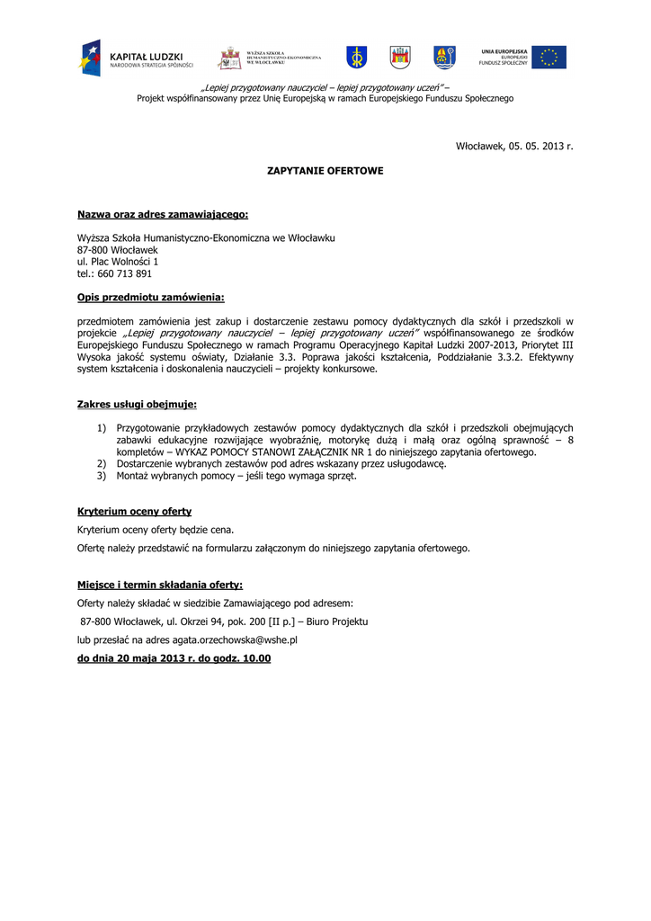 „Lepiej przygotowany nauczyciel – lepiej przygotowany uczeń” – Projekt współfinansowany przez Unię Europejską w ramach Europejskiego Funduszu Społecznego Włocławek, 05. 05. 2013 r. ZAPYTANIE OFERTOWE Nazwa oraz adres zamawiającego: Wyższa Szkoła Humanistyczno-Ekonomiczna we Włocławku 87-800 Włocławek ul. Plac Wolności 1 tel.: 660 713 891 Opis przedmiotu zamówienia: przedmiotem zamówienia jest zakup i dostarczenie zestawu pomocy dydaktycznych dla szkół i przedszkoli w projekcie „Lepiej przygotowany nauczyciel – lepiej przygotowany uczeń” współfinansowanego ze środków Europejskiego Funduszu Społecznego w ramach Programu Operacyjnego Kapitał Ludzki 2007-2013, Priorytet III Wysoka jakość systemu oświaty, Działanie 3.3. Poprawa jakości kształcenia, Poddziałanie 3.3.2. Efektywny system kształcenia i doskonalenia nauczycieli – projekty konkursowe. Zakres usługi obejmuje: 1) 2) 3) Przygotowanie przykładowych zestawów pomocy dydaktycznych dla szkół i przedszkoli obejmujących zabawki edukacyjne rozwijające wyobraźnię, motorykę dużą i małą oraz ogólną sprawność – 8 kompletów – WYKAZ POMOCY STANOWI ZAŁĄCZNIK NR 1 do niniejszego zapytania ofertowego. Dostarczenie wybranych zestawów pod adres wskazany przez usługodawcę. Montaż wybranych pomocy – jeśli tego wymaga sprzęt. Kryterium oceny oferty Kryterium oceny oferty będzie cena. Ofertę należy przedstawić na formularzu załączonym do niniejszego zapytania ofertowego. Miejsce i termin składania oferty: Oferty należy składać w siedzibie Zamawiającego pod adresem: 87-800 Włocławek, ul. Okrzei 94, pok. 200 [II p.] – Biuro Projektu lub przesłać na adres [email protected] do dnia 20 maja 2013 r. do godz. 10.00 „Lepiej przygotowany nauczyciel – lepiej przygotowany uczeń” – Projekt współfinansowany przez Unię Europejską w ramach Europejskiego Funduszu Społecznego Załącznik nr 1 do zapytania ofertowego z dnia 05.05.2013 na zestawy dydaktyczne dla szkół i przedszkoli – (8 placówek). 1. Zabawki: 8 zestawów Lp Nazwa artykułu 1 Zestaw” warzywa” 2 Zestaw „pieczywo” 3 Zestaw do kawy 4 Zestaw „pożywienie na tacy-owoce” 5 Zestaw „pożywienie na tacy” 6 Zestaw „podwieczorek 7 Nakładanki z uchwytami-samochód 8 Zestaw puzzli – pojazdy ratunkowe 9 Puzzle „dzieci z różnych stron świata” 10 Zestaw puzzli –poprawne zachowanie 11 Zestaw puzzli nakładanki – 9 figur gigant 12 Warstwowe puzzle dino 13 Puzzle „cztery pory roku” 14 Zestaw puzzli – zwierzęta z farmy 15 Zestaw puzzli – zwierzęta z Afryki 16 Elektroniczny warsztat 17 Glina rzeźbiarska 18 Pastele suche 19 Auta 20 Klocki drewniane – komplet 21 Klocki drewniane kolor- komplet „Lepiej przygotowany nauczyciel – lepiej przygotowany uczeń” – Projekt współfinansowany przez Unię Europejską w ramach Europejskiego Funduszu Społecznego 22 Hula hop 23 Odkurzacz zabawkowy 24 Mały majsterkowicz 25 Auta pojazdy ratunkowe 26 Zestaw gier planszowych 27 Zestaw „garaż miejski” 28 Zestaw do kawy 29 Zestaw kuchnia małej gospodyni 30 Elektroniczny warsztat 31 Zestaw figur geometrycznych 2. Kącik zabaw 8 zestawów 1 Zestaw dla księżniczki 2 Zestaw warzywniak 3 Wózek z zastawą do herbaty 4 Majsterkowicz 5 Kuchnia 6 Wózek do sprzątania 7 Majsterkowicz – zestaw elektroniczny 8 Zestaw mała gospodyni-wózek do sprzątania 9 Miejski garaż trzypoziomowy 3. Mała motoryka – usprawnienie sprawności dłoni: 8 zestawów 1 Ruletka – kwiaty 3 w 1 2 Przewlekanka „lew” „Lepiej przygotowany nauczyciel – lepiej przygotowany uczeń” – Projekt współfinansowany przez Unię Europejską w ramach Europejskiego Funduszu Społecznego 3 Przewlekanka „jabłko” 4 Labirynt pionowy z kulką 5 Przewlekanka „but” 6 Podrzuć i złap – piłka na patyku 7 Równoważnik „jeżyk’ 4. Duża motoryka – kształtki rehabilitacyjne: 8 zestawów 1 Opona 2 Mostek 3 Materac 4 Walec 5 ½ opony 6 Piłka z rogami 7 Trójkącik mały 5. Stymulowanie rozwoju 8 zestawów 1 Multikącik teatralny 6. Zestaw pacynek -8 zestawów „Lepiej przygotowany nauczyciel – lepiej przygotowany uczeń” – Projekt współfinansowany przez Unię Europejską w ramach Europejskiego Funduszu Społecznego Prosimy o przesłanie wyceny usługi na załączonym formularzu do dnia 20 maja 2013 r. do WSHE we Włocławku na adres e-mail: [email protected] lub [email protected], adres korespondencyjny WSHE ul. Okrzei 94, pol. 200 (IIp), 87-800 Włocławek, lub też złożyć osobiście w Biurze Projektu adres jw. Włocławek, dnia ………………………………. Nazwa i adres firmy oferenta WYCENA USŁUGI ZESTAWY POMOCY DYDAKTYCZNYCH DLA SZKÓŁ I PRZEDSZKOLI . W odpowiedzi na zapytanie dotyczące ofertowe dotyczące zestawów pomocy dydaktycznych dla szkół i przedszkoli obejmujące zabawki edukacyjne rozwijające wyobraźnię, motorykę dużą i małą oraz ogólną sprawność w ilości 8 kompletów, w odniesieniu do parametrów usługi informujemy, że: 1 Zabawki 8 kompletów 2 Kącik zabaw 8 kompletów 3 Mała motoryka – usprawnienie sprawności dłoni 8 kompletów 4 Duża motoryka – kształtki rehabilitacyjne 8 kompletów 5 Stymulowanie rozwoju 8 kompletów 6 Stymulowanie rozwoju 8 kompletów Cena netto Cena brutto Razem Cena netto naszej oferty wynosi …………………………………… Cena brutto naszej oferty wynosi ………………………………….. Dostarczamy wybrane towar pod adres wskazany przez usługodawcę, oraz dokonujemy montażu wybranych pomocy, jeśli tego wymaga sprzęt. W załączeniu przesyłamy również oświadczenie o braku powiązań kapitałowych i osobowych z Zamawiającym. ……………………………………………. Podpis i pieczątka oferenta