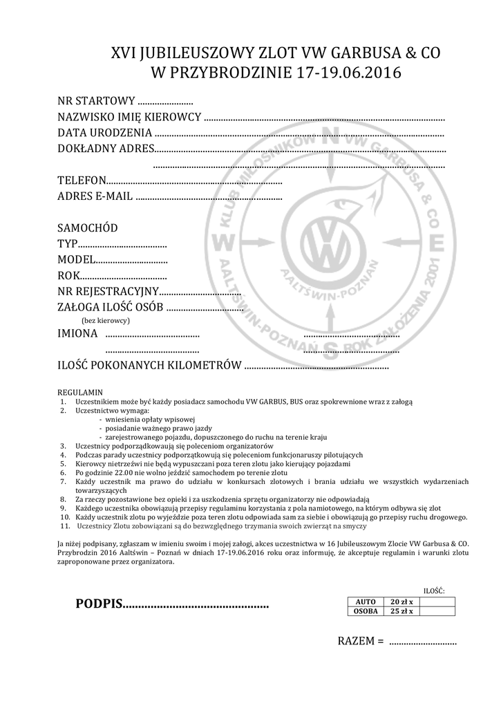 XVI JUBILEUSZOWY ZLOT VW GARBUSA & CO W PRZYBRODZINIE 17-‐19.06.2016 NR STARTOWY ....................... NAZWISKO IMIĘ KIEROWCY .................................................................................................... DATA URODZENIA ........................................................................................................................ DOKŁADNY ADRES......................................................................................................................... ......................................................................................................................... TELEFON......................................................................... ADRES E-‐MAIL ............................................................. SAMOCHÓD TYP..................................... MODEL.............................. ROK.................................... NR REJESTRACYJNY.................................. ZAŁOGA ILOŚĆ OSÓB ................................ (bez kierowcy) IMIONA ....................................... ........................................ ....................................... ........................................ ILOŚĆ POKONANYCH KILOMETRÓW ............................................................ REGULAMIN 1. 2. Uczestnikiem może być każdy posiadacz samochodu VW GARBUS, BUS oraz spokrewnione wraz z załogą Uczestnictwo wymaga: -‐ wniesienia opłaty wpisowej -‐ posiadanie ważnego prawo jazdy -‐ zarejestrowanego pojazdu, dopuszczonego do ruchu na terenie kraju 3. Uczestnicy podporządkowaują się poleceniom organizatorów 4. Podczas parady uczestnicy podporzątkowują się poleceniom funkcjonaruszy pilotujących 5. Kierowcy nietrzeźwi nie będą wypuszczani poza teren zlotu jako kierujący pojazdami 6. Po godzinie 22.00 nie wolno jeździć samochodem po terenie zlotu 7. Każdy uczestnik ma prawo do udziału w konkursach zlotowych i brania udziału we wszystkich wydarzeniach towarzyszących 8. Za rzeczy pozostawione bez opieki i za uszkodzenia sprzętu organizatorzy nie odpowiadają 9. Każdego uczestnika obowiązują przepisy regulaminu korzystania z pola namiotowego, na którym odbywa się zlot 10. Każdy uczestnik zlotu po wyjeździe poza teren zlotu odpowiada sam za siebie i obowiązują go przepisy ruchu drogowego. 11. Uczestnicy Zlotu zobowiązani są do bezwzględnego trzymania swoich zwierząt na smyczy Ja niżej podpisany, zgłaszam w imieniu swoim i mojej załogi, akces uczestnictwa w 16 Jubileuszowym Zlocie VW Garbusa & CO. Przybrodzin 2016 Aaltświn – Poznań w dniach 17-‐19.06.2016 roku oraz informuję, że akceptuje regulamin i warunki zlotu zaproponowane przez organizatora. PODPIS............................................... AUTO OSOBA ILOŚĆ: 20 zł x 25 zł x RAZEM = ............................