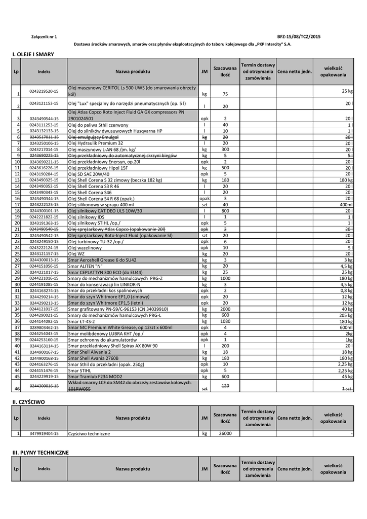 BFZ-15/08/TCZ/2015 Załącznik nr 1 Dostawa środków smarowych, smarów oraz płynów eksploatacyjnych do taboru kolejowego dla „PKP Intercity“ S.A. I. OLEJE I SMARY Lp 1 2 3 4 5 6 7 8 9 10 11 12 13 14 15 16 17 18 19 20 21 22 23 24 25 26 27 28 29 30 31 32 33 34 35 36 37 38 39 40 41 42 43 44 45 46 Indeks Nazwa produktu JM Szacowana Ilość 0243219520-15 Olej maszynowy CERITOL Ls 500 UWS (do smarowania obrzeży kół) kg 75 0243121153-15 Olej "Lux" specjalny do narzędzi pneumatycznych (op. 5 l) l 20 opk l l kg l kg kg opk kg opk kg l l opak szt l l opk opk szt opk opk kg kg kg kg kg kg opk opk opk kg kg kg opk opk opk l kg kg opk opk kg 2 40 10 20 20 300 5 2 500 5 180 20 20 3 40 800 1 5 2 20 6 10 20 3 20 25 1000 3 2 20 20 2000 600 1080 4 4 1 200 18 180 10 5 600 0243490544-15 0243111253-15 0243132133-15 0243517011-15 0243250106-15 0243217014-15 0243690225-15 0243690221-15 0243616226-15 0243190284-15 0243490325-15 0243490352-15 0243490343-15 0243490344-15 0243222125-15 0244300101-15 0242221822-15 0243191363-15 0243490540-15 0243490542-15 0243249150-15 0243222124-15 0243121157-15 0244300013-15 0244151056-15 0244221017-15 0244221016-15 0244191085-15 0244163274-15 0244290214-15 0244290213-15 0244121017-15 0244290021-15 0244144092-15 0289803462-15 0244254043-15 0244253160-15 0244163114-15 0244900167-15 0244900168-15 0244163276-15 0244151476-15 0244229919-15 0244300016-15 Olej Atlas Copco Roto Inject Fluid GA GX compressors PN 2901024501 Olej do paliwa Sthil czerwony Olej do silników dwusuwowych Husqvarna HP Olej emulgujący Emulgol Olej Hydraulik Premium 32 Olej maszynowy L-AN 68 /jm. kg/ Olej przekładniowy do automatycznej skrzyni biegów Olej przekładniowy Enersyn, op.20l Olej przekładniowy Hipol 15F Olej SD SAE 20W/40 Olej Shell Corena S 32 zimowy (beczka 182 kg) Olej Shell Corena S3 R 46 Olej Shell Corena S46 Olej Shell Corena S4 R 68 (opak.) Olej silikonowy w sprayu 400 ml Olej silnikowy CAT DEO ULS 10W/30 Olej silnikowy IDS Olej silnikowy STIHL /op./ Olej sprężarkowy Atlas Copco (opakowanie 20l) Olej sprężarkowy Roto-Inject Fluid (opakowanie 5l) Olej turbinowy TU-32 /op./ Olej wazelinowy Olej WZ Smar Aeroshell Grease 6 do SU42 Smar ALITEN "N" Smar CEPLATTYN 300 ECO (do EU44) Smary do mechanizmów hamulcowych PRG-Z Smar do konserawacji lin LINKOR-N Smar do przekładni kos spalinowych Smar do szyn Whitmore EP1,0 (zimowy) Smar do szyn Whitmore EP1,5 (letni) Smar grafitowany PN-59/C-96153 (CN 34039910) Smary do mechanizmów hamulcowych PRG-L Smar ŁT-4S-2 Smar MC Premium White Grease, op.12szt x 600ml Smar molibdenowy LUBRA KHT /op./ Smar ochronny do akumulatorów Smar przekladniowy Shell Spirax AX 80W 90 Smar Shell Alwania 2 Smar Shell Avania 2760B Smar Sthil do przekładni (opak. 250g) Smar STIHL Smar Tramlub F234 MOD2 Wkład smarny LCF do SM42 do obrzeży zestawów kołowych 101RW055 szt Termin dostawy od otrzymania Cena netto jedn. zamówienia wielkość opakowania 25 kg 20 l 20 l 1l 1l 20 l 20 l 20 l 5l 20 l 20 l 20 l 180 kg 20 l 20 l 20 l 400ml 20 l 1l 1l 20 l 20 l 20 l 5l 20 l 3 kg 4,5 kg 25 kg 180 kg 4,5 kg 0,8 kg 12 kg 12 kg 40 kg 205 kg 180 kg 600ml 2kg 1kg 20 l 18 kg 180 kg 2,25 kg 2,25 kg 45 kg 120 1 szt. II. CZYŚCIWO Lp 1 Nazwa produktu Indeks 3479919404-15 Czyściwo techniczne JM Szacowana Ilość kg 26000 JM Szacowana Ilość Termin dostawy od otrzymania Cena netto jedn. zamówienia wielkość opakowania - III. PŁYNY TECHNICZNE Lp Indeks Nazwa produktu Termin dostawy od otrzymania Cena netto jedn. zamówienia wielkość opakowania 1 2 3 4 5 6 7 8 9 10 11 12 13 14 15 16 17 18 19 20 21 22 23 24 25 26 27 28 29 30 31 32 33 34 35 36 37 38 39 40 41 42 43 44 45 46 47 48 49 50 51 0246142026-15 0246120022-15 0244212011-15 0246321047-15 0289803465-15 0244300100-15 0289801493-15 0289801448-15 2023215505-15 2023215514-15 0289802064-15 0289802107-15 0289803712-15 0289803482-15 Benzyna apteczna /litr/ Benzyna ekstrakcyjna Denaturat (92% alkohol) Nafta Odtłuszczacz do elektroniki Płyn chłodniczy CAT ELC Premix 50/50 Płyn chłodzący Emulgol ES-12 Płyn do chłodnic Płyn do spryskiwaczy letni Płyn do spryskiwaczy zimowy (-30 C) (baza alkohol) Płyn hamulcowy DA-1 op 5l Płyn hamulcowy R-3 Płyn konserwująco-odrdzewiający typu WD40 Preparat czyszczący dla elektroniki typu TUNER 600 0289803464-15 Preparat czyszczący do styków elektrycznych typu KONTAKT 60 0289803795-15 0289803794-15 Preparat do odtłuszczania typu ORASOLV M1/B60 Preparat do osadzania śrub Preparat przeciwzatarciowy i smarujący CLEAN THREADZ op.12x450ml 0289803463-15 0289803461-15 Środek smarująco-penetrujący Seize Easy, op.12szt x 400ml 0289803460-15 Zmywacz przemysłowy zielony BH HDHC AV op.4 szt x 4,5l 1223593207-15 1223593523-15 1223593525-15 1223593527-15 1223593527-15 1223593527-15 1223593527-15 1289494304-15 1323525038-15 2023421033-15 2023525038-15 1223593527-15 1223593527-15 1236461063-15 1236911041-15 1236911043-15 1236911099-15 1246336012-15 1246336012-15 1262911012-15 1262911012-15 1262990203-15 1262990203-15 1262990409-15 1262990427-15 1289300007-15 1289494304-15 1289900651-15 1313413016-15 1317914020-15 9001067508-15 l l l l opk l l l l l opk l szt opk 200 2000 10000 1000 10 200 10 160 16000 12000 5 20 1000 10 20 l 20 l 20 l 20 l 400ml 20 l 20 l 20 l 10 l 10 l 5l 20 l 400ml 400ml opk l opk 100 40 6 400ml 20 50g opk opk 4 op.12x450ml 2 op.12szt x 400ml 6 opk l 8100 Płyn odladzajacy Pluspremix, Glikol opk 60 Płyn Feinkontakt - przewodnośc styków l 60 Płyn ELEKTRORENIGER EL 02 mycie maszyn szaf opk 20 Preparat Elctronic - elektronicy szt 10 Spray do wypierania wilgoci MULTI SUPER 5 Środek do wypierania wilgoci spray 300ml opk 42 l 30 Środek SUPER - MULTI I wypieranie wilgoci 20 Środek ROSTLOSER - silny odrdzewiacz ( zamki, sruby, podwozia )opk szt 30 Odmrażacz do zamków w aerozolu l 50 Płyn RM110 - Karcher Odmrażacz w aerozolu opk 265 Płyn odladzający Koncentrat l 12000 Preparat do czyszczenia elektroniki opak. 20 Klej Poxipol szt. 235 Klej cyjano - akrylowy (np. kropelka) 