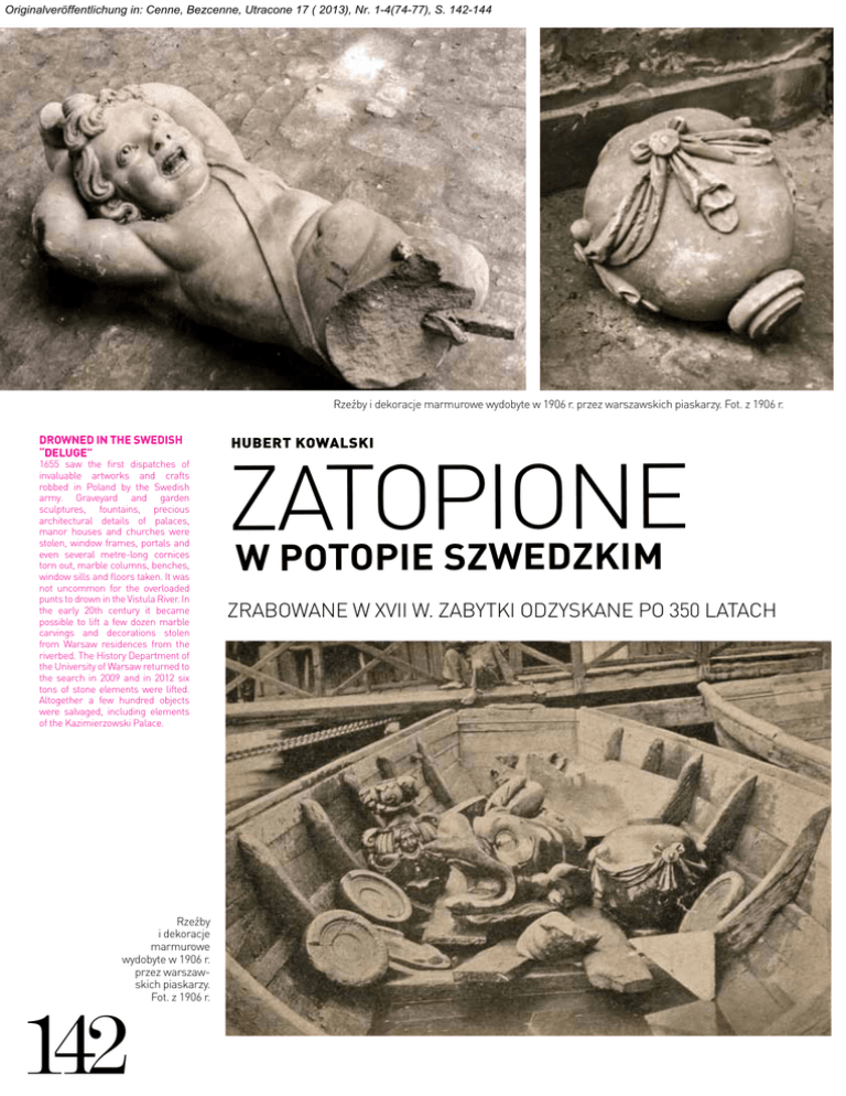 Originalveröffentlichung in: Cenne, Bezcenne, Utracone 17 ( 2013), Nr. 1-4(74-77), S. 142-144 Rzeźby i dekoracje marmurowe wydobyte w 1906 r. przez warszawskich piaskarzy. Fot. z 1906 r. DROWNED IN THE SWEDISH “DELUGE” 1655 saw the first dispatches of invaluable artworks and crafts robbed in Poland by the Swedish army. Graveyard and garden sculptures, fountains, precious architectural details of palaces, manor houses and churches were stolen, window frames, portals and even several metre-long cornices torn out, marble columns, benches, window sills and floors taken. It was not uncommon for the overloaded punts to drown in the Vistula River. In the early 20th century it became possible to lift a few dozen marble carvings and decorations stolen from Warsaw residences from the riverbed. The History Department of the University of Warsaw returned to the search in 2009 and in 2012 six tons of stone elements were lifted. Altogether a few hundred objects were salvaged, including elements of the Kazimierzowski Palace. Rzeźby i dekoracje marmurowe wydobyte w 1906 r. przez warszawskich piaskarzy. Fot. z 1906 r. 142 Hubert Kowalski E PION ZATO W Potopie szwedzkim Zrabowane w XVII w. zabytki odzyskane po 350 latach Herb Wazowski (snopek). Fot. Hubert Kowalski (2011) N Marmurowy delfin wydobyty w 1906 r., pocztówka z XX w. a przestrzeni stuleci z naszego kraju zrabowano dzieła sztuki, archiwalia i księgozbiory, których liczby należy podawać w milionach. W naszej historii jednak nic wcześniej ani później nie dokonało w kulturze takich zniszczeń, jak potop szwedzki. Rabunek osiągnął podczas tych kilku lat drugiej połowy XVII w. skalę, do której już nigdy później najeźdźcy plądrujący nasz kraj nie byli w stanie się zbliżyć. Szwedzi, wraz z wojskami najemnymi, rabowali nie tylko kosztowności, dokumenty, obrazy czy rzeźby. Ich łupem padały całe budowle. Warszawa utraciła w niespełna dwa lata kilka tysięcy ton marmurów zdobiących reprezentacyjne gmachy. Z miasta zniknęły konstrukcje ważące po kilkaset ton. Szkuty, które wypływały w kierunku Gdańska z portu w Warszawie, zabierały na pokład kilkadziesiąt ton ładunku. W sierpniu 1656 r. Piotr des Noyers, sekretarz Marii Ludwiki, napisał: „Szwedzi znowu zrabowali Warszawę i 6 ogromnych statków naładowali samemi łupami”. Dokładnej liczby jednostek pływających, które transportowały zrabowane przedmioty, dziś nie znamy. Wiemy natomiast, że przynajmniej część z nich nigdy nie dopłynęła do portu przeładunkowego, a potem dalej do Szwecji. Kilka szkut zostało zatopionych przez uciekających w popłochu Szwedów tuż pod Warszawą. Ze względu na niski stan wody w Wiśle, niektóre z nich zostały podpalone, by w ten sposób uniemożliwić sprowadzenie ich do miasta. Widok osiadłych na mieliźnie i płonących statków nie uszedł uwadze mieszkańców Warszawy. We wrześniu 1656 r. burmistrz Starej Warszawy poinformował o całym wydarzeniu Jana Kazimierza. W odpowiedzi do rady miasta król zwrócił się z prośbą o odnalezienie zatopionych łupów. W ten sposób dokładnie 357 lat temu rozpoczęto poszukiwania zrabowanych i zatopionych w rzece marmurowych dekoracji rzeźbiarskich. Z końcem października tenże sekretarz królowej napisał: „[…] myśmy z tego, co oni zatopili, część wydobyli, mianowicie śliczne i wielkie kolumny jaspisowe, armaty i rzeźby starożytne”. Do dalszych poszukiwań przystąpiono prawdopodobnie po zakończeniu wojny. Dokument zachowany w Archiwum Głównym Akt Dawnych potwierdza przynajmniej jedną próbę odnalezienia zatopionych marmurów z 1663 r. Przez kolejne ponad dwieście lat nikomu nie udało się odnaleźć reszty ładunku. Dopiero w 1906 r. piaskarze warszawscy, pracujący pod kierownictwem inżyniera Heliodora Nieciengiewicza, odnaleźli kilka ton marmurowych dekoracji, w tym rzeźbę delfina i Putta z karraryjskiego marmuru. Dalsze poszukiwania zostały zakazane ze względu na prowadzenie prac wydobywczych zbyt blisko Cytadeli. Poszukującym udało się wówczas wydobyć następujące obiekty*: • rzeźba „amorka dzierżącego maczugę, wykutego z marmuru białego”, • „cztery kroksztyny z marmuru ciemnego”, • „dwie podstawy marmurowe pod filary”, • „trzy słupy wysokie”, • „cztery ozdobne wazony marmurowe”, • „pięć pater kamiennych pod kwiaty”, • „kilkanaście płytek marmurowych białych i czarnych z posadzki”, • „tarcza marmurowa”, • „narożnik arkady, również z marmuru, z koronami królewskimi i herbami Wazów”, • „duża kula żelazna”, • „kilkanaście odłamów marmuru, które, złożone w całość, tworzą basen wodotrysku”, Rzeźbiarskie i architektoniczne elementy wydobyte z dna Wisły. Fot. Hubert Kowalski (2012) 143 • rzeźba „delfina, wykutego z jednej bryły szarego marmuru z niebieskawemi żyłkami”, • „kilka innych przedmiotów marmurowych, ogółem jedenaście sztuk”, • „kilka kręgów kamiennych z ołowianemi od spodu otworami do umocowania”, • „odłamy olbrzymiej muszli”, • „odłam biodra czy nogi z pięknego marmuru białego”, • „trójkątna tafla z posadzki marmurowej”, • „skrzydło orła […] sam orzeł przy wydobywaniu z dna Wisły, ze względu na swój ciężar urwał się z liny i poszedł ponownie na dno”, • trzy rozety marmurowe, • „kilkanaście dużych i małych kul armatnich”. W 2009 r. poszukiwania zrabowanych zabytków zainicjowane zostały na Wydziale Historycznym Uniwersytetu Warszawskiego. Dwuletnie prace doprowadziły w 2011 r. do odzyskania ponad 6 ton obiektów – głównie fragmentów dekoracji rzeźbiarskich oraz elementów konstrukcyjnych. Pośród 99 obiektów znalazły się m.in.: obramienie okienne składające się ośmiu sztuk; fragmenty arkad (19 sztuk), niektóre z ołowianymi zaczepami; ława; nadproże ważące 720 kilogramów; przyłucze archiwolty arkady z rzeźbionym 