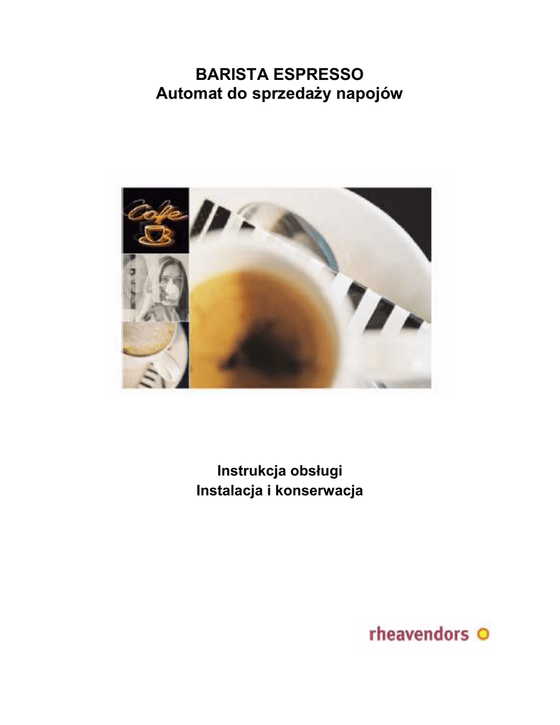 BARISTA ESPRESSO Automat do sprzedaŜy napojów Instrukcja obsługi Instalacja i konserwacja 2 Spis treści: 1. Dane techniczne.....................................................................................................6 2. Wstęp......................................................................................................................6 3. Opis urządzenia......................................................................................................8 4. Wskazówki dla instalatora.......................................................................................9 5. Podstawowe zasady funkcjonowania....................................................................10 6. Transport...............................................................................................................10 7. Rozpakowywanie..................................................................................................11 8. Ustawianie.............................................................................................................11 9. Przyłączenie do sieci zasilającej w wodę i do zasilania elektrycznego.................12 10. Uruchamianie i wyłączanie urządzenia.................................................................14 11. Rozruch urządzenia..............................................................................................15 12. Programowanie urządzenia..................................................................................20 13. Instalacja neonu na drzwiach................................................................................32 14. Czyszczenie i uzupełnianie produktów.................................................................33 15. Chwilowe wycofanie urządzenia z uŜytku.............................................................34 16. Wycofanie urządzenia z uŜytku.............................................................................38 17. Dalsze porady dla uŜytkownika.............................................................................38 18. Wykrywanie i usuwanie usterek...........................................................................39 3 1. Dane techniczne Wymiary Wysokość Szerokość Głębokość 620 mm 295 mm 455 mm Waga Około 30 kg Przyłączenie do sieci zasilającej w wodę Ciśnienie wlotu wody miedzy 0,01 Mpa (1 bar) i 0,08 Mpa (8 bar); Gwint zewnętrzny 3/4" (plus redukcja wewnętrzny 3/8”) Przyłączenie do zasilania elektrycznego 230 V ~ 50 Hz; ZuŜycie energii między 1500 W a 3300 W, w zaleŜności od wersji. Poziom hałasu < 70 dB 1.1 Prawa autorskie Rhea Vendors Spółka z o.o.~Wszelkie prawa zastrzeŜone Ten dokument zawiera informacje poufne, które są własnością Rh ea Vendors Spółka z o.o. Zawartość tego dokumentu nie moŜe być przekazywana osobom trzecim, kopiowana czy powielana w jakikolwiek sposób, bez wcześniejszej pisemnej zgody Rhea Vendors Spółka z o.o. UŜycie, powielanie lub ujawnienie informacji technicznych zawartych w tym dokumencie moŜe być przedmiotem ochrony prawnej Rhea Vendors Spółka z o.o, via Trieste 49, I-21042 Caronno Pertusella (VA), Włochy. Instrukcja obsługi. Instalacja i konserwacja automatu do sprzedaŜy napojów BARISTA PB OSTRZEśENIE Ta naklejka ostrzegająca znajduje się koło numeru seryjnego wewnątrz urządzenia. Przed instalacją i rozpoczęciem uŜywania urządzenia naleŜy zapoznać się uwaŜnie z informacjami zawartymi w niniejszej instrukcji obsługi. 4 2.Wstęp 2.1 Powitanie Gratulujemy wyboru automatu do sprzedaŜy napojów firmy Rhea Vendors. To urządzenie zostało zaprojektowane przez ekspertów i wyprodukowane zgodnie z wysokimi standardami jakości, co od zawsze charakteryzuje wszystkie wyroby firmy Rhea Vendors. Niniejsza instrukcja obsługi pozwoli poznać lepiej to urządzenie. Zalecamy przeczytanie instrukcji z naleŜytą uwagą i przestrzeganie zasad podanych w niej. Niniejsza instrukcja zawiera wszystkie informacje dotyczące uzupełniania asortymentu oraz czyszczenia urządzenia. Zawiera równieŜ informacje przeznaczone dla personelu technicznego, dotyczące bardziej skomplikowanych czynności konserwacyjnych. Łatwo odnaleźć strony wskazujące przygotowanie techniczne uŜytkownika, do którego są skierowane: Tekst na szarym tle: przeznaczony jest dla kaŜdej osoby mającej dostęp do wnętrza automatu sprzedającego napoje. Te strony zawierają wstęp, ogólne informacje oraz sekcje dotyczące uzupełniania asortymentu oraz rutynowego czyszczenia. 5 Tekst na białym tle: przeznaczony jest dla wykwalifikowanego personelu technicznego. Dotyczy wszelkich czynności związanych z instalacją, regulacją oraz czyszczeniem poszczególnych elementów, jak równieŜ serwisowania. Wszystkie informacje zawarte w instrukcji mają na celu uzyskanie jak najlepszych osiągów urządzenia. Instrukcja jest nieodłączną częścią urządzenia . W przypadku zagubienia lub zniszczenia instrukcji moŜna uzyskać dodatkową kopię po dostarczeniu producentowi danych identyfikacyjnych urządzenia, które znajdują się na naklejce identyfikacyjnej. Rhea Vendors dąŜy do wprowadzania ulepszeń technicznych w swoich produktach, dlatego teŜ zastrzegamy sobie prawo do ulepszania przyszłych produktów (oraz zawartości przyszłych instrukcji obsługi) bez wcześniejszego ostrzeŜenia oraz bez obowiązku aktualizowania produktów na rynku. Dział techniczny Rhea Vendors jest do Państwa dyspozycji i chętnie udzieli wszelkich innych informacji pod numerem telefonu lub faksu: Tel. +39 02 966551 Faks +39 02 96655086. MoŜna równieŜ kontaktować się przy pomocy poczty elektronicznej. Numer skrzynki to [email protected]. Informacje są równieŜ dostępne na stronie internetowej www.rheavendors.com. Aby skrócić czas odpowiedzi na Państwa pytanie, naleŜy podać: wszelkie informacje, które znajdują się na naklejce z numerem seryjnym. UWAGA: Rhea Vendors nie jest odpowiedzialna za jakiekolwiek