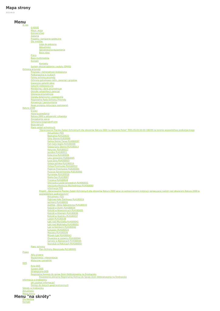Mapa strony 2015-06-03 Menu O nas O RDOŚ Misja i wizja Kierownictwo Zadania Projekty i kampanie społeczne Dla mediów Loga do pobrania Aktualności Sprostowania-wyjasnienia Baza zdjęć Praca Baza multimediów Kontakt Kontakty System ekozarządzania i audytu (EMAS) Ochrona przyrody Przyroda i różnorodność biologiczna Podkarpackie w liczbach Formy ochrony przyrody Ochrona gatunkowa roślin, zwierząt i grzybów Inwazyjne gatunki obce Gatunki niebezpieczne Monitoring i dane przyrodnicze Ośrodki rehabilitacji zwierząt Edukacja przyrodnicza Ogrody botaniczne i zoologiczne Regionalna Rada Ochrony Przyrody Konwencje i porozumienia Nowe przepisy dotyczące zadrzewień Natura 2000 O sieci Historia powstania Natura 2000 a aktywność człowieka Zarządzanie siecią Seminaria biogeograficzne Baza danych Plany zadań ochronnych "Opracowanie Planów Zadań Ochronnych dla obszarów Natura 2000 na obszarze Polski" POIS.05.03.00-00-186/09 na terenie województwa podkarpackiego Aktualności PZO Bednarka PLH120033 Góry Słonne PLB18000 Dolina Dolnej Tanwi PLH060097 Fort Salis Soglio PLH180008 Ostoja Góry Słonne PLH180013 Horyniec PLH180017 Jasiołka PLH180011 Kołacznia PLH180006 Lasy Janowskie PLB060005 Łysa Góra PLH180015 Ostoja Jaśliska PLH180014 Ostoja Przemyska PLH180012 Pogórze Przemyskie PLB180001 Puszcza Sandomierska PLB180005 Rymanów PLH180016 Rzeka San PLH18007 Trzciana PLH180018 Uroczyska Lasów Janowskich PLH060031 Uroczyska Roztocza Wschodniego PLH060093 Informacje PZO Projekt ,,Opracowanie Planów Zadań Ochronnych dla obszarów Natura 2000 wraz ze wzmocnieniem instytucji sprawującej nadzór nad obszarami Natura 2000 w województwie podkarpackim” Aktualności PZO Dąbrowa koło Zaklikowa PLH180019 Jaćmierz PLH180032 Józefów - Wola Dębowiecka PLH180033 Kościół w Dydni PLH180034 Kościół w Nowosielcach PLH180035 Kościół w Równem PLH180036 Kościół w Skalniku PLH180037 Ladzin PLH180038 Łąki nad Młynówką PLH180041 Łąki nad Wojkówką PLH180051 Łąki w Komborni PLH180042 Łukawiec PLH180024 Moczary PLH180026 Mrowle Łąki PLH180043 Osuwiska w Lipowicy PLH180044 Sanisko w Bykowcach PLH180045 Starodub w Pełkiniach PLH180050 Plany ochrony Plan Ochrony Bieszczady PLC180001 Prawo Akty prawne Wyjaśnienia i interpretacje Wytyczne i poradniki OOŚ Rola OOŚ System OOŚ Strategiczna OOŚ Regionalna Komisja do spraw Ocen Oddziaływania na Środowisko Posiedzenie plenarne Regionalnej Komisji do Spraw Ocen Oddziaływania na Środowisko Informacja o środowisku Jak uzyskać informację? Dostęp do danych geoprzestrzennych Szkody w środowisku Aktualności Mapa strony Menu "na skróty" Dla Mediów Kontakt Aktualności Warsztaty fitosocjologiczne w Regionalnej Dyrekcji Ochrony Środowiska w Rzeszowie Wizja poligonu wojskowego w Nowej Dębie Budowa zbiornika Góra Ropczycka Wpływ człowieka na florę i faunę Karpat Międzynarodowa Konferencja Międzynarodowy Rezerwat Biosfery "Karpaty Wschodnie" Prace nad planem ochrony dla Bieszczadów Karmienie rzeki San odtworzeniem tarlisk ryb Nietoperze w Nowosielcach Aktualizacja planów gospodarowania wodami na obszarach dorzeczy Skuteczna ochrona niedźwiedzi Zmiana numeru rachunku opłaty skarbowej Uratowano osłabionego bielika Odsłaniamy Prządki Opracowanie planów zadań ochronnych w województwie podkarpackim V Ogólnopolski Konkurs Fotograficzny Postępowanie w sprawie transgranicznego oddziaływania na środowisko O wpływie planowanych przedsięwzięć na środowisko naturalne Prace nad podkarpackimi planami zadań ochronnych Postanowienie w sprawie drogi ekspresowej S19 Kolejne rozstrzygnięcie w sprawie Autostrady A4 To nie bobry były sprawcą Ochrona gospodarstw przed aktywnością zwierząt chronionych Budowa polsko-słowackiego gazociągu 1000 Rajd rowerowy samorządowców Wizja terenowa na granicy polsko-słowackiej O udostępnieniu rezerwatu Prządki Wyróżnienie dla Regionalnego Dyrektora Ochrony Środowiska w Rzeszowie Restytucja wawrzynka główkowego na Podkarpaciu Ochrona torfowisk alkalicznych w południowej Polsce Tablice w rezerwacie Prządki Rzeszowski Zlot Owadów Piknik Ekologiczny w Lubaczowie Jest decyzja środowiskowa dla S19 Zielone światło dla rozbudowy drogi nr 869 Plany zadań ochronnych dla podkarpackich obszarów Natura 2000 Plany zadań ochronnych dla obszarów Natura 2000 na Podkarpaciu Pomoc podkarpackim gospodarstwom i hodowlom Ochrona czynna w podkarpackich rezerwatach przyrody Wojciech Wdowik Zastępcą Regionalnego Dyrektora Ochrony Środowiska w Rzeszowie Ochrona podkarpackich obszarów Natura 2000 Nowy dom małej niedźwiedzicy Europejski Tydzień Zrównoważonego Rozwoju na Podkarpaciu Ochrona Ostoi Karpackiej Fauny Puszczańskiej Nowe Plany Zadań Ochronnych w województwie podkarpackim Wojciech Wdowik Regionalnym Dyrektorem Ochrony Środowiska w Rzeszowie Wymiana tablic w podkarpackich rezerwatach Prace nad planem ochrony dla obszaru Natura 2000 Bieszczady Co dalej z bobrami w podkarpackim? Programy małej retencji na Podkarpaciu Zabiegi ochrony czynnej w rezerwacie przyrody Śnieżyca wiosenna w Dwerniczku Decyzja środowiskowa dla rozbudowy wałów na Wiśle i Sanie w województwie podkarpackim Międzynarodowa Konferencja w Bieszczadzkim Parku Narodowym Podkarpacka modliszka Spotkanie w sprawie incydentów z udziałem niedźwiedzi Plany zadań ochronnych dla kolejnych podkarpackich obszarów Natura 2000 Zadania ochronne dla obszaru Lasy Sieniawskie Ochrona czynna w podkarpackich rezerwatach przyrody Kolejne obszary Natura 2000 na Podkarpaciu z planami zadań ochronnych Decyzja środowiskowa dla drogi S19 utrzymana w mocy Zadania ochronne dla obszarów Natura 2000 na Podkarpaciu Dzień Służby Cywilnej Próba rozwiązania problemu szkód bobrowych Zadania ochronne dla kolejnych podkarpackich obszarów Natura 2000 Podsumowanie prac nad planami zadań ochronnych dla obszarów Natura 2000 Podsumowanie podkarpackich planów zadań ochronnych dla obszarów Natura 2000 Pastuch