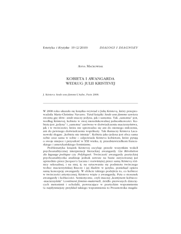 Estetyka i Krytyka 19 (2/2010) D I ALOG I I D I AG NOZY ANNA MAĆKOWIAK KOBIETA I AWANGARDA WEDŁUG JULII KRISTEVEJ J. Kristeva Seule une famme L'Aube, Paris 2008. W 2008 roku ukazała się książka–wywiad z Julią Kristevą, który przeprowadziła Marie-Christine Navarro. Tytuł książki Seule une famme zawiera swoistą grę słów: seule znaczy jedyna, jak i samotna. Tak „samotna” jest, według Kristevej, kobieta w swej nieredukowalnej jednostkowości. Kobieta jest „jedyna” i „samotna” zarówno w doświadczeniu macierzyństwa, jak i w twórczości, która nie sprowadza się ani do niemego milczenia, ani do pewnego doświadczenia wspólnoty. Tak tłumaczy Kristeva Lacanowski slogan: „kobieta nie istnieje”. Kobieta jako jedyna jest obca sama sobie oraz sama w sobie – odpowiada Kristeva kobietom, które pytają o swoje miejsce i przyszłość w XXI wieku, tj. przedstawicielkom francuskiego i amerykańskiego feminizmu. Problematyka książek Kristevej oscyluje przede wszystkim wokół psychoanalitycznej interpretacji literackiej awangardy (La Révolution du laguage poétique czy Polylogue). Twórczość awangardy poetyckiej psychoanalityczka analizuje jednak zawsze na bazie zarysowanej już uprzednio przez Jacques'a Lacana i rozwiniętej przez samą Kristevą różnicy seksualnej, i na niej, tj. na sytuowaniu się podmiotu twórczego wobec macierzyńskiej Rzeczy i jej śladów w języku, poniekąd opiera samą koncepcję awangardy. W efekcie takiego podejścia to, co kobiece w twórczości artystycznej, Kristeva wiąże z awangardą. Pyta o stosunek awangardy i kobiecości. Semiotyczne, czyli inaczej „kontynent kobieco-macierzyński” (continent femino-maternel), źródło pierwszych dziecięcych metonimii i echolalii, powracające w poetyckim wspomnieniu (a najsłynniejszy przykład takiego wspomnienia to Proustowska magda- 166 Anna Maćkowiak lenka) jest głównym motywem genezy literackiej twórczości u Kristevej. Ta psychoanalityczna koncepcja twórczości, wskazująca na językową obecność tego, co macierzyńskie, stała się inspiracją do stworzenia w latach 70. l’écriture féminine. I choć Kristeva nie chce być utożsamiana z tym ruchem (a nawet z samym feminizmem), jest wymieniana, wraz z Cixous i Irigaray, jako główna jego przedstawicielka. Powstały w 2007 roku wywiad jest poniekąd odpowiedzią na zaistniałą sytuację i próbą wyjaśnienia swojego stanowiska. Często zarzuca się Kristevej, że, paradoksalnie, w swych analizach semiotycznego nie opiera się na twórczości kobiet, zarówno tej literackiej, jak i plastycznej, pomijając milczeniem obecność kobiet w życiu artystycznym modernizmu, bądź traktując je ze swoistym sceptycyzmem. Ponadto Kristeva nie odwołuje się do współczesnych artystek, chociaż jej teorie są bardzo popularne wśród amerykańskich krytyków sztuki. Powiązanie wprowadzonych przez nią terminów psychoanalitycznych z określonymi kierunkami w sztuce współczesnej, np. abject art, jest oczywiste, sami artyści odwołują się do jej interpretacji. Jednak Kristeva zbywa to milczeniem, podobnie jak Zygmunt Freud, który nie zachwycił się pracami surrealistów, gdy ci wybrali się do niego z wizytą. Swoistą odpowiedzią Kristevej na te zarzuty jest w książce jej analiza malarskiej twórczości Georgii O’Keefee, która według filozofki jest przykładem typowo kobiecej wrażliwości i kreatywności. To odpowiedź na zarzuty stawiane Kristevej przez feministki, jednak nadal zastanawia fakt, iż sięga ona do twórczości odległej w czasie, nie odnosząc się do sztuki współczesnej, która tak często czerpie z jej teorii inspirację. Kristeva odrzuca feministyczne ujęcie twórczości kobiecej jako wyznaczonej przez pewien określony rodzaj stosunku do pisma czy języka, stwierdzając, że „takie generalizacje ryzykują, że staną się nowym dogmatem”1. Czy jednak Kristeva takich generalizacji nie tworzy sama? I czy koncepcja podmiotu twórczego jako wyznaczonego przez stosunek do tego, co macierzyńskie, nie jest już pewną generalizacją, która ustanawia „kobiecą wrażliwość” jako twórczą domenę męskiego podmiotu i powtarza romantyczny mit geniusza, obecny również wśród artystów awangardowych? Kristeva tłumaczy, że przede wszystkim pragnie zwrócić uwagę na różnice indywidualne: „Wolę nie mówić o kobietach, uogólniając, czy o Kobiecie wobec pisma w ogólności, ale o nieokreślonej całości, którą stanowią kobiety, a jest to troska o zachowanie jednostkowości kobiecego podejścia” (s. 131). Według Kristevej jednostkowość i niepowtarzalność indywidualnego sposobu, w jaki człowiek rozwiązuje swoją sytuaJ. Kristeva Seule une famme L’Aube, Paris 2008 s. 130. Dalsze odniesienia w tekście. Wszystkie tłumaczenia – A.M. 1 Kobieta i awangarda według Julii Kristevej 167 cję społecznego, ekonomicznego czy biologicznego uwarunkowania, jest istotna również dla tworzących mężczyzn, ale zwłaszcza dla kobiet: „dlatego, że realizacja kobiet w jakiejkolwiek dziedzinie kreacji pozostaje nadal wyjątkiem, unikalną walką” (s. 132). Ponadto taka koncepcja „jednostkowości” jest równoległym rozwinięciem pojęcia semiotycznego w odmiennej relacji kobiety i mężczyzny do „preedypalnego kontynentu”, jak tłumaczy Kristeva. Okazuje się więc, że filozofka, zarzucając feministkom generalizacje dotyczące różnicy seksualnej, sama takich uogólnień nie jest w stanie uniknąć. Również argumentując na rzecz „jednostkowości” doświadczenia kobiecego, podpiera się pewnymi uogólnieniami dotyczącymi płci i przypisanego jej sposobu tworzenia: Jeżeli mężczyzna jest artystą, to semiotyczne jest z przyjemnością pochłonięte, zaabsorbowane, czy przesunięte w walce kazirodczej z macierzyńską figurą. Przynależny twórczości popęd śmierci, tak jak przekroczenie zastanej normy, jest w konsekwencji zerotyzowany, ponieważ