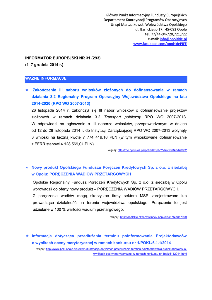 Główny Punkt Informacyjny Funduszy Europejskich Departament Koordynacji Programów Operacyjnych Urząd Marszałkowski Województwa Opolskiego ul. Barlickiego 17, 45-083 Opole tel. 77/44-04-720,721,722 e-mail: [email protected] www.facebook.com/opolskiePIFE INFORMATOR EUROPEJSKI NR 31 (293) (1–7 grudnia 2014 r.) WAśNE INFORMACJE Zakończenie III naboru wniosków złoŜonych do dofinansowania w ramach działania 3.2 Regionalny Program Operacyjny Województwa Opolskiego na lata 2014-2020 (RPO WO 2007-2013) 26 listopada 2014 r. zakończył się III nabór wniosków o dofinansowanie projektów złoŜonych w ramach działania 3.2 Transport publiczny RPO WO 2007-2013. W odpowiedzi na ogłoszenie o III naborze wniosków, przeprowadzonym w dniach od 12 do 26 listopada 2014 r. do Instytucji Zarządzającej RPO WO 2007-2013 wpłynęły 3 wnioski na łączną kwotę 7 774 419,18 PLN (w tym wnioskowane dofinansowanie z EFRR stanowi 4 128 569,01 PLN). więcej: http://rpo.opolskie.pl/rpo/index.php?id=2166&idd=8002 Nowy produkt Opolskiego Funduszu Poręczeń Kredytowych Sp. z o.o. z siedzibą w Opolu: PORĘCZENIA WADIÓW PRZETARGOWYCH Opolskie Regionalny Fundusz Poręczeń Kredytowych Sp. z o.o. z siedzibą w Opolu wprowadził do oferty nowy produkt – PORĘCZENIA WADIÓW PRZETARGOWYCH. Z poręczenia wadiów mogą skorzystać firmy sektora MSP zarejestrowane lub prowadzące działalność na terenie województwa opolskiego. Poręczenie to jest udzielane w 100 % wartości wadium przetargowego. więcej: http://opolskie.pl/serwis/index.php?id=467&idd=7999 Informacja dotycząca przedłuŜenia terminu poinformowania Projektodawców o wynikach oceny merytorycznej w ramach konkursu nr 1/POKL/6.1.1/2014 więcej: http://www.pokl.opole.pl/3807/1/informacja-dotyczaca-przedluzenia-terminu-poinformowania-projektodawcow-owynikach-oceny-merytorycznej-w-ramach-konkursu-nr-1pokl6112014.html Główny Punkt Informacyjny Funduszy Europejskich Departament Koordynacji Programów Operacyjnych Urząd Marszałkowski Województwa Opolskiego ul. Barlickiego 17, 45-083 Opole tel. 77/44-04-720,721,722 e-mail: [email protected] www.facebook.com/opolskiePIFE Lista rankingowa wniosków o dofinansowanie projektów w ramach konkursu zamkniętego nr 1/POKL/7.2.1/2014, Priorytet VII (do dofinansowania zakwalifikowane zostały wnioski zajmujące na liście rankingowej pozycje od 1 do 8 - włącznie) więcej: http://www.pokl.opole.pl/3806/1/lista-rankingowa-wnioskow-o-dofinansowanie-projektow-w-ramach-konkursuzamknietego-nr-1pokl7212014-priorytet-vii-do-dofinansowania-zakwalifikowane-zostaly-wnioski-zajmujace-na-liscierankingowej-pozycje-od-1-do-8-wlacznie.html W Państwowej WyŜszej Szkole Zawodowej w Nysie ruszyła działalność Akademickiego Inkubatora Przedsiębiorczości W dniu 28.11. 2014 rozpoczął w Państwowej WyŜszej Szkole Zawodowej w Nysie działalność Akademicki Inkubator Przedsiębiorczości. Zadaniem AIP będzie ułatwienie startu w biznesie wszystkim osobom, bez względu na wiek czy wykształcenie. Będzie to moŜliwe dzięki innowacyjnemu na skalę europejską sposobowi na prowadzenie firmy, bez konieczności zakładania własnej działalności gospodarczej, co ograniczy koszty i wszelką związaną z tym biurokrację. więcej: http://www.pwsz.nysa.pl/index.php?p=22&ak=64,4028,0 Ogłoszenie dotyczące zmienionych zasad udzielenia wsparcia na wdroŜenie CSR Polska Agencja Rozwoju Przedsiębiorczości działając na podstawie § 2 ust. 3 w związku z ust. 2 rozporządzenia Ministra Gospodarki z dnia 4 listopada 2014 r. zmieniającego rozporządzenie w sprawie udzielania przez Polską Agencję Rozwoju Przedsiębiorczości pomocy finansowej niezwiązanej z programami operacyjnymi (Dz. U. poz. 1609) przedstawia warunki rozpatrywania wniosków o udzielenie wsparcia na wdroŜenie CSR złoŜonych przed dniem 1 lipca 2014 r. więcej: http://csr.parp.gov.pl/index/more/44177 O programie COSME W grudniu 2013 r. Parlament Europejski i Rada Unii Europejskiej przyjęły Program ramowy na rzecz konkurencyjności przedsiębiorstw oraz małych i średnich Główny Punkt Informacyjny Funduszy Europejskich Departament Koordynacji Programów Operacyjnych Urząd Marszałkowski Województwa Opolskiego ul. Barlickiego 17, 45-083 Opole tel. 77/44-04-720,721,722 e-mail: [email protected] www.facebook.com/opolskiePIFE przedsiębiorstw 2014-2020 COSME (Programme for the Competitiveness of Enterprises and small and medium-sized enterprises). Główne cele programu to: • wzmocnienie konkurencyjności i trwałości unijnych przedsiębiorstw, szczególnie małych i średnich, oraz • krzewienie kultury przedsiębiorczości, wspieranie tworzenia miejsc pracy oraz wzrostu MSP. więcej: http://instrumentyfinansoweue.gov.pl/cosme.php O programie Horyzont 2020 W grudniu 2013 r. Parlament Europejski i Rada Unii Europejskiej przyjęły "Horyzont 2020” – program ramowy w zakresie badań naukowych i innowacji na lata 20142020 (The Framework Programme for Research and Innovation). Horyzont 2020 to największy w historii Unii Europejskiej program na rzecz badań i innowacji. Jego łączny, siedmioletni budŜet wynosi blisko 80 mld euro. Program stanowi narzędzie wdraŜania Unii Innowacji, flagowej inicjatywy strategii wzrostu Europa 2020, mającej na celu zwiększenie konkurencyjności Europy na świecie. więcej: http://instrumentyfinansoweue.gov.pl/h2020.php Ankieta Komisji Europejskiej dla przedsiębiorców w ramach umowy handlowej Transatlantyckiego Partnerstwa Handlowo-Inwestycyjnego (TTIP) Zaproszeni dla polskich przedsiębiorców z sektora małych i średnich przedsiębiorstw do wypełniania ankiety on-line dotyczącej Transatlantyckiego Partnerstwa HandlowoInwestycyjnego między Unią Europejską a Stanami Zjednoczonymi. Konsultacje trwają do 15 grudnia 2014 r. więcej: http://www.mg.gov.pl/node/22250 Fundusz poŜyczkowy dla kobiet nowym instrumentem wsparcia Ministerstwo Gospodarki we współpracy z Polską Agencją Rozwoju Przedsiębior