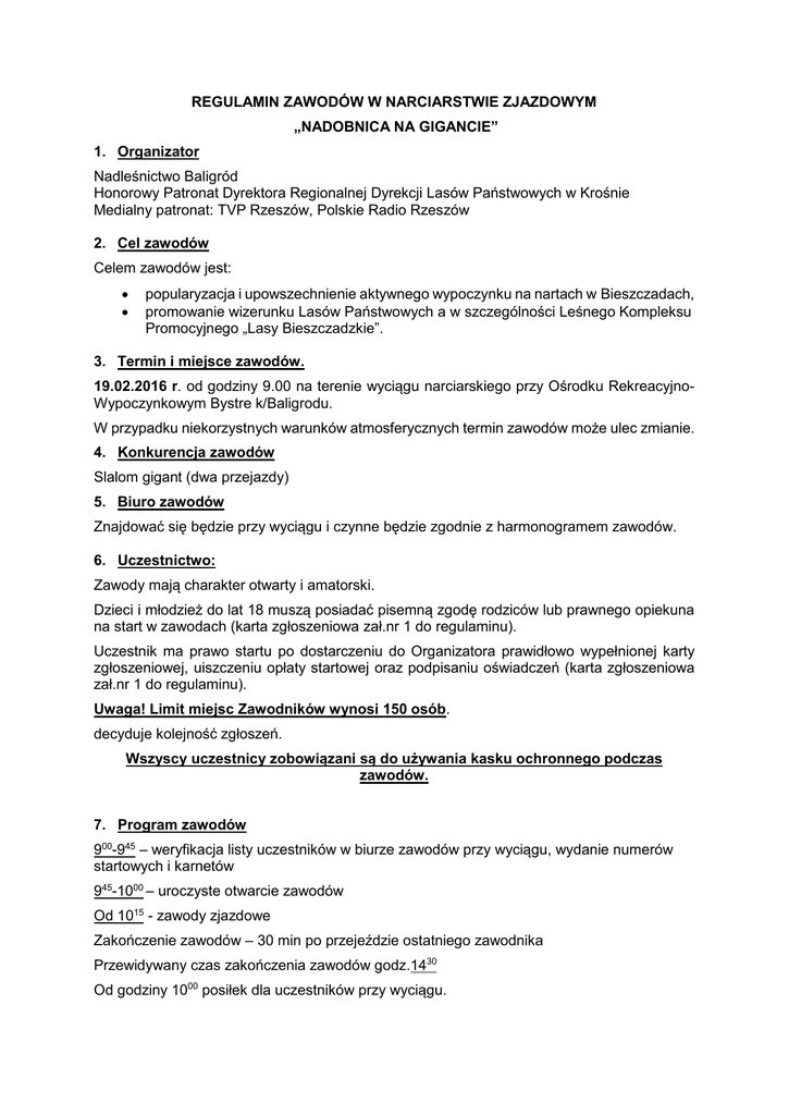 REGULAMIN ZAWODÓW W NARCIARSTWIE ZJAZDOWYM „NADOBNICA NA GIGANCIE” 1. Organizator Nadleśnictwo Baligród Honorowy Patronat Dyrektora Regionalnej Dyrekcji Lasów Państwowych w Krośnie Medialny patronat: TVP Rzeszów, Polskie Radio Rzeszów 2. Cel zawodów Celem zawodów jest: popularyzacja i upowszechnienie aktywnego wypoczynku na nartach w Bieszczadach, promowanie wizerunku Lasów Państwowych a w szczególności Leśnego Kompleksu Promocyjnego „Lasy Bieszczadzkie”. 3. Termin i miejsce zawodów. 19.02.2016 r. od godziny 9.00 na terenie wyciągu narciarskiego przy Ośrodku RekreacyjnoWypoczynkowym Bystre k/Baligrodu. W przypadku niekorzystnych warunków atmosferycznych termin zawodów może ulec zmianie. 4. Konkurencja zawodów Slalom gigant (dwa przejazdy) 5. Biuro zawodów Znajdować się będzie przy wyciągu i czynne będzie zgodnie z harmonogramem zawodów. 6. Uczestnictwo: Zawody mają charakter otwarty i amatorski. Dzieci i młodzież do lat 18 muszą posiadać pisemną zgodę rodziców lub prawnego opiekuna na start w zawodach (karta zgłoszeniowa zał.nr 1 do regulaminu). Uczestnik ma prawo startu po dostarczeniu do Organizatora prawidłowo wypełnionej karty zgłoszeniowej, uiszczeniu opłaty startowej oraz podpisaniu oświadczeń (karta zgłoszeniowa zał.nr 1 do regulaminu). Uwaga! Limit miejsc Zawodników wynosi 150 osób. decyduje kolejność zgłoszeń. Wszyscy uczestnicy zobowiązani są do używania kasku ochronnego podczas zawodów. 7. Program zawodów 900-945 – weryfikacja listy uczestników w biurze zawodów przy wyciągu, wydanie numerów startowych i karnetów 945-1000 – uroczyste otwarcie zawodów Od 1015 - zawody zjazdowe Zakończenie zawodów – 30 min po przejeździe ostatniego zawodnika Przewidywany czas zakończenia zawodów godz.1430 Od godziny 1000 posiłek dla uczestników przy wyciągu. Do godziny 1500 możliwość korzystania z wyciągu w ramach karnetu (15 zjazdów). 8. Zgłoszenie zawodników. Zapisy zawodników trwają od 01.02.2016 r. do dnia 12.02.2016 r. W celu dokonania zgłoszenia należy dostarczyć prawidłowo wypełnioną kartę zgłoszeniową (do pobrania ze strony www.baligrod.krosno.lasy.gov.pl lub w siedzibie Nadleśnictwa) oraz dokonać opłaty startowej. Karty zgłoszeniowe należy dostarczyć do sekretariatu Nadleśnictwa Baligród ul. Bieszczadzka 15, 38-606 Baligród lub przesłać elektronicznie na adres [email protected], [email protected] Lista startowa zostanie umieszczona na stronie www.baligrod.krosno.lasy.gov.pl od dnia 15.02.2016 r. Warunkiem umieszczenia na liście startowej jest uiszczenie opłaty startowej. Opłata startowa wynosi: 50 zł – jeden uczestnik W ramach opłaty startowej Uczestnik otrzymuje: karnet 15 zjazdów możliwy do wykorzystania do godz. 15.00 pamiątkowy medal posiłek (ciepłe danie, kawa lub herbata) grupowe ubezpieczenie NNW zabezpieczenie medyczne podczas zawodów niespodziankę Opłatę należy wpłacać na konto bankowe: Nadleśnictwo Baligród ul. Bieszczadzka 15 38-606 Baligród BGŻ Sanok 27 2030 0045 1110 0000 0077 8820 tytułem ZAWODY ZJAZDOWE W przypadku: 9. rezygnacji z udziału w zawodach po wpłaceniu opłat startowej, opłata nie podlega zwrotowi, odwołania zawodów Organizator zwraca opłatę startową, przesunięcia terminu zawodów Organizator zwraca opłatę startową na wniosek uczestnika. Informacje dla zawodników Przy wyciągu istnieje możliwość wypożyczenia sprzętu narciarskiego we własnym zakresie. KONTAKT SERWIS NARCIARSKI U HENIA – TEL. 783 151 252 WYPOŻYCZALNIA NART – TEL. 503 741 034 Za rzeczy osobiste Uczestników pozostawione bez opieki Organizator nie ponosi odpowiedzialności Organizator nie ubezpiecza sprzętu zawodników. W czasie zawodów istnieje możliwość zakupu dodatkowych posiłków oraz napojów. Każdy uczestnik zobowiązany jest do zwrotu numeru startowego do biura zawodów nie później niż do godz. 1500. W przypadku zgubienia lub nieoddania numeru startowego zostanie obciążony karą w wysokości 50 zł. 10. Zasady zawodów Zawody odbywają się w następujących kategoriach KOBIETY (rok urodzenia) MEŻCZYŹNI (rok urodzenia) JUNIOR MŁODSI 2006 i młodsi 2006 i młodsi JUNIOR STARSI 2005-2001 2005-2001 SENIOR 2000 i starsi 2000 i starsi Zawodnicy startują począwszy od najmłodszej grupy wiekowej, zaczynając od juniorek młodszych, w kolejności numerów startowych, przyznawanych według kolejności zgłoszeń. Dla wszystkich grup wiekowych obowiązują dwa przejazdy slalomu (po tej samej trasie). O miejscu decyduje lepszy czas uzyskany w jednym z dwóch przejazdów. Pomiaru czasu dokonują osoby wyznaczone przez Organizatora. Organizator nie przewiduje możliwości protestów oraz odwołań do pomiaru czasu i klasyfikacji Zawodników. 11. Nagrody. Przewidziano nagrody dla pierwszych trzech miejsc w każdej z kategorii z podziałem na płeć oraz nagrody niespodzianki. 12. Postanowienia końcowe Organizator w przypadku braku odpowiednich warunków śniegowych zastrzega sobie prawo do ograniczenia zawodów do jednego przejazdu, przesunięcia terminu lub odwołania zawodów. Wiążąca i ostateczna interpretacja regulaminu przysługuje wyłącznie Organizatorowi. Organizator zastrzega sobie prawo zmiany niniejszego regulaminu bez podania przyczyny. Organizatorzy nie biorą odpowiedzialności za wypadki wynikłe z winy uczestników zawodów (m. in. nie przestrzegania regulaminu). Każdy uczestnik zobowiązany jest do szczególnej dbałości o bezpieczeństwo podczas trwania zawodów. Dodatkowych informacji udzielają: Malwina Siwy tel. 660 732 834, 13 465 72 14 [email protected] Roman Pasionek tel. 795 419 179, [email protected]