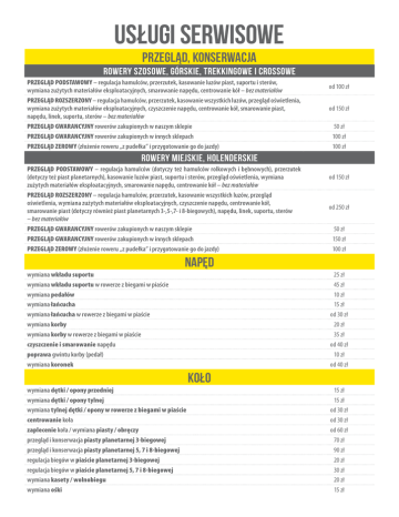 USŁUGI SERWISOWE PRZEGLĄD, KONSERWACJA rowery szosowe, górskie, trekkingowe i crossowe PRZEGLĄD PODSTAWOWY – regulacja hamulców, przerzutek, kasowanie luzów piast, suportu i sterów, wymiana zużytych materiałów eksploatacyjnych, smarowanie napędu, centrowanie kół – bez materiałów PRZEGLĄD ROZSZERZONY – regulacja hamulców, przerzutek, kasowanie wszystkich luzów, przegląd oświetlenia, wymiana zużytych materiałów eksploatacyjnych, czyszczenie napędu, centrowanie kół, smarowanie piast, napędu, linek, suportu, sterów – bez materiałów PRZEGLĄD GWARANCYJNY rowerów zakupionych w naszym sklepie PRZEGLĄD GWARANCYJNY rowerów zakupionych w innych sklepach PRZEGLĄD ZEROWY (złożenie roweru „z pudełka” i przygotowanie go do jazdy) od 100 zł od 150 zł 50 zł 100 zł 100 zł rowery miejskie, holenderskie PRZEGLĄD PODSTAWOWY – regulacja hamulców (dotyczy też hamulców rolkowych i bębnowych), przerzutek (dotyczy też piast planetarnych), kasowanie luzów piast, suportu i sterów, przegląd oświetlenia, wymiana zużytych materiałów eksploatacyjnych, smarowanie napędu, centrowanie kół – bez materiałów PRZEGLĄD ROZSZERZONY – regulacja hamulców, przerzutek, kasowanie wszystkich luzów, przegląd oświetlenia, wymiana zużytych materiałów eksploatacyjnych, czyszczenie napędu, centrowanie kół, smarowanie piast (dotyczy również piast planetarnych 3-,5-,7- i 8-biegowych), napędu, linek, suportu, sterów – bez materiałów PRZEGLĄD GWARANCYJNY rowerów zakupionych w naszym sklepie PRZEGLĄD GWARANCYJNY rowerów zakupionych w innych sklepach PRZEGLĄD ZEROWY (złożenie roweru „z pudełka” i przygotowanie go do jazdy) od 150 zł od 250 zł 50 zł 150 zł 100 zł NAPĘD wymiana wkładu suportu wymiana wkładu suportu w rowerze z biegami w piaście wymiana pedałów wymiana łańcucha wymiana łańcucha w rowerze z biegami w piaście wymiana korby wymiana korby w rowerze z biegami w piaście czyszczenie i smarowanie napędu poprawa gwintu korby (pedał) wymiana koronek 25 zł 45 zł 10 zł 15 zł od 30 zł 20 zł 35 zł od 40 zł 10 zł od 40 zł KOŁO wymiana dętki / opony przedniej wymiana dętki / opony tylnej wymiana tylnej dętki / opony w rowerze z biegami w piaście centrowanie koła zaplecenie koła / wymiana piasty / obręczy przegląd i konserwacja piasty planetarnej 3-biegowej przegląd i konserwacja piasty planetarnej 5, 7 i 8-biegowej regulacja biegów w piaście planetarnej 3-biegowej regulacja biegów w piaście planetarnej 5, 7 i 8-biegowej wymiana kasety / wolnobiegu wymiana ośki 15 zł 15 zł od 30 zł od 30 zł od 60 zł 70 zł 90 zł 20 zł 30 zł 20 zł 15 zł HAMULCE regulacja hamulca wymiana i regulacja klocków hamulcowych wymiana i regulacja pancerzy / linek hamulcowych montaż hamulców wymiana klamki odpowietrzenie hamulca hydraulicznego – bez płynu przegląd i konserwacja hamulca rolkowego (używamy smaru rekomendowanego przez Shimano) 15 zł 20 zł 30 zł od 25 zł od 30 zł 35 zł od 35 zł PRZERZUTKI regulacja przerzutki przedniej / tylnej wymiana i regulacja przerzutki przedniej / tylnej wymiana manetki regulacja biegów w piaście planetarnej 3-biegowej regulacja biegów w piaście planetarnej 5, 7 i 8-biegowej od 15 zł od 20 zł od 20 zł 20 zł 30 zł RAMA wymiana ramy złożenie roweru – na nowych komponentach, w zależności od typu roweru od 150 zł od 130 zł UKŁAD KIEROWNICZY wymiana kierownicy / wspornika wymiana widelca smarowanie sterów wymiana sterów wymiana gripów montaż owijki montaż licznika od 15 zł od 30 zł od 15 zł od 40 zł od 10 zł od 30 zł 15 zł OŚWIETLENIE przegląd oświetlenia na dynamo montaż lampek diodowych od 25 zł 5 zł INNE montaż bagażnika montaż błotników montaż kosza przedniego montaż fotelika dziecięcego montaż nóżki montaż osłony łańcucha 15 zł 10 zł od 15 zł 40 zł 10 zł od 30 zł Koszty części użytych podczas naprawy nie są uwzględnione w cenniku. Przed wykonaniem usługi informujemy Klienta o jej orientacyjnym koszcie. Części poniżej 30 zł wymieniamy bez uzgodnienia z klientem. Ceny montażu akcesoriów rowerowych nie dotyczą akcesoriów zakupionych w naszym sklepie. W serwisie używamy tylko profesjonalnych płynów technicznych, smarów i narzędzi rekomendowanych przez producentów komponentów. Cennik obowiązuje do dnia 31 grudnia 2016 roku.