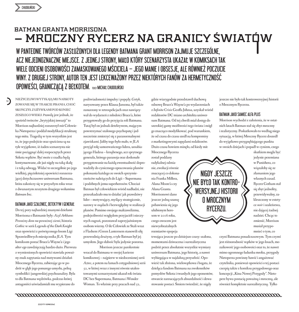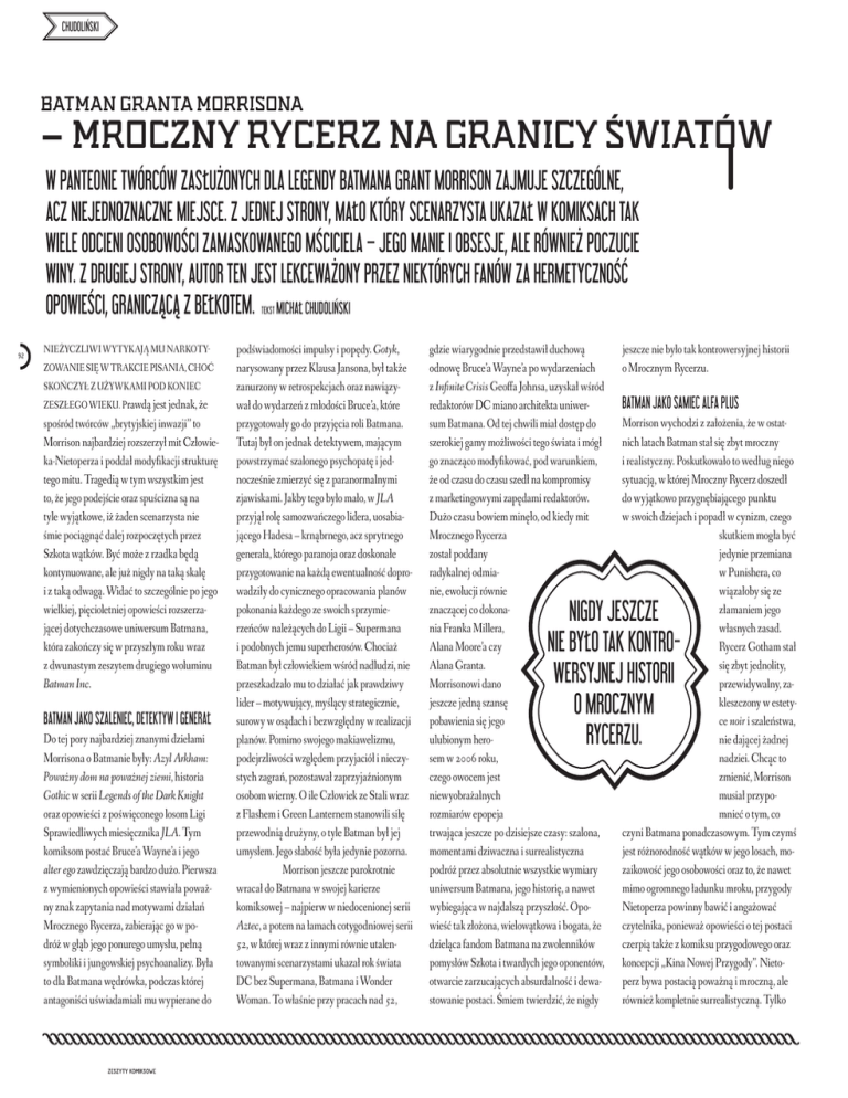 chudoliński Batman Granta Morrisona – Mroczny Rycerz na granicy światów W panteonie twórców zasłużonych dla legendy Batmana Grant Morrison zajmuje szczególne, acz niejednoznaczne miejsce. Z jednej strony, mało który scenarzysta ukazał w komiksach tak wiele odcieni osobowości zamaskowanego mściciela – jego manie i obsesje, ale również poczucie winy. Z drugiej strony, autor ten jest lekceważony przez niektórych fanów za hermetyczność opowieści, graniczącą z bełkotem. Michał Chudoliński tekst 92 Nieżyczliwi wytykają mu narkotyzowanie się w trakcie pisania, choć skończył z używkami pod koniec zeszłego wieku. Prawdą jest jednak, że spośród twórców „brytyjskiej inwazji” to Morrison najbardziej rozszerzył mit Człowieka-Nietoperza i poddał modyfikacji strukturę tego mitu. Tragedią w tym wszystkim jest to, że jego podejście oraz spuścizna są na tyle wyjątkowe, iż żaden scenarzysta nie śmie pociągnąć dalej rozpoczętych przez Szkota wątków. Być może z rzadka będą kontynuowane, ale już nigdy na taką skalę i z taką odwagą. Widać to szczególnie po jego wielkiej, pięcioletniej opowieści rozszerzającej dotychczasowe uniwersum Batmana, która zakończy się w przyszłym roku wraz z dwunastym zeszytem drugiego woluminu Batman Inc. Batman jako szaleniec, detektyw i generał Do tej pory najbardziej znanymi dziełami Morrisona o Batmanie były: Azyl Arkham: Poważny dom na poważnej ziemi, historia Gothic w serii Legends of the Dark Knight oraz opowieści z poświęconego losom Ligi Sprawiedliwych miesięcznika JLA. Tym komiksom postać Bruce’a Wayne’a i jego alter ego zawdzięczają bardzo dużo. Pierwsza z wymienionych opowieści stawiała poważny znak zapytania nad motywami działań Mrocznego Rycerza, zabierając go w podróż w głąb jego ponurego umysłu, pełną symboliki i jungowskiej psychoanalizy. Była to dla Batmana wędrówka, podczas której antagoniści uświadamiali mu wypierane do podświadomości impulsy i popędy. Gotyk, narysowany przez Klausa Jansona, był także zanurzony w retrospekcjach oraz nawiązywał do wydarzeń z młodości Bruce’a, które przygotowały go do przyjęcia roli Batmana. Tutaj był on jednak detektywem, mającym powstrzymać szalonego psychopatę i jednocześnie zmierzyć się z paranormalnymi zjawiskami. Jakby tego było mało, w JLA przyjął rolę samozwańczego lidera, uosabiającego Hadesa – krnąbrnego, acz sprytnego generała, którego paranoja oraz doskonałe przygotowanie na każdą ewentualność doprowadziły do cynicznego opracowania planów pokonania każdego ze swoich sprzymierzeńców należących do Ligii – Supermana i podobnych jemu superherosów. Chociaż Batman był człowiekiem wśród nadludzi, nie przeszkadzało mu to działać jak prawdziwy lider – motywujący, myślący strategicznie, surowy w osądach i bezwzględny w realizacji planów. Pomimo swojego makiawelizmu, podejrzliwości względem przyjaciół i nieczystych zagrań, pozostawał zaprzyjaźnionym osobom wierny. O ile Człowiek ze Stali wraz z Flashem i Green Lanternem stanowili siłę przewodnią drużyny, o tyle Batman był jej umysłem. Jego słabość była jedynie pozorna. Morrison jeszcze parokrotnie wracał do Batmana w swojej karierze komiksowej – najpierw w niedocenionej serii Aztec, a potem na łamach cotygodniowej serii 52, w której wraz z innymi równie utalentowanymi scenarzystami ukazał rok świata DC bez Supermana, Batmana i Wonder Woman. To właśnie przy pracach nad 52, gdzie wiarygodnie przedstawił duchową odnowę Bruce’a Wayne’a po wydarzeniach z Infinite Crisis Geoffa Johnsa, uzyskał wśród redaktorów DC miano architekta uniwersum Batmana. Od tej chwili miał dostęp do szerokiej gamy możliwości tego świata i mógł go znacząco modyfikować, pod warunkiem, że od czasu do czasu szedł na kompromisy z marketingowymi zapędami redaktorów. Dużo czasu bowiem minęło, od kiedy mit Mrocznego Rycerza został poddany radykalnej odmianie, ewolucji równie znaczącej co dokonania Franka Millera, Alana Moore’a czy Alana Granta. Morrisonowi dano jeszcze jedną szansę pobawienia się jego ulubionym herosem w 2006 roku, czego owocem jest niewyobrażalnych rozmiarów epopeja trwająca jeszcze po dzisiejsze czasy: szalona, momentami dziwaczna i surrealistyczna podróż przez absolutnie wszystkie wymiary uniwersum Batmana, jego historię, a nawet wybiegająca w najdalszą przyszłość. Opowieść tak złożona, wielowątkowa i bogata, że dzieląca fandom Batmana na zwolenników pomysłów Szkota i twardych jego oponentów, otwarcie zarzucających absurdalność i dewastowanie postaci. Śmiem twierdzić, że nigdy jeszcze nie było tak kontrowersyjnej historii o Mrocznym Rycerzu. Batman jako samiec alfa plus Morrison wychodzi z założenia, że w ostatnich latach Batman stał się zbyt mroczny i realistyczny. Poskutkowało to według niego sytuacją, w której Mroczny Rycerz doszedł do wyjątkowo przygnębiającego punktu w swoich dziejach i popadł w cynizm, czego skutkiem mogła być jedynie przemiana w Punishera, co wiązałoby się ze złamaniem jego własnych zasad. Rycerz Gotham stał się zbyt jednolity, przewidywalny, zakleszczony w estetyce noir i szaleństwa, nie dającej żadnej nadziei. Chcąc to zmienić, Morrison musiał przypomnieć o tym, co czyni Batmana ponadczasowym. Tym czymś jest różnorodność wątków w jego losach, mozaikowość jego osobowości oraz to, że nawet mimo ogromnego ładunku mroku, przygody Nietoperza powinny bawić i angażować czytelnika, ponieważ opowieści o tej postaci czerpią także z komiksu przygodowego oraz koncepcji „Kina Nowej Przygody”. Nietoperz bywa postacią poważną i mroczną, ale również kompletnie surrealistyczną. Tylko nigdy jeszcze nie było tak kontrowersyjnej historii o Mrocznym Rycerzu. Ilustracje: Wizja Mrocznego Rycerza, Batman Inc. vol. 2 #0, scen. Grant Morrison, rys. Frazer Irving, ©