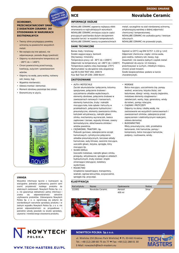 ŚRODKI SMARNE D TEE RAN R GUA ITY FO S L L QUA SSIONA E F O PR OCHRONNY, PRZECIWZATARCIOWY SMAR Z DODATKIEM CERAMIKI DO STOSOWANIA W WARUNKACH EKSTREMALNYCH • Tworzy silnie przylegającą powłokę ochronną na powierzchni wszystkich metali. • Nie wytapia się (nie spływa), nie odparowywuje, posiada długą żywotność. • Odporny na ekstremalne temperatury od - 180°C do + 1400°C. • Chroni powierzchnię przed korozją, kawitacją, zużyciem i powstawaniem wżerów. • Odporny na wodę, parę wodną, roztwory soli, kwasy, ługi.. • Wypełnia nierówności. • Ułatwia montaż i demontaż. • Moment obrotowy pozostaje bez zmian. • Ekonomiczny w użyciu. UWAGA Wszystkie informacje łącznie z ilustracjami są wiarygodne. Jednakże użytkownicy powinni sami ocenić przydatność każdego produktu do właściwych zastosowań. Nowytech Polska Sp. z o. o. nie gwarantuje dokładności pełnej informacji i zrzeka się odpowiedzialności odnośnie użytkowania produktów. Zobowiązania Nowytech Polska Sp. z o. o. ograniczają się jedynie do standardowych warunków sprzedaży produktu i w żadnym wypadku Nowytech Polska Sp. z o. o. nie ponosi odpowiedzialności za przypadkowe i pośrednie szkody powstałe na skutek sprzedaży, używania i niewłaściwego stosowania produktu. Novalube Ceramic NCE INFORMACJE OGÓLNE NOVALUBE CERAMIC zapewnia najlepszy efekt smarowania w najtrudniejszych warunkach. NOVALUBE CERAMIC zmniejsza zużycie części pracujących pod bardzo dużym obciążeniem (wysokie tarcie) i w wysokich temperaturach. NOVALUBE CERAMIC tworzy na powierzchniach metali, szczególnie na stali nierdzewnej ochronną, antykorozyjną warstwę o dobrej odporności chemicznej i temperaturowej. NOVALUBE CERAMIC nie uszkadza gumy i tworzyw sztucznych. NOVALUBE CERAMIC nie przewodzi prądu. DANE TECHNICZNE Barwa: biały / kremowy Środek zagęszczający: bentonit Olej bazowy: mineralny Temperatura pracy: od - 40°C do +1000°C Odporność na temperaturę: od -180°C do +1400°C Temperatura zapłonu oleju bazowego: 270°C Wytrzymałość na obciążenie (siła zespolona) wg DN 51350 TEST VKA: 2000 N Four Ball Test (IP-239): 2000 N/cm². Gęstość w (20°C) wg DIN 51757: 1,132 g / cm3 Odporność chemiczna: ciepła i zimna woda, para wodna, roztwory soli, kwasy, ługi. Zawartość: nie zawiera żadnych cząstek metali Przydatność do użycia: 12 miesięcy, przechowywać w suchym, chłodnym miejscu, chronić przed mrozem. Środki bezpieczeństwa: podano w karcie charakterystyki. ZASTOSOWANIE • AUTA I MOTOCYKLE Zaciski akumulatorów i połączenia, kolumny sprężynowe, połączenia śrubowe i uszczelnienia układów wydechowych, elementy obrotowe, połączenia śrubowe w zawieszeniach ramowych i karoseriach, elementy hamulców, śruby i nakrętki mocujące koła, koła zębate i łańcuchy w przekładniach, połączenia hydrauliczne i pneumatyczne, elementy zawieszenia silnika, końcówki wtryskiwaczy, nakrętki głowic silnika, mechanizmy wycieraczek, świece zapłonowe i żarowe, wypusty klinowe, zawory termostatyczne, oblachowania silników i wlotów powietrza. • CIĘŻARÓWKI, TRAKTORY, itp. Poduszki gumowe, zabezpieczenia szczęk hamulcowych, cylindryczne połączenia układów pneumatycznych, tarczowe układy hamulcowe, wały klinowe, sworznie mocujące, uszczelki głowic, łożyska, sprzęgła, kliny mocujące itp. • SILNIKI DIESLA Uszczelki metalowe, nakrętki głowic silnika, przeguby, wtryskiwacze, sprzęgła w układach hydraulicznych, śruby stalowe i drążki zmieniające (sterujące), kolektory wydechowe. • ROLNICTWO Urządzenia nawadniające, transportery, wiatraki, ogniwa łańcuchów, oczyszczalnie, sprzęgła (np. przyczep). • MORSKIE Bolce mocujące, uszczelnienia (np. pompy wodne), wrzeciona, łożyska (łoża), luki ładunkowe, dźwigi i windy, maszty żeglarskie, metalowe elementy ożaglowania i zakotwiczeń, wanty, boje, generatory, windy do kotwic, pompy rotacyjne. • CIĄGNIKI I PRZYCZEPY Odporny na słoną i słodką wodę, ma zastosowanie we wszystkich zamocowaniach i zawieszeniach silników, zabezpiecza przed zapieczeniem i elektrolitycznymi reakcjami, ułatwia demontaż. • BUDOWNICTWO Młoty pneumatyczne, rolki, przekładnie betoniarek, linki hamulców, pompy i kompresory, bolce mocujące hamulców, podpory, rusztowania, windy. KLASYFIKACJA Kod artykułu 222001 Nazwa Novalube Ceramic Opakowanie Aerozol 400 ml Rodzaj Smar