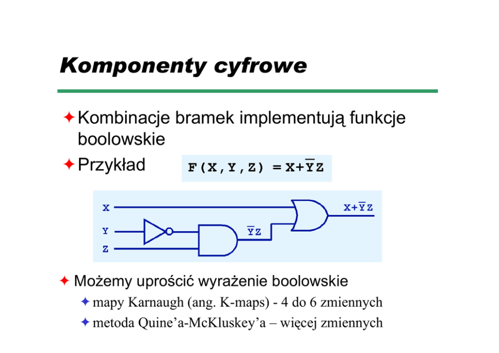 Komponenty cyfrowe ✦ Kombinacje bramek implementują funkcje boolowskie ✦ Przykład ✦ Możemy uprościć wyrażenie boolowskie ✦ mapy Karnaugh (ang. K-maps) - 4 do 6 zmiennych ✦ metoda Quine’a-McKluskey’a – więcej zmiennych Układy kombinacyjne ✦ Zaprojektowaliśmy układ implementujący funkcję: ✦ Jest to przykład układu wykorzystującego logikę kombinacyjną ✦ Układ kombinacyjny daje dane wyjściowe jedynie w opraciu o podane dane wejściowe ✦ może mieć kilka wyników Sumator ✦ Najprostszy układ kombinacyjny to półsumator (ang. halfadder, HA) sumujący dwa bity ✦ dwa wyjścia ✦ daje dwa wyniki sumę i przeniesienie ✦ Suma to XOR ✦ Przeniesienie (ang. carry) to AND Sumator (c.d.) ✦ Możemy rozszerzyć półsumator do układu pozwalającego na dodawanie większych liczb binarnych ✦ Pełny sumator (ang. full adder, FA) stosuje bramki do uwzględnienia bitu przeniesienia Sumator (c.d.) ✦ Jak zmienić półsumator na pełny? Sumator (c.d.) ✦ Pełny sumator (ang. fulladder, FA) ✦ dodaje 3 bity Sumator (c.d.) ✦ Tak jak połączyliśmy dwa półsumatory (HA) aby uzyskać jeden pełny sumator (FA) tak łączymy je w sumator kaskadowy (ang. ripple-carry adder) ✦ Bity przeniesienia (ang. carry) przechodzą kaskadowo (ang. ripple) przez kolejne sumatory ✦ Współczesne systemy stosują bardziej wydajne sumatory Dekoder ✦ Dekodery pozwalają między innymi na lokalizację miejsca w pamięci na podstawie wartości binarnej podanej na liniach adresowych magistrali pamięci ✦ Dekodery adresowe na podstawie n danych wejściowych dają maksymalnie 2n danych wyjściowych Dekodery (c.d.) ✦ dekoder 2-do-4 bitowy ✦ którą linię włącza x=0,y=1? Multiplekser ✦ Działa odwrotnie niż dekoder: wybiera jedną z wielu linii wejściowych i kieruje do jenej linii wyjściowej ✦ Sposób wyboru linii jest określnony przy pomocy linii kontrolnych (ang. control lines) ✦ Do wybrania jednej z n linii wejściowych potrzeba log2n linii kontrolnych ✦ Zastosowanie – ładowanie licznika PC Multiplekser (c.d.) ✦ multiplekser 4-do-1 ✦ jaką linię wejściową wybiera S0 = 1, S1 = 0 Shifter ✦ shifter przesuwa bity o jedną pozycję w prawo lub lewo ✦ w którą stronę jest przesunięcie gdy S=0?