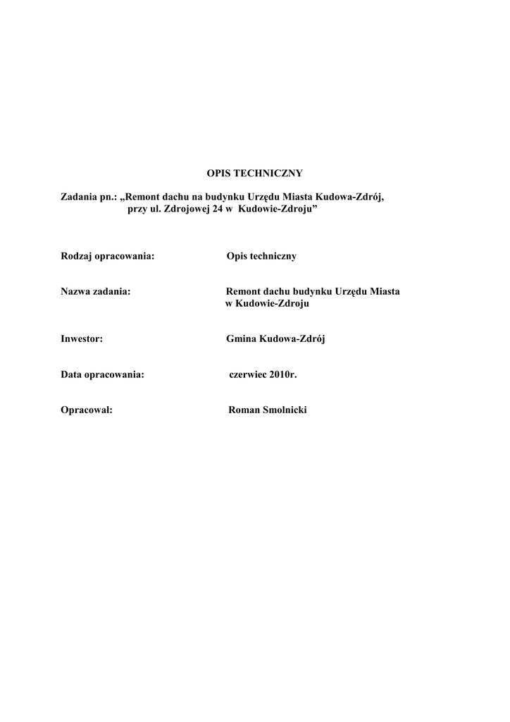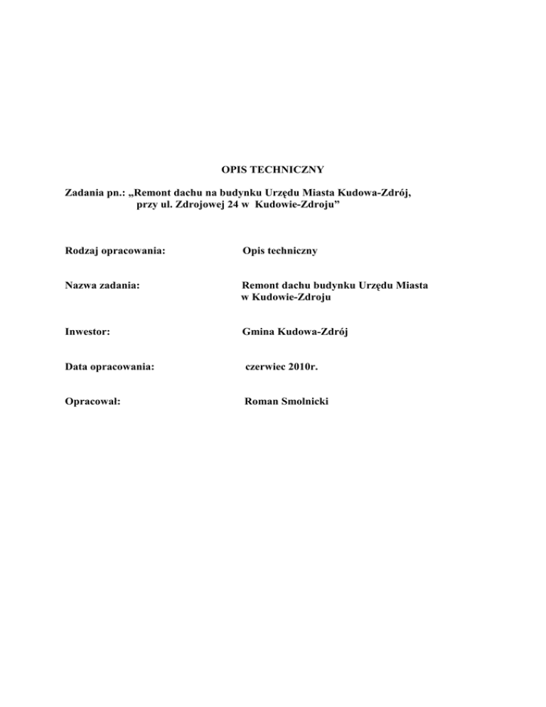 OPIS TECHNICZNY Zadania pn.: „Remont dachu na budynku Urzędu Miasta Kudowa-Zdrój, przy ul. Zdrojowej 24 w Kudowie-Zdroju” Rodzaj opracowania: Opis techniczny Nazwa zadania: Remont dachu budynku Urzędu Miasta w Kudowie-Zdroju Inwestor: Gmina Kudowa-Zdrój Data opracowania: czerwiec 2010r. Opracował: Roman Smolnicki Opis techniczny - dla robót związanych z remontem dachu na budynku Urzędu Miasta Kudowa-Zdrój, przy ul. Zdrojowej 24 w Kudowie-Zdroju, dz. nr 189/10, AM-5, obręb Zakrze. 1 .Podstawa opracowania - przegląd techniczny istniejącego dachu w części dotyczącej remontu - ustalenia z inwestorem - właściwe przepisy i normy 2.Przedmiot inwestycji. Przedmiotem inwestycji jest: remont dachu budynku Urzędu Miasta Kudowa-Zdrój polegający na: - rozbiórce: istniejącego pokrycia (dachówka karpiówka), rynien, rur spustowych, obróbek blacharskich, - remoncie: istniejącej konstrukcji dachu (wymiana łat oraz kontr-łat) - montaŜu: połaci dachu z dachówki karpiówki, z orynnowaniem, rurami spustowymi, obróbkami blacharskimi oraz elementami ozdobnymi Zakres zadania obejmuje w szczególności: 1. Wymianę pokrycia dachowego z dachówki karpiówki starego typu na nową dachówkę karpiówkę (38*18*1,4 cm, kolor grafitowy) o pow.565 m2 w tym 458m2 na połaci dachu w koronkę i 107 m2 na wieŜach w łuskę 2. Wymianę rynien 105 m, rur spustowych 43 m, obróbek murowych, okapowych, wiatrowych koszowych na elementy i wyroby z blachy miedzianej- łącznie 150m2 3. Wymianę detali typu kule i sterczyny na wyroby z blachy miedzianej szt. 8 oraz 1 szt. z blachy mosięŜnej 4. Wymianę instalacji odgromowej na przewody z pręta miedzianego 238 m wraz z uchwytami do montaŜu 5. Odbicie starego tynku i wykonanie nowych tynków na kominach ponad dachem płaskim 13,5m2 6. Pokrycie dachu drewnianego, płaskiego jedną warstwą papy termozgrzewalnej 204m2 7. Po rozebraniu starej dachówki i demontaŜu łat ułoŜenie na krokwiach ekranu zabezpieczającego z folii paroprzepuszczalnej zbrojonej włóknem szklanym oraz przycięcie i przybicie nowych łat i kontr-łat na wieŜy w odstępach do 18 cm pod krycie w łuskę, a na dachu do 28 cm pod krycie w koronkę. 3. Opis stanu istniejącego. Dach remontowanego budynku jest dachem o konstrukcji drewnianej- wiązar drewniany ciesielski mansardowy, połączenia skręcane śrubami i gwoździowane. Pokrycie dachu stanowią dachówki ceramiczne „Karpiówki" W latach poprzednich remonty polegały na uzupełnianiu uszkodzonych dachówek i obróbek blacharskich. Ogólnie stan techniczny konstrukcji dachu uznać naleŜy za zadawalający. Jedynie nieliczne elementy wymagają remontu lub wymiany. Dachówki w większości nadają się do wymiany. Podobnie z obróbkami blacharskimi, rynnami i rurami spustowymi. Kominy w części ponad dachem wymagają remontu. Wszystkie remontowane elementy muszą zostać wykonane z zachowaniem istniejącej architektury. 4. Materiały Remont dachu naleŜy wykonać z materiałów nowych.