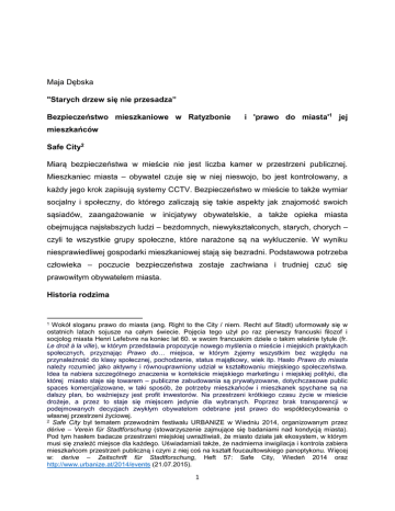 Maja Dębska "Starych drzew się nie przesadza” Bezpieczeństwo mieszkaniowe w Ratyzbonie i 'prawo do miasta'1 jej mieszkańców Safe City2 Miarą bezpieczeństwa w mieście nie jest liczba kamer w przestrzeni publicznej. Mieszkaniec miasta – obywatel czuje się w niej nieswojo, bo jest kontrolowany, a każdy jego krok zapisują systemy CCTV. Bezpieczeństwo w mieście to także wymiar socjalny i społeczny, do którego zaliczają się takie aspekty jak znajomość swoich sąsiadów, zaangażowanie w inicjatywy obywatelskie, a także opieka miasta obejmująca najsłabszych ludzi – bezdomnych, niewykształconych, starych, chorych – czyli te wszystkie grupy społeczne, które narażone są na wykluczenie. W wyniku niesprawiedliwej gospodarki mieszkaniowej stają się bezradni. Podstawowa potrzeba człowieka – poczucie bezpieczeństwa zostaje zachwiana i trudniej czuć się prawowitym obywatelem miasta. Historia rodzima Wokół sloganu prawo do miasta (ang. Right to the City / niem. Recht auf Stadt) uformowały się w ostatnich latach sojusze na całym świecie. Pojęcia tego użył po raz pierwszy francuski filozof i socjolog miasta Henri Lefebvre na koniec lat 60. w swoim francuskim dziele o takim właśnie tytule (fr. Le droit à la ville), w którym przedstawia propozycje nowego myślenia o mieście i miejskich praktykach społecznych, przyznając Prawo do… miejsca, w którym żyjemy wszystkim bez względu na przynależność do klasy społecznej, pochodzenie, status majątkowy, wiek itp. Hasło Prawo do miasta należy rozumieć jako aktywny i równouprawniony udział w kształtowaniu miejskiego społeczeństwa. Idea ta nabiera szczególnego znaczenia w kontekście miejskiego marketingu i miejskiej polityki, dla której miasto staje się towarem – publiczne zabudowania są prywatyzowane, dotychczasowe public spaces komercjalizowane, w taki sposób, że potrzeby mieszkańców i mieszkanek spychane są na dalszy plan, bo ważniejszy jest profit inwestorów. Na przestrzeni krótkiego czasu życie w mieście drożeje, a przez to staje się miejscem jedynie dla wybranych. Poprzez brak transparencji w podejmowanych decyzjach zwykłym obywatelom odebrane jest prawo do współdecydowania o własnej przestrzeni życiowej. 2 Safe City był tematem przewodnim festiwalu URBANIZE w Wiedniu 2014, organizowanym przez dérive – Verein für Stadtforschung (stowarzyszenie zajmujące się badaniami nad kondycją miasta). Pod tym hasłem badacze przestrzeni miejskiej uwrażliwiali, że miasto działa jak ekosystem, w którym musi się znaleźć miejsce dla każdego. Uświadamiali także, że nadmierna inwigilacja i kontrola zabiera mieszkańcom przestrzeń publiczną i czyni z niej coś na kształt foucaultowskiego panoptykonu. Więcej w: derive – Zeitschrift für Stadtforschung, Heft 57: Safe City, Wiedeń 2014 oraz http://www.urbanize.at/2014/events (21.07.2015). 1 1 Punktem wyjścia do napisania poniższego eseju był film Moja Ulica Marcina Latałło, który dostrzega powyższy problem i analizuje go na gruncie łódzkim. Zauważa, że kiedy bogaty inwestor zmienia wydzielony obszar na luksusowe 'high class' i na kawałku postfabrycznego miasta buduje nowe centrum handlu i rozrywki (w tym przypadku Manufaktura), dla jego rdzennego otoczenia zaczyna brakować miejsca. Wyścig z komercją stoi w sprzeczności z osiedlami robotniczymi wybudowanymi w XIX wieku przy zakładach Izraela Poznańskiego, gdzie do tej pory mieszkają ludzie, którzy po upadku przemysłu w Łodzi borykają się z biedą. Miasto Łódź3 stara się dopasować do zagranicznych inwestorów. Zapomina tylko, że jego mieszkańcy nie są na to do końca gotowi. Nie zamieszkają w kamienicy, którą przejmie prywaciarz, bo kilkakrotnie podniesie czynsz, na który ich nie będzie stać. Nawet jeśli Miasto przeprowadzi renowację, to cena za metr kwadratowy również wzrośnie. W najlepszym wypadku zamienią mieszkanie na mniejsze. Często jednak będą zmuszeni przeprowadzić się do innych lokali komunalnych oddalonych od centrum, mieszkań socjalnych albo kwater tymczasowych. O tym, że rewitalizacja nie oznacza jedynie renowacji pamiętają nieliczni urzędnicy, którzy rozumieją, że to magiczne słowo „oprócz remontów przestrzeni publicznych i kamienic, a także oprócz tego, że nasze miasto staje się wizualnie i materialnie piękniejsze, […] oznacza głęboką zmianę społeczną i ożywienie gospodarcze centrum Łodzi” 4 Zabytkowe miasto po drugiej stronie Odry Problem wydaje się dotyczyć przestrzeni miast i społeczeństw, takich jak Łódź - zdegradowanych postindustrialnych molochów, byłych centrów gospodarki socjalistycznej, w których źdźbła trawy przebijają się dziko przez kawałki betonów, miast, w których nikt „nikogo nie głaszcze”5, nie obejmuje mecenatem, przeciętnych turystów nie kusi historią6. Okazuje się jednak, że z podobnymi trudnościami 11 października 2013r. nastąpiła zmiana dotychczas obowiązującej nazwy Urzędu (Urząd Miasta Łodzi) i obowiązuje nowa nazwa: Łódź - Miasto na Prawach Powiatu lub skrócona Miasto Łódź. 4 Hanna Gill-Piątek: Łódź. Magistrat wprowadza program rewitalizacji społecznej centrum miasta, w: http://wyborcza.pl/1,91446,17372380,Lodz__Magistrat_wprowadza_program_rewitalizacji_spolecz nej.html#ixzz3gjQS1Cfr, (23.07.2015). 5 Słowami „Łódź nie głaszcze, ale drażni” kompozytor Artur Zagajewski opowiadał o swoich inspiracjach tożsamością miasta Łodzi, w: Chropowatość dźwięków Łodzi. Wywiad z Arturem Zagajewskim, w: http://www.glissando.pl/wywiady/chropowatosc-dzwiekow-lodzi-1-wywiad-z-arturemzagajewskim/ (23.07.2015). 6 Nie chcę napisać, że miasto Łódź nic nie oferuje. Industrialna historia Łodzi jest unikatowa. Z jej tożsamości wyłania się spójny obraz przestrzeni miejskiej oraz świadomości jej mieszkańców, który krystalizuje się w odczuwaniu i doświadczaniu miasta na poziomie meta, na 