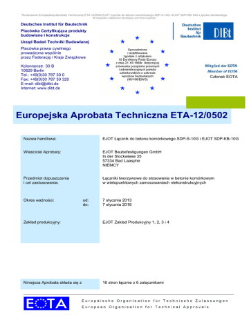 Tłumaczenie Europejskiej Aprobaty Technicznej ETA-12/0502 EJOT Łącznik do betonu komórkowego SDP-S-10G i EJOT SDP-KB-10G z języka niemieckiego. W przypadku wątpliwości decydujący jest tekst oryginału. Deutsches Institut für Bautechnik Placówka Certyfikująca produkty budowlane i konstrukcje Urząd Badań Techniki Budowlanej Placówka prawa cywilnego prowadzona wspólnie przez Federację i Kraje Związkowe Kolonnenstr. 30 B 10829 Berlin Tel.: +49(0)30 787 30 0 Fax: +49(0)30 787 30 320 E-mail: [email protected] Internet: www.dibt.de Członek EOTA Europejska Aprobata Techniczna ETA-12/0502 Nazwa handlowa: EJOT Łącznik do betonu komórkowego SDP-S-10G i EJOT SDP-KB-10G Właściciel Aprobaty: EJOT Baubefestigungen GmbH In der Stockwiese 35 57334 Bad Laasphe NIEMCY Przedmiot dopuszczenia i cel zastosowania: Łączniki tworzywowe do stosowania w betonie komórkowym w wielopunktowych zamocowaniach niekonstrukcyjnych Okres ważności: od: do: 7 stycznia 2013 7 stycznia 2018 Zakład produkcyjny: EJOT Zakład Produkcyjny 1, 2, 3 i 4 Niniejsza Aprobata składa się z 16 stron łącznie z 6 załącznikami Tłumaczenie Europejskiej Aprobaty Technicznej ETA-12/0502 EJOT Łącznik do betonu komórkowego SDP-S-10G i EJOT SDP-KB-10G z języka niemieckiego. W przypadku wątpliwości decydujący jest tekst oryginału. Europejska Aprobata Techniczna ETA-12/0502 I Strona 2 z 16 | 7 stycznia 2013 Podstawy prawne i postanowienia ogólne 1. Niniejsza Europejska Aprobata Techniczna przydzielona została przez niemiecki Instytut Techniki Budowlanej w zgodności z: - Dyrektywą 89/106/EWG Rady Europy z dnia 21 grudnia 1988 dotyczącą zrównania przepisów prawnych 1 i administracyjnych państw członkowskich w zakresie wyrobów budowlanych , zmienioną Dyrektywą 93/68/EWG 2 3 Rady Europy oraz poprzez rozporządzenie (UE) nr 1882/2003 Parlamentu Europejskiego i Rady Europy ; - ustawą o wprowadzeniu do obiegu i wolnym obrocie wyrobami budowlanymi do zastosowania Dyrektywy 89/106/EWG Rady Europy z dnia 21 grudnia 1988 dotyczącej zrównania przepisów prawnych i administracyjnych państw członkowskich w zakresie wyrobów budowlanych oraz innymi aktami prawnymi Wspólnoty Europejskiej 4 (ustawa o wyrobach budowlanych – BauPG) z dn. 28 kwietnia 1998 , ostatnio zmienioną poprzez artykuł 2 ustawy 5 z dnia 8 listopada 2011 ; - Wspólnymi Uregulowaniami w zakresie wnioskowania, przygotowania oraz udzielania Europejskich Aprobat 6 Technicznych zgodnie z załącznikiem do decyzji 94/23/EWG Komisji Europejskiej ; - wytycznymi do Europejskich Aprobat Technicznych „Łączniki tworzywowe do stosowania w betonie i w murach w wielopunktowych zamocowaniach niekonstrukcyjnych – część 5: Łączniki tworzywowe do kotwienia w betonie komórkowym”, ETAG 020-05. 2. Niemiecki Instytut Techniki Budowlanej jest uprawniony do sprawdzenia, czy postanowienia niniejszej Europejskiej Aprobaty Technicznej są spełniane. Kontrola ta może być przeprowadzona w zakładzie produkcyjnym. Posiadacz Europejskiej Aprobaty Technicznej jest odpowiedzialny za zgodność produktów z Europejską Aprobatą Techniczną oraz jej użytecznością dla przewidzianego zakresu zastosowania. 3. Europejska Aprobata Techniczna nie może być przenoszona na innych niż wymieniony na pierwszej stronie Producentów lub przedstawicieli Producentów lub też na inne zakłady produkcyjne niż te wymienione na pierwszej stronie Europejskiej Aprobaty Technicznej. 4. Niemiecki Instytut Techniki Budowlanej może odwołać niniejszą Europejską Aprobatę Techniczną, w szczególności po informacji komisji na podstawie art. 5 ust. 1 Dyrektywy 89/106/EWG. 5. Niniejsza Europejska Aprobata Techniczna może być powielana – także w formie elektronicznej – jedynie w wersji nieskróconej. Po otrzymaniu pisemnej zgody niemieckiego Instytutu Techniki Budowlanej można powielać fragmenty. W takim przypadku jednak należy zaznaczyć, że chodzi tylko o fragmenty. Teksty i rysunki broszur reklamowych nie mogą stać w sprzeczności z Europejską Aprobatą Techniczną, ani też używać jej niezgodnie z jej przeznaczeniem. 6. Europejska Aprobata Techniczna udzielona zostaje w języku urzędowym obowiązującym daną Jednostkę Certyfikującą. Wersja ta odpowiada wersji udzielonej przez EOTA. Tłumaczenia na inne języki powinny zawierać odpowiednią adnotację i być oznaczone, jako tłumaczenia. 1 Dziennik Ustaw Wspólnoty Europejskiej L40 z dnia 11 lutego 1989, str. 12 Dziennik Ustaw Wspólnoty Europejskiej L220 z dnia 30 sierpnia 1993, str. 1 Dziennik Ustaw Unii Europejskiej L284 z dnia 31 października 2003, str. 25 4 Federalny Dziennik Ustaw część I 1998, str. 812 5 Federalny Dziennik Ustaw część I 2011, str. 2178 6 Dziennik Ustaw Wspólnoty Europejskiej L17 z dnia 20 stycznia 1994, str. 34 2 3 Tłumaczenie Europejskiej Aprobaty Technicznej ETA-12/0502 EJOT Łącznik do betonu komórkowego SDP-S-10G i EJOT SDP-KB-10G z języka niemieckiego. W przypadku wątpliwości decydujący jest tekst oryginału. Europejska Aprobata Techniczna ETA-12/0502 Strona 3 z 16 | 7 stycznia 2013 II Postanowienia szczególne Europejskiej Aprobaty Technicznej 1. Opis produktu budowlanego i cel zastosowania 1.1 Opis produktu Łącznik do betonu komórkowego SDP-S i SDP-KB firmy EJOT składa się z korpusu tworzywowego z poliamidu oraz przynależnej do kompletu specjalnej śruby ze stali cynkowanej galwanicznie lub ze stali nierdzewnej. Część tworzywowa rozpierana jest w wyniku wkręcenia śruby, tym samym następuje docisk strefy rozporowej do ścianek otworu wierconego. W załączniku nr 1 przedstawiono łącznik w postaci zmontowanej. 1.2 Cel zastosowania Łącznik przewidziany jest do zastosowań, w ramach, których należy spełnić wymagania dotyczące wytrzymałości mechanicznej w rozumieniu ważnych wymagań 4 Dyrektywy 89/106/EWG oraz w przypadku, gdy uszkodzenie łącznika może doprowadzić do wystąpienia bezpośredniego zagrożenia życia, bądź zdr
