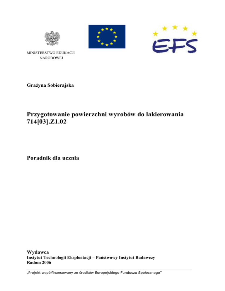 MINISTERSTWO EDUKACJI NARODOWEJ Grażyna Sobierajska Przygotowanie powierzchni wyrobów do lakierowania 714[03].Z1.02 Poradnik dla ucznia Wydawca Instytut Technologii Eksploatacji – Państwowy Instytut Badawczy Radom 2006 „Projekt współfinansowany ze środków Europejskiego Funduszu Społecznego” Recenzenci: mgr inż. Krzysztof Garczyński mgr inż. Krzysztof Lenkiewicz Opracowanie redakcyjne: mgr inż. Grażyna Sobierajska Konsultacja: mgr Zenon W. Pietkiewicz Korekta: Poradnik stanowi obudowę dydaktyczną programu jednostki modułowej 714[03].L1.02. „Przygotowanie powierzchni wyrobów do lakierowania” w modułowym programie nauczania dla zawodu lakiernik. Wydawca Instytut Technologii Eksploatacji – Państwowy Instytut Badawczy, Radom 2006 „Projekt współfinansowany ze środków Europejskiego Funduszu Społecznego” 1 SPIS TREŚCI 1. 2. 3. 4. Wprowadzenie Wymagania wstępne Cele kształcenia Materiał nauczania 4.1. Ogólne zasady przygotowywania powierzchni przed procesami lakierowania. 4.1.1. Materiał nauczania 4.1.2. Pytania sprawdzające 4.1.3. Ćwiczenia 4.1.4. Sprawdzian postępów 4.2. Oczyszczanie strumieniowo – ścierne 4.2.1. Materiał nauczania 4.2.2. Pytania sprawdzające 4.2.3. Ćwiczenia 4.2.4. Sprawdzian postępów 4.3. Oczyszczanie przez: skrobanie 4.3.1. Materiał nauczania 4.3.2. Pytania sprawdzające 4.3.3. Ćwiczenia 4.3.4. Sprawdzian postępów 4.4. Oczyszczanie ręczne i ręczno- mechaniczne 4.4.1. Materiał nauczania 4.4.2. Pytania sprawdzające 4.4.3. Ćwiczenia 4.4.4. Sprawdzian postępów 4.5. Oczyszczanie płomieniowe i oczyszczanie parowe 4.5.1. Materiał nauczania 4.5.2. Pytania sprawdzające 4.5.3. Ćwiczenia 4.5.4. Sprawdzian postępów 4.6. Odtłuszczanie w rozpuszczalnikach organicznych. Odtłuszczanie w roztworach alkalicznych. Odtłuszczanie emulsyjne 4.6.1. Materiał nauczania 4.6.2. Pytania sprawdzające 4.6.3. Ćwiczenia 4.6.4. Sprawdzian postępów 4.7. Oczyszczanie przy pomocy odrdzewiaczy fosforanowych ( odrdzewiacze – preparaty handlowe) 4.7.1. Materiał nauczania 4.7.2. Pytania sprawdzające 4.7.3. Ćwiczenia 4.7.4. Sprawdzian postępów 4.8. Usuwanie rdzy w kąpieliskach trawiących 4.8.1. Materiał nauczania 4.8.2. Pytania sprawdzające 4.8.3. Ćwiczenia „Projekt współfinansowany ze środków Europejskiego Funduszu Społecznego” 2 4 6 7 8 8 8 9 10 10 11 11 12 12 13 14 14 14 14 15 16 16 16 16 17 18 18 18 18 19 20 20 21 21 21 22 22 23 23 23 24 24 24 24 4.8.4. Sprawdzian postępów 4.9. Oczyszczanie z zastosowaniem przetwarzaczy rdzy 4.9.1. Materiał nauczania 4.9.2. Pytania sprawdzające 4.9.3. Ćwiczenia 4.9.4. Sprawdzian postępów 4.10. Technologia fosforanowania wyrobów wielkogabarytowych ( np. nadwozi samochodowych) 4.10.1. Materiał nauczania 4.10.2. Pytania sprawdzające 4.10.3. Ćwiczenia 4.10.4. Sprawdzian postępów 4.11. Suszenie w suszarkach 4.11.1. Materiał nauczania 4.11.2. Pytania sprawdzające 4.11.3. Ćwiczenia 4.11.4. Sprawdzian postępów 4.12. Technologia przygotowania powierzchni w zależności od podłoża 4.12.1. Materiał nauczania 4.12.2. Pytania sprawdzające 4.12.3. Ćwiczenia 4.12.4. Sprawdzian postępów 4.13. Przygotowanie powierzchni stali i metali nieżelaznych 4.13.1. Materiał nauczania 4.13.2. Pytania sprawdzające 4.13.3. Ćwiczenia 4.13.4. Sprawdzian postępów 4.14. Usuwanie powłok lakierniczych 4.14.1. Materiał nauczania 4.14.2. Pytania sprawdzające 4.14.3. Ćwiczenia 4.14.4. Sprawdzian postępów 5. Sprawdzian osiągnięć 6. Literatura „Projekt współfinansowany ze środków Europejskiego Funduszu Społecznego” 3 25 26 26 26 26 27 28 28 28 29 29 30 30 31 32 32 33 33 33 33 34 35 35 41 41 42 43 43 43 43 44 45 51 1. WPROWADZENIE Poradnik niniejszy będzie Ci pomocny w przyswajaniu wiedzy o przygotowaniu powierzchni wyrobów do lakierowania. Poradnik ten zawiera: – wymagania wstępne, czyli wykaz niezbędnych umiejętności i wiadomości, które powinieneś mieć opanowane, aby przystąpić do realizacji tej jednostki modułowej, – cele kształcenia jednostki modułowej, – materiał nauczania umożliwiający samodzielne przygotowanie się do wykonania ćwiczeń i zaliczenia sprawdzianów. Jest to „pigułka” wiadomości teoretycznych niezbędnych do opanowania treści jednostki modułowej. Rozdział ten zawiera także: – pytania sprawdzające wiedzę potrzebną do wykonania ćwiczenia, – ćwiczenia, opis ich wykonania wraz z wykazem materiałów, narzędzi i sprzętu potrzebnych realizacji, – sprawdzian postępów pozwalający ocenić stopień opanowania materiału, – sprawdzian osiągnięć, przykładowy zestaw zadań. Pozytywny wynik sprawdzianu potwierdzi, że dobrze pracowałeś podczas lekcji i że nabrałeś wiedzy i umiejętności z zakresu tej jednostki modułowej, – literaturę. Jeżeli masz trudności ze zrozumieniem tematu lub ćwiczenia, to poproś nauczyciela lub instruktora o wyjaśnienie i ewentualne sprawdzenie, czy dobrze wykonujesz daną czynność. Po przerobieniu materiału spróbuj zaliczyć sprawdzian z zakresu jednostki modułowej. Jednostka modułowa: Przygotowywanie powierzchni wyrobów do lakierowania, której treści teraz poznasz jest jednym z modułów koniecznych do zapoznania się z procesem wytwarzania pokryć i powłok lakierniczych. Bezpieczeństwo i higiena pracy W czasie pobytu w pracowni musisz przestrzegać regulaminy, przepisy bezpieczeństwa i higieny pracy oraz instrukcje przeciwpożarowe, wynikające z rodzaju wykonywanych prac. Przepisy te poznasz podczas trwania nauki. „Projekt współfinansowany ze środków Europejskiego Funduszu Społecznego” 4 714 [03].Z1 Podstawowe technologie lakiernicze 714 [03].Z1.01 Stosowanie przepisów bhp, ochrony ppoż. i ochrony środowiska przy wykonywaniu prac lakierniczych 714 [03].Z1.02 Przygotowanie powierzchni wyrobów do lakierowania 714 [03].Z1.03 Nakładanie powłok lakierniczych 714 [03].Z1.04 Wytwarzanie powłok malarsko – lakierniczych na wyrobach powszechneg