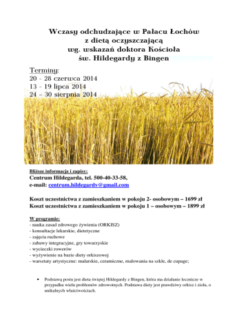 Wczasy odchudzające w Pałacu Łochów z dietą oczyszczającą wg. wskazań doktora Kościoła św. Hildegardy z Bingen Terminy: 20 - 28 czerwca 2014 13 - 19 lipca 2014 24 – 30 sierpnia 2014 Bliższe informacje i zapisy: Centrum Hildegarda, tel. 500-40-33-58, e-mail: [email protected] Koszt uczestnictwa z zamieszkaniem w pokoju 2- osobowym – 1699 zł Koszt uczestnictwa z zamieszkaniem w pokoju 1 – osobowym – 1899 zł W programie: - nauka zasad zdrowego żywienia (ORKISZ) - konsultacje lekarskie, dietetyczne - zajęcia ruchowe - zabawy integracyjne, gry towarzyskie - wycieczki rowerów - wyżywienie na bazie diety orkiszowej - warsztaty artystyczne: malarskie, ceramiczne, malowania na szkle, de cupage; • Podstawą postu jest dieta świętej Hildegardy z Bingen, która ma działanie lecznicze w przypadku wielu problemów zdrowotnych. Podstawa diety jest prawdziwy orkisz i zioła, o unikalnych właściwościach. • Dieta odmładza i odkwasza organizm, znakomicie wspomaga oczyszczenie narządów wewnętrznych z toksyn i złogów. • Post oparty na ziołach i orkiszu, jest wprowadzeniem w Polsce wieloletnich doświadczeń lekarzy niemieckich i austriackich, którzy z powodzeniem stosują od wielu lat medycynę hildegardową. Zdumiewające wyniki leczenia przez zmianę diety i zastosowanie hildegardowych wskazówek opisywane są w wielu publikacjach, dostępnych już w języku polskim. • Stosowanie diety hildegardowej poprawia stan fizyczny i psychiczny organizmu - Obecny w orkiszu aminokwas tryptofan, ma wpływ na poprawę nastroju - już po kilku dniach widoczne są niezwykle efekty. • Cennym elementem postu jest możliwość diagnostyki lekarskiej podczas całego turnusu. Obecny podczas całego tygodnia lekarz medycyny– specjalista medycyny hildegardowej – szczegółowo diagnozuje każdego z uczestników i określa kształt dalszej terapii. Wskazuje problemy i proponuje działania profilaktyczne. • Wielkie znaczenie mają zabiegi oczyszczające i przywracające zdrowie oraz kondycję skóry i narządów wewnętrznych. ********************************************************************************** Skutki tygodniowego postu orkiszowego: * Oczyszczenie organizmu * przypływ energii i sił witalnych * zdrowie i szczupła sylwetka * otrzymanie programu utrzymania zdrowia i diety * diagnostyka lekarska ********************************************************************************** Zabiegi wspomagające oczyszczenie i odmłodzenie organizmu: 1. Relaksujące okłady i masaże 2. Oczyszczanie jelit 3. Odkwaszanie organizmu 4. Okłady lecznicze 5. Gimnastyka rozciągająca 6. Sauna kasztanowa 7. Okłady likwidujące bóle kręgosłupa Szczegółowy plan pobytu: DZIEŃ 1 (niedziela) 14.30 przyjazd Gości 15.00 powitanie Gości, przedstawienie personelu, przedstawienie harmonogramu, miejsc, w których będą prowadzone zajęcia, wykłady, zabiegi SPA. 15.30 wywiad zdrowotny - lekarz, dietetyk 19.00 kolacja - krótki zarys historii Pałacu i okolic, zabawa integracyjna 22.00 capstrzyk DZIEŃ 2 (poniedziałek) 7 .00 rozruch poranny 8.30 śniadanie 9.30-11.15 wykład hildegardowy z przerwą na herbatę ziołową i ciasteczka orkiszowe 11.30-13.30 wycieczka rowerowa, tenis, hipoterapia (po wcześniejszych zapisach) 13.30 obiad 14.00 - 15.30 relaks i okłady leczniczo-relaksacyjne 15.30 - 17.00 zajęcia ruchowe (spacer nordic walking) 17.15 - 17.30 kawa orkiszowa + przekąski orkiszowe 17.30-19.00 prezentacja medycyny hildegardowej 19.00 kolacja 19.30 propozycja zabiegów kosmetyczno-leczniczo-relaksacyjnych (po wcześniejszych zapisach) Filmy, gry towarzyskie 22.00 capstrzyk DZIEŃ 3 (wtorek) 7.00 poranny rozruch 8.30 śniadanie w SPA 9.30-11.15 wykład z przerwą na herbatę ziołową i ciasteczka orkiszowe 11.30-13.13 warsztaty ceramiczne 13.30 obiad 14.00-15.30 relaks i okłady leczniczo-relaksacyjne 15.30 - 17.00 zajęcia ruchowe 17.15 - 17.30 kawa orkiszowa + przekąski orkiszowe 17.30-19.00 prezentacja medycyny hildegardowej 19.00 kolacja Propozycja zabiegów kosmetyczno-leczniczo-relaksacyjnych wcześniejszych zapisach) Filmy, gry towarzyskie 22.00 capstrzyk DZIEŃ 4 (środa) 7.00 poranny rozruch 8.30 śniadanie 9.30-11.15 wykłady z przerwą na herbatę ziołową i ciasteczka orkiszowe 11.30-13.30 warsztaty malarskie 13.30 obiad 14.00-15.30 relaks + okłady relaksacyjne 15.30 - 17.00 zajęcia ruchowe 17.15 - 17.30 kawa orkiszowa + przekąski orkiszowe 17.30-19.00 prezentacja medycyny hildegardowej 19.00 kolacja Propozycja zabiegów kosmetyczno-leczniczo-relaksacyjnych w SPA (po wcześniejszych zapisach) Filmy, gry towarzyskie 22.00 capstrzyk DZIEŃ 5 (czwartek) w SPA (po 7.00 rozruch poranny 8.30 śniadanie 9.30-11.15 wykłady z przerwą na herbatę ziołową + ciasteczka orkiszowe 11.30-13.30 warsztaty malowania na szkle 13.30 obiad 14.00-15.30 relaks + okłady relaksacyjne 15.30 - 17.00 zajęcia ruchowe 17.15 - 17.30 kawa orkiszowa + przekąski orkiszowe 17.30-19.00 prezentacja medycyny hildegardowej 19.00 kolacja Propozycja zabiegów kosmetyczno-leczniczo-relaksacyjnych wcześniejszych zapisach) w SPA (po w SPA (po Filmy, gry towarzyskie 22.00 capstrzyk DZIEŃ 6 (piątek) 7.00 rozruch poranny 8.30 śniadanie 9.30-11.15 wykłady z przerwą na herbatę ziołową + ciasteczka orkiszowe 11.30-13.30 warsztaty de cupage 13.30 obiad 14.00-15.30 relaks + okłady relaksacyjne 15.30 - 17.00 zajęcia ruchowe 17.15 - 17.30 kawa orkiszowa + przekąski orkiszowe 17.30 - 19.00 prezentacja medycyny hildegardowej 19.00 kolacja Propozycja zabiegów kosmetyczno-leczniczo-relaksacyjnych wcześniejszych zapisach) Filmy, gry towarzyskie 22.00 capstrzyk DZIEŃ 7 (sobota) 8.00 śniadanie 8.45 oficjalne zakończenie turnusu, podziękowania, podsumowania wyników, przekazanie zaleceń żywieniowych 9.30-10.00 wyjazd Gości