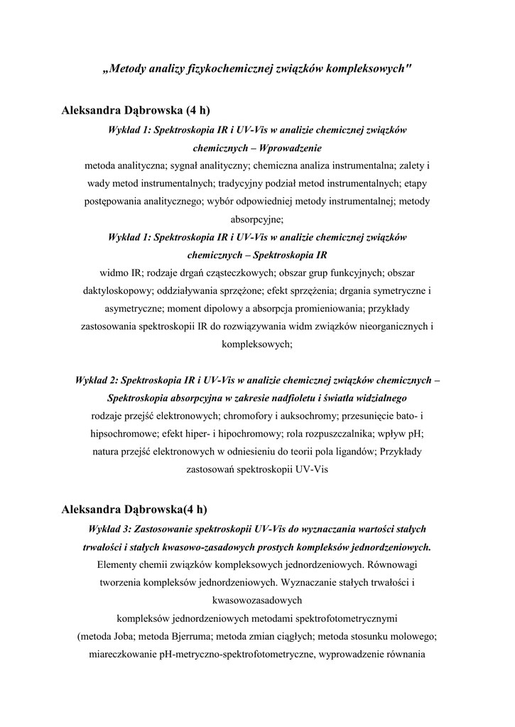 „Metody analizy fizykochemicznej związków kompleksowych" Aleksandra Dąbrowska (4 h) Wykład 1: Spektroskopia IR i UV-Vis w analizie chemicznej związków chemicznych – Wprowadzenie metoda analityczna; sygnał analityczny; chemiczna analiza instrumentalna; zalety i wady metod instrumentalnych; tradycyjny podział metod instrumentalnych; etapy postępowania analitycznego; wybór odpowiedniej metody instrumentalnej; metody absorpcyjne; Wykład 1: Spektroskopia IR i UV-Vis w analizie chemicznej związków chemicznych – Spektroskopia IR widmo IR; rodzaje drgań cząsteczkowych; obszar grup funkcyjnych; obszar daktyloskopowy; oddziaływania sprzężone; efekt sprzężenia; drgania symetryczne i asymetryczne; moment dipolowy a absorpcja promieniowania; przykłady zastosowania spektroskopii IR do rozwiązywania widm związków nieorganicznych i kompleksowych; Wykład 2: Spektroskopia IR i UV-Vis w analizie chemicznej związków chemicznych – Spektroskopia absorpcyjna w zakresie nadfioletu i światła widzialnego rodzaje przejść elektronowych; chromofory i auksochromy; przesunięcie bato- i hipsochromowe; efekt hiper- i hipochromowy; rola rozpuszczalnika; wpływ pH; natura przejść elektronowych w odniesieniu do teorii pola ligandów; Przykłady zastosowań spektroskopii UV-Vis Aleksandra Dąbrowska(4 h) Wykład 3: Zastosowanie spektroskopii UV-Vis do wyznaczania wartości stałych trwałości i stałych kwasowo-zasadowych prostych kompleksów jednordzeniowych. Elementy chemii związków kompleksowych jednordzeniowych. Równowagi tworzenia kompleksów jednordzeniowych. Wyznaczanie stałych trwałości i kwasowozasadowych kompleksów jednordzeniowych metodami spektrofotometrycznymi (metoda Joba; metoda Bjerruma; metoda zmian ciągłych; metoda stosunku molowego; miareczkowanie pH-metryczno-spektrofotometryczne, wyprowadzenie równania Hendresona-Hasselbacha). Przykłady. Wykład 4: Zastosowanie potencjometrii do wyznaczania wartości stałych równowag reakcji kompleksowania. Elementy chemii związków kompleksowych jedno- i wielordzeniowych. Równowagi tworzenia kompleksów jedno- i wielordzeniowych. Wyznaczanie stałych trwałości kompleksów jednordzeniowych metodami potencjometrycznymi (metody bezpośrednie; metody oparte na pomiarach pH). Przykłady. Joanna Makowska (4 h) Wykład 5: Zastosowanie metod chemii teoretycznej do przewidywania krzywych miareczkowania. Przedmiotem dwugodzinnego wykładu będzie omówienie teoretycznych metod umożliwiających badanie wpływu wartości pH oraz rodzaju rozpuszczalnika na konformację modelowych peptydów oraz próba znalezienia jak najlepszego sposobu do przewidywania przebiegu krzywych miareczkowania potencjometrycznego oraz wyznaczania stałych pKa dla układów peptydowych. 1. Wprowadzenie na temat struktury peptydów i białek z opisem występujących w nich równowag kwasowo-zasadowych. 2. Wyjaśnienie roli pH w stabilizacji polipeptydów i białek na przykładzie badań konformacyjnych peptydów opartych o sekwencję oligoalaniny w zależności od pH środowiska. 3. Uwzględnienie pH w obliczeniach konformacyjnych; 4. Uwzględnienie stopnia jonizacji grup bocznych w obliczeniach; a) metoda oparta o model solwatacyjny Poissona-Boltzmanna; b) metoda oparta o dynamikę molekularną i model solwatacyjny GeneralizedBorna. 5. Obliczanie teoretycznych krzywych potencjometrycznych dla wybranych sekwencji peptydowych przy zastosowaniu metody wykorzystującej model solwatacyjny oparty o równanie Poissona-Boltzmanna. Porównanie uzyskanych wyników z eksperymentem (wyniki eksperymentalne z miareczkowania potencjometrycznego). Wykład 6: Badanie przemian fazowych w związkach biologicznie czynnych przy użyciu różnicowej kalorymetrii skaningowej. Przedmiotem dwugodzinnego wykładu będzie omówienie różnicowej kalorymetrii skaningowej jako metody wykorzystywanej w analizie przemian termicznych układów biologicznych, np. białek, kwasów nukleinowych, kompleksów biologicznie czynnych, w celu określenia: temperatury topnienia biomakrocząsteczek, parametrów termodynamicznych związanych z procesem denaturacji, jak również wpływu mutacji punktowych na stabilność białek oraz ich pochodnych. 1. Metoda pomiaru DSC 2. Zastosowanie praktyczne eksperymentu DSC 3. Pojemność cieplna białek 4. Termiczne rozfałdowanie białka 5. Specyfika termicznych przemian konformacyjnych w wybranych układach biologicznych 6. Charakterystyka DSC termicznej przemiany pomiędzy stanem natywnym i denaturowanym na przykładzie wybranego białka (interpretacja wyników). 7. Analiza matematyczna krzywych DSC (interpretacja wyników). Dariusz Wyrzykowski (4 h) Wykład 7: Zastosowanie metod analizy termicznej w badaniu związków chemicznych - aspekty teoretyczne i praktyczne. 1. Definicje nazw i skrótów stosowanych w analizie termicznej. 2. Podział metod termoanalitycznych. 3. Termograwimetria, różnicowa analiza termiczna, różnicowa kalorymetria skaningowa – schematy układów pomiarowych, idea pomiaru, interpretacja wyników. 4. Metody analizy termicznej połączone z analizą produktów gazowych. Detekcja produktów gazowych za pomocą spektroskopii w podczerwieni oraz spektrometrii masowej. 5. Badania rozkładów termicznych związków koordynacyjnych. 6. Zastosowanie metod analizy termicznej do badania materiałów budowlanych, produktów żywnościowych oraz substancji farmaceutycznych. Wykład 8: Badania trwałości termodynamicznej związków kompleksowych metodą izotermicznego miareczkowania kalorymetrycznego. 1. Kalorymetria. Efekty energetyczne towarzyszące przebiegowi procesów fizycznych i chemicznych. 2. Izotermiczny kalorymetr miareczkowy – schemat budowy i zasada pomiaru. 3. Parametry termodynamiczne reakcji kompleksowania. 4. Przygotowanie próbek. Sposób przeprowadzenia eksperymentu. 5. Interpretacja wyników miareczkowania kalorymetrycznego. 6. Przykłady zastosowań metody miareczkowania kalorymetrycznego do badania trwał