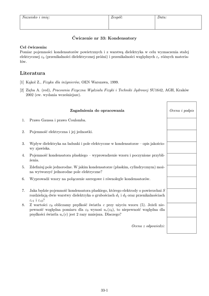 Nazwisko i imię: Zespół: Data: Ćwiczenie nr 33: Kondensatory Cel ćwiczenia: Pomiar pojemności kondensatorów powietrznych i z warstwą dielektryka w celu wyznaczenia stałej elektrycznej ε0 (przenikalności dielektrycznej próżni) i przenikalności względnych εr różnych materiałów. Literatura [1] Kąkol Z., Fizyka dla inżynierów, OEN Warszawa, 1999. [2] Zięba A. (red), Pracownia Fizyczna Wydziału Fizyki i Techniki Jądrowej SU1642, AGH, Kraków 2002 (ew. wydania wcześniejsze). Ocena i podpis Zagadnienia do opracowania 1. Prawo Gaussa i prawo Coulomba. 2. Pojemność elektryczna i jej jednostki. 3. Wpływ dielektryka na ładunki i pole elektryczne w kondensatorze – opis jakościowy zjawiska. 4. Pojemność kondensatora płaskiego – wyprowadzenie wzoru i poczynione przybliżenia. 5. Zdefiniuj pole jednorodne. W jakim kondensatorze (płaskim, cylindrycznym) można wytworzyć jednorodne pole elektryczne? 6. Wyprowadź wzory na połączenie szeregowe i równoległe kondensatorów. 7. Jaka będzie pojemność kondensatora płaskiego, którego elektrody o powierzchni S rozdzielają dwie warstwy dielektryka o grubościach d1 i d2 oraz przenikalnościach εr1 i εr2 ? Z wartości ε0 obliczamy prędkość światła c przy użyciu wzoru (5). Jeżeli niepewność względna pomiaru dla ε0 wynosi ur (ε0 ), to niepewność względna dla prędkości światła ur (c) jest 2 razy mniejsza. Dlaczego? 8. Ocena z odpowiedzi: 33-1 1 Opracowanie ćwiczenia Opracuj i opisz zagadnienia nr i podpis: 33-2 2 Oznaczenia, podstawowe definicje i wzory Q – ładunek elektryczny, U – napięcie, C – pojemność, εr – przenikalność dielektryczna, D – średnica okładki kondensatora (rys. 33-1), S – powierzchnia okładki kondensatora, Dp – średnica przekładki (rys.33-1), Sp – powierzchnia przekładki, d – odległość między okładkami, (Cd)extr – ekstrapolowana wartość iloczynu Cd (rys.33-3), R – promień zewnętrznej okładki kondensatora cylindrycznego (rys.33-2), r – promień wewnętrznej okładki kondensatora cylindrycznego, l – długość kondensatora cylindrycznego, c – prędkość światła w próżni, ε0 = 8, 854 · 10−12 F/m – stała elektryczna (dawniej: przenikalność elektryczna próżni), µ0 = 4π · 10−7 Vs/(Am) – stała magnetyczna (dawniej: przenikalność magnetyczna próżni), Uwaga: Zgodnie z niedawnymi decyzjami ISO (International Organisation for Standardization) oraz IEC (International Electrotechnical Commission) wprowadzono terminy stała magnetyczna i stała elektryczna (ang. magnetic constant, electric constant) jako podstawowe nazwy stałych ε0 i µ0 . Tradycyjne terminy „przenikalność magnetyczna próżni” i „przenikalność elektryczna próżni” pozostają nazwami pomocniczymi. Nowe nazwy lepiej odzwierciedlają sens fizyczny symboli ε0 i µ0 – nie mają one nic wspólnego z fizycznymi własnościami próżni, zostały wprowadzone do równań elektromagnetyzmu po to, aby uzyskać wygodną dla człowieka wielkość jednostki prądu (1 A) i jednostek pochodnych (1 V, 1 Ω ). Schemat układu pomiarowego Rysunek 33-1: Kondensator płaski z zaznaczonym polem elektrycznym. Rysunek 33-2: Kabel koncentryczny jako kondensator cylindryczny. Definicja pojemności elektrycznej C= Q U 33-3 (1) Pojemność kondensatora płaskiego ε0 εr S d Pojemność kondensatora powietrznego z trzema przekładkami, (rys. 33-1) C= C= ε0 (S − 3S p ) d +3 ε 0 ε r Sp d (2) (3) gdzie S = πD2 /4, Sp = πDp 2 /4 Wzór końcowy na stałą elektryczną (wynik przekształcenia wzoru 3) ε0 = 4 (Cd)extr 2 π D + 3(εr −1)Dp 2 (4) Związek stałej elektrycznej i magnetycznej z prędkością światła w próżni c= √ 1 ε0 µ0 (5) Pojemność kondensatora cylindrycznego C= 3 2πε0 εr l R ln r (6) Wykonanie ćwiczenia 1. Włącz miernik LCR do sieci za pośrednictwem miniaturowego zasilacza. Nastaw zakres 200 pF. Jeżeli wskazania miernika różnią się od zera więcej niż 0,2 pF wtedy przyrząd należy wyzerować. Zerowanie wykonaj dla miernika z dołączonymi przewodami zakończonymi „krokodylkami”. 2. Zestaw kondensator z płyt (ustawiaj dokładnie jedną nad drugą) i trzech pojedynczych izolacyjnych przekładek. Wyniki pomiarów d1 , d2 , d3 i C oraz obliczone wartości d i Cd zanotuj w tabeli 1. Uwaga: krążki przekładkowe posiadają jednakową średnicę, natomiast ich grubości różnią się ze względu na fluktuacje grubości płyty pleksiglasowej, z której zostały wytoczone. Dlatego mierzymy (śrubą mikrometryczną) indywidualne grubości krążków d1 , d2 , d3 , i do dalszych obliczeń bierzemy wartość średnią. Podczas pomiaru wartości C odsunąć ręce od układu, gdyż dotykanie mierzonego kondensatora powoduje zauważalny wzrost pojemności! 3. Pomiar pojemności powtórz dla wzrastającej liczby 2,3,4,5... przekładek w każdym z trzech słupków krążków (rys. 1). Nie mierz grubości pojedynczych krążków, lecz całych słupków, użytych do budowy kondensatora. 4. Na zakończenie powtórz pomiar dla kondensatora z pojedynczymi przekładkami. 5. Zmierz pojemności kondensatorów zestawionych z okładek metalowych rozdzielonych płytami wykonanymi z różnych dielektryków. 6. Zmierz pozostałe wymiary geometryczne potrzebne dla obliczenia ε0 i µ0 . 7. Dla odcinka kabla koncentrycznego zmierz jego pojemność i niezbędne wymiary geometryczne. 33-4 4 Wyniki pomiarów Pomiar 1: Kondensator płaski – wyznaczenie ε0 . Pomiar pojemności kondensatora w funkcji odległości elektrod. Tabela 1 Liczba przekładek 1 d1 [mm] d2 [mm] d3 [mm] d = (d1 + d2 + d3 )/3 [mm] C [pF] Cd [mm·pF] 2 3 4 5 6 Średnica kondensatora D = ....... ... Średnica przekładki Dp = ....... ... Pomiar 2: Kondensator płaski z dielektrykami. Tabela 2 Materiał d [mm] C [nF] Średnica zewnętrzna 2R – ............. .... Średnica wewnętrzna 2r – ............. .... Długość l – ............. .... podpis: 5 Opracowanie wyn