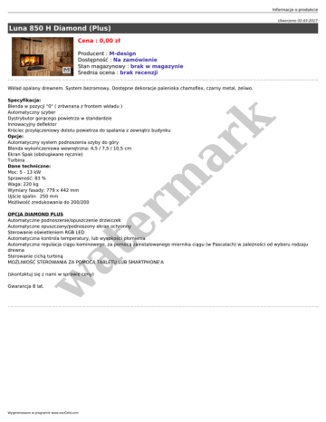 Informacje o produkcie Utworzono 02-03-2017 Luna 850 H Diamond (Plus) Cena : 0,00 zł Producent : M-design Dostępność : Na zamówienie Stan magazynowy : brak w magazynie Średnia ocena : brak recenzji Wkład opalany drewnem. System bezramowy. Dostępne dekoracje paleniska chamoflex, czarny metal, żeliwo. er m ar k Specyfikacja: Blenda w pozycji "0" ( zrównana z frontem wkładu ) Automatyczny szyber Dystrybutor gorącego powietrza w standardzie Innowacyjny deflektor Króciec przyłączeniowy dolotu powietrza do spalania z zewnątrz budynku Opcje: Automatyczny system podnoszenia szyby do góry Blenda wykończeniowa wewnętrzna: 4,5 / 7,5 / 10,5 cm Ekran Spak (obsługiwane ręcznie) Turbina Dane techniczne: Moc: 5 - 13 kW Sprawność: 83 % Waga: 220 kg Wymiary fasady: 779 x 442 mm Ujście spalin: 250 mm Możliwość zredukowania do 200/200 at OPCJA DIAMOND PLUS Automatyczne podnoszenie/opuszczenie drzwiczek Automatyczne opuszczany/podnoszony ekran ochronny Sterowanie oświetleniem RGB LED Automatyczna kontrola temperatury, lub wysokości płomienia Automatyczna regulacja ciągu kominowego, za pomocą zainstalowanego miernika ciągu (w Pascalach) w zależności od wyboru rodzaju drewna Sterowanie cichą turbiną MOŻLIWOŚĆ STEROWANIA ZA POMOCĄ TABLETU LUB SMARTPHONE'A w (skontaktuj się z nami w sprawie ceny) Gwarancja 8 lat. Wygenerowano w programie www.oscGold.com