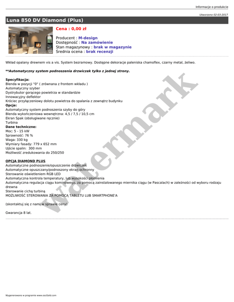 Informacje o produkcie Utworzono 02-03-2017 Luna 850 DV Diamond (Plus) Cena : 0,00 zł Producent : M-design Dostępność : Na zamówienie Stan magazynowy : brak w magazynie Średnia ocena : brak recenzji Wkład opalany drewnem vis a vis. System bezramowy. Dostępne dekoracje paleniska chamoflex, czarny metal, żeliwo. **Automatyczny system podnoszenia drzwiczek tylko z jednej strony. er m ar k Specyfikacja: Blenda w pozycji "0" ( zrównana z frontem wkładu ) Automatyczny szyber Dystrybutor gorącego powietrza w standardzie Innowacyjny deflektor Króciec przyłączeniowy dolotu powietrza do spalania z zewnątrz budynku Opcje: Automatyczny system podnoszenia szyby do góry Blenda wykończeniowa wewnętrzna: 4,5 / 7,5 / 10,5 cm Ekran Spak (obsługiwane ręcznie) Turbina Dane techniczne: Moc: 5 - 15 kW Sprawność: 76 % Waga: 330 kg Wymiary fasady: 779 x 652 mm Ujście spalin: 300 mm Możliwość zredukowania do 250/250 w at OPCJA DIAMOND PLUS Automatyczne podnoszenie/opuszczenie drzwiczek Automatyczne opuszczany/podnoszony ekran ochronny Sterowanie oświetleniem RGB LED Automatyczna kontrola temperatury, lub wysokości płomienia Automatyczna regulacja ciągu kominowego, za pomocą zainstalowanego miernika ciągu (w Pascalach) w zależności od wyboru rodzaju drewna Sterowanie cichą turbiną MOŻLIWOŚĆ STEROWANIA ZA POMOCĄ TABLETU LUB SMARTPHONE'A (skontaktuj się z nami w sprawie ceny) Gwarancja 8 lat. Wygenerowano w programie www.oscGold.com