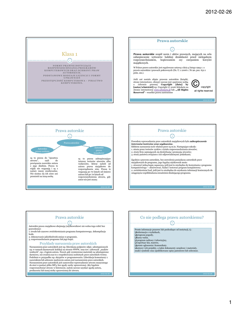 2012-02-26 Prawa autorskie 2 Klasa 1 Prawa autorskie zespół norm i aktów prawnych, mających na celu zabezpieczenie wytworów ludzkiej działalności przed nielegalnym rozpowszechnianiem, kopiowaniem czy czerpaniem korzyści majątkowych. 1 N ORM Y PRAW N E D OTYCZĄCE R OZP OW S ZECHN IANIA P R OGR AM ÓW KOM PU TEROWYCH ORAZ OCHRONY PRAW AU TORSKICH. P OD S TAW OW E R OD ZAJE LICEN CJ I I FOR M Y U PRAWNIEŃ PRZES TĘPCZOŚ Ć KOM PU TEROW A – PIRACTW O KOM PU TEROWE. W Polsce prawo autorskie jest regulowane ustawą z dnia 4 lutego 1994 r. o prawie autorskim i prawach pokrewnych (Dz. U. z 2006 r. Nr 90, poz. 631 z późn. zm.). Jeśli coś zostało objęte prawem autorskim (książki, strony internetowe, obrazy) zawsze jest opatrzone notką o ochronie prawnej Copyright [data] by [autor/właściciel] np. Copyright © 2006 Scholaris na stronie internetowej www.scholaris.pl lub .„All Rights Reserved” - wszelkie prawa zastrzeżone 2012-02-26 Prawa autorskie Prawa autorskie 4 3 Prawa autorskie Autorskie prawa majątkowe Autorskie prawa osobiste są to prawa do "ojcostwa utworu", czyli do powiązania nazwiska autora z jego dziełem. Prawa te nigdy nie wygasają i są z natury rzeczy niezbywalne. Nie można się ich zrzec ani przenieść na inną osobę. 2012-02-26 są to prawa zabezpieczające interesy twórców utworów albo wydawców, którzy nabyli od autora prawa majątkowe do rozporządzania nim. Prawa te wygasają po 70 latach od śmierci autora lub po 70 latach od rozpowszechnienia utworu, gdy autor nie jest znany. Powodem wprowadzenia praw autorskich majątkowych było zabezpieczenie interesów twórców oraz wydawców. Efektem naruszenia tych właśnie praw są m.in. Następujące szkody: 1. utrata przez twórców zysków z tytułu rozpowszechniania utworów; 2. straty firm zajmujących się dystrybucją i promocją utworów; 3. straty państwa związane z nie odprowadzonymi podatkami; Zgodnie z prawem autorskim, bez zezwolenia posiadacza autorskich praw majątkowych do programu, jego legalny użytkownik może: 1. utworzyć jedną kopię zapasową, jeśli jest to niezbędne do korzystania z programu komputerowego – obserwować, badać i testować program komputerowy. 2. zwielokrotniać kod, jeśli jest to niezbędne do uzyskania informacji koniecznych do osiągnięcia współdziałania niezależnie działającego programu. 2012-02-26 2012-02-26 Prawa autorskie Co nie podlega prawu autorskiemu? 5 6 Autorskie prawa majątkowe obejmują (użytkownikowi nie wolno tego robić bez pozwolenia): 1. trwałe lub czasowe zwielokrotnianie programu komputerowego, dekompilacja kodu 2. dokonywanie jakichkolwiek zmian w programie, 3. rozpowszechnianie programu lub jego kopii. Przykłady naruszenia praw autorskich Naruszeniem praw autorskich jest np. likwidacja podpisów zdjęć, udostępnionych np. w ramach darmowych kolekcji na stronie WWW, oraz tzw. cyfrowych „znaków wodnych”, np. z logiem autora. Nawet, gdy wymienione materiały są udostępnione darmowo, nie zwalnia nas to z respektowania osobistych praw autorskich twórcy. Podobnie w przypadku np. skryptów w programowaniu. Likwidacja komentarzy z nazwiskiem lub adresem mailowym autora jest naruszeniem praw autorskich. Naruszeniem praw autorskich jest samowolne wprowadzenie utworu muzycznego do sieci w postaci pliku MP3, bez zgody osoby uprawnionej. Aby legalnie rozpowszechniać utwory w Internecie, należy zawsze uzyskać zgodę autora, producenta lub innej osoby uprawnionej do utworu. 2012-02-26 Proste informacje prasowe lub pochodzące od instytucji, tj.: informacje o wydatkach, prognoza pogody, kursy walut, program radiowy i telewizyjny, repertuar kin, teatrów, proste ogłoszenia i komunikaty. ustawy i ich projekty, a także dokumenty urzędowe i materiały, znaki i symbole oraz opublikowane opisy patentowe lub ochronne. 2012-02-26 1 2012-02-26 Licencja Rodzaje licencji (Freeware) 7 8 Korzystając z programu komputerowego obowiązują ściśle określone zasady, o których stanowi licencja. Licencja - umowa między producentem (autorem lub wydawcą) a użytkownikiem dotycząca zasad użytkowania produktu Wyroby objęte licencją posiadają instrukcję instalacji oraz dają prawo do bezpłatnych porad i serwisu (update). Można zakupić nowe wersje programu za niższą cenę, a także możesz zwrócić oprogramowanie do sklepu w okresie gwarancyjnym Legalnie zakupiony program ma numer licencyjny, służący do identyfikacji (w formie drukowanej lub elektronicznej). Przed rozpoczęciem korzystania z oprogramowania może być wymagana rejestracja lub aktywacja produktu. Freeware - programy, których można używać i rozpowszechniać za darmo. Nie wolno ich jednak sprzedawać, ani dokonywać w nich zmian, umieszczając wewnątrz na przykład własną reklamę - mogą być rozpowszechniane wyłącznie w niezmienionej formie. Zazwyczaj aplikacje te nie nakładają na użytkownika obowiązku rejestracji. W programach status freeware dotyczy tylko użytkowników indywidualnych, natomiast w przypadku firm obowiązuje opłata licencyjna. Niektóre programy posiadają jeszcze dodatkowo rozbudowaną wersję Pro, za którą trzeba już zapłacić. 2012-02-26 Rodzaje licencji (Public domain) 2012-02-26 Rodzaje licencji (Shareware) 9 10 Public domain - licencja „dla dobra publicznego”, czyniąca z oprogramowania własność ogółu, w myśl której autor lub autorzy oprogramowania zrzekają się praw do upowszechniania oprogramowania na rzecz ogółu użytkowników. Dozwolona jest dalsza dystrybucja oprogramowania bez zgody autora. Shareware- autorzy programów shareware’owych udostępniają bezpłatnie swoje dzieła do testów. Każdy przyszły nabywca, przed podjęciem decyzji o zakupie, może gruntownie sprawdzić w działaniu zazwyczaj w pełni funkcjonalną wersję. Część z tych programów ma jednak pewne ograniczenia, najczęściej jest to limitowany czas na testowanie takiej aplikacji. Duża część tych programów ma j