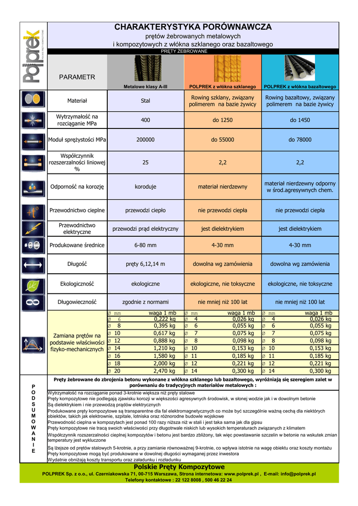 CHARAKTERYSTYKA PORÓWNAWCZA prętów żebrowanych metalowych i kompozytowych z włókna szklanego oraz bazaltowego PRĘTY ŻEBROWANE PARAMETR Metalowe klasy A-III POLPREK z włókna szklanego POLPREK z włókna bazaltowego Materiał Stal Rowing szklany, związany polimerem na bazie żywicy Rowing bazaltowy, związany polimerem na bazie żywicy Wytrzymałość na rozciąganie MPa 400 do 1250 do 1450 Moduł sprężystości MPa 200000 do 55000 do 78000 Współczynnik rozszerzalności liniowej % 25 2,2 2,2 Odporność na korozję koroduje materiał nierdzewny materiał nierdzewny odporny w środ.agresywnych chem. Przewodnictwo cieplne przewodzi ciepło nie przewodzi ciepła nie przewodzi ciepła Przewodnictwo elektryczne przewodzi prąd elektryczny jest dielektrykiem jest dielektrykiem Produkowane średnice 6-80 mm 4-30 mm 4-30 mm Długość pręty 6,12,14 m dowolna wg zamówienia dowolna wg zamówienia Ekologiczność ekologiczne ekologiczne, nie toksyczne ekologiczne, nie toksyczne Długowieczność zgodnie z normami nie mniej niż 100 lat nie mniej niż 100 lat Ø Ø Ø Zamiana prętów na Ø podstawie właściwości Ø fizyko-mechanicznych Ø Ø Ø Ø P O D S U M O W A N I E mm 6 8 10 12 14 16 18 20 waga 1 mb 0,222 kg 0,395 kg 0,617 kg 0,888 kg 1,210 kg 1,580 kg 2,000 kg 2,470 kg Ø Ø Ø Ø Ø Ø Ø Ø Ø mm 4 6 7 8 10 11 12 14 waga 1 mb 0,026 kg 0,055 kg 0,075 kg 0,098 kg 0,153 kg 0,185 kg 0,221 kg 0,300 kg Ø Ø Ø Ø Ø Ø Ø Ø Ø mm 4 6 7 8 10 11 12 14 waga 1 mb 0,026 kg 0,055 kg 0,075 kg 0,098 kg 0,153 kg 0,185 kg 0,221 kg 0,300 kg Pręty żebrowane do zbrojenia betonu wykonane z włókna szklanego lub bazaltowego, wyróżniają się szeregiem zalet w porównaniu do tradycyjnych materiałów metalowych : Wytrzymałość na rozciąganie ponad 3-krotnie większa niż pręty stalowe Pręty kompozytowe nie podlegają zjawisku korozji w większości agresywnych środowisk, w słonej wodzie jak i w dowolnym betonie Są dielektrykiem i nie przewodzą prądów elektrycznych Produkowane pręty kompozytowe są transparentne dla fal elektromagnetycznych co może być szczególnie ważną cechą dla niektórych obiektów, takich jak elektrownie, szpitale, lotniska oraz różnorodne budowle wojskowe Przewodność cieplna w kompozytach jest ponad 100 razy niższa niż w stali i jest taka sama jak dla gipsu Pręty kompozytowe nie tracą swoich właściwości przy długotrwale niskich lub wysokich temperaturach związanych z klimatem Współczynnik rozszerzalności cieplnej kompozytów i betonu jest bardzo zbliżony, tak więc powstawanie szczelin w betonie na wskutek zmian temperatury jest wykluczone Są lżejsze od prętów stalowych 5-krotnie, a przy zamianie równoważnej 9-krotnie, co wpływa istotnie na wagę obiektu oraz koszty montażu Pręty kompozytowe mogą być produkowane w dowolnej długości wymaganej przez inwestora Wydatnie obniżają koszty transportu oraz załadunku i rozładunku Polskie Pręty Kompozytowe POLPREK Sp. z o.o., ul. Czerniakowska 71, 00-715 Warszawa, Strona internetowa: www.polprek.pl , E-mail: [email protected] Telefony kontaktowe : 22 122 8008 , 500 46 22 24