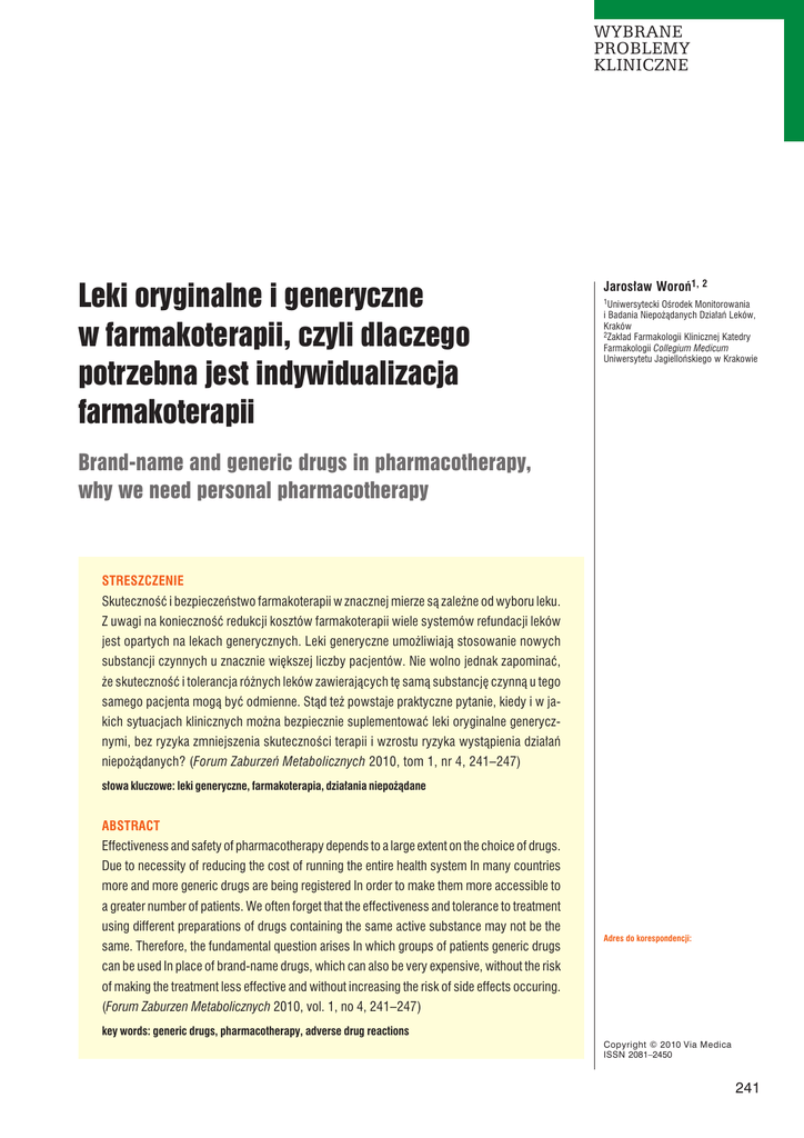 WYBRANE PROBLEMY KLINICZNE Leki oryginalne i generyczne w farmakoterapii, czyli dlaczego potrzebna jest indywidualizacja farmakoterapii Jarosław Woroń1, 2 1Uniwersytecki Ośrodek Monitorowania i Badania Niepożądanych Działań Leków, Kraków 2Zakład Farmakologii Klinicznej Katedry Farmakologii Collegium Medicum Uniwersytetu Jagiellońskiego w Krakowie Brand-name and generic drugs in pharmacotherapy, why we need personal pharmacotherapy STRESZCZENIE Skuteczność i bezpieczeństwo farmakoterapii w znacznej mierze są zależne od wyboru leku. Z uwagi na konieczność redukcji kosztów farmakoterapii wiele systemów refundacji leków jest opartych na lekach generycznych. Leki generyczne umożliwiają stosowanie nowych substancji czynnych u znacznie większej liczby pacjentów. Nie wolno jednak zapominać, że skuteczność i tolerancja różnych leków zawierających tę samą substancję czynną u tego samego pacjenta mogą być odmienne. Stąd też powstaje praktyczne pytanie, kiedy i w jakich sytuacjach klinicznych można bezpiecznie suplementować leki oryginalne generycznymi, bez ryzyka zmniejszenia skuteczności terapii i wzrostu ryzyka wystąpienia działań niepożądanych? (Forum Zaburzeń Metabolicznych 2010, tom 1, nr 4, 241–247) słowa kluczowe: leki generyczne, farmakoterapia, działania niepożądane ABSTRACT Effectiveness and safety of pharmacotherapy depends to a large extent on the choice of drugs. Due to necessity of reducing the cost of running the entire health system In many countries more and more generic drugs are being registered In order to make them more accessible to a greater number of patients. We often forget that the effectiveness and tolerance to treatment using different preparations of drugs containing the same active substance may not be the same. Therefore, the fundamental question arises In which groups of patients generic drugs can be used In place of brand-name drugs, which can also be very expensive, without the risk of making the treatment less effective and without increasing the risk of side effects occuring. (Forum Zaburzen Metabolicznych 2010, vol. 1, no 4, 241–247) Adres do korespondencji: dr n. med. Paweł Bogdański Klinika Chorób Wewnętrznych, Zaburzeń Metabolicznych i Nadciśnienia Tętniczego UM w Poznaniu ul. Szamarzewskiego 84, 60–569 Poznań tel.: (61) 854 93 78, faks: (61) 847 85 29 e-mail: [email protected] key words: generic drugs, pharmacotherapy, adverse drug reactions Copyright © 2010 Via Medica ISSN 2081–2450 241 WYBRANE PROBLEMY KLINICZNE WSTĘP vv Aby farmakoterapia była skuteczna i bezpieczna, musi się opierać na stosowaniu leków o przewidywalnych efektach leczniczych cc vv Jedynym argumentem za ordynowaniem leków generycznych jest brak ekonomicznych możliwości wykupienia przez pacjenta leku oryginalnego cc 242 substancji leczniczej) opiera się na bada- Pan Józef, 58 lat, po przebytym zawale niach klinicznych, przeprowadzonych z serca, od 2 lat przyjmuje oryginalną sim- udziałem odpowiednich populacji pacjen- wastatynę. Podczas ostatniej wizyty w ap- tów. Dlatego też nie bez znaczenia jest dys- tece zaproponowano pacjentowi gene- kusja, czy zawsze skuteczność terapeutycz- ryczny zamiennik w promocyjnej cenie 1 na wszystkich leków zawierających daną grosza. W związku z tym, że pacjent oprócz substancję leczniczą jest identyczna. Doty- statyny musi równocześnie przyjmować czy to leków oryginalnych i generycznych, przewlekle 5 innych leków przystał chętnie których coraz większa liczba jest dostępna w na zamianę. Zdziwienie pacjenta było farmakoterapii chorób układu sercowo- ogromne, gdy po 30 minutach od zażycia -naczyniowego. pierwszej tabletki zamiennika na całym Jak szacuje European Generic Medicines ciele pojawiła się swędząca osutka plami- Association, udział leków odtwórczych w sto-grudkowa. W taki lub podobny sposób całym rynku leków w Polsce wynosi 70– można byłoby opisać wiele przypadków –80%. Od wielu lat polska polityka lekowa polekowych działań niepożądanych, o ja- opiera się na lekach generycznych, jednak kich każdego roku są informowane ośrod- obecnie funkcjonujący model refundacji ki zajmujące się monitorowaniem bezpie- powoduje, że bez względu na to, czy pacjent czeństwa farmakoterapii. W polskich wa- wybierze lek oryginalny czy generyczny, to runkach żonglerka lekami nadal trwa, czę- dopłata Narodowego Funduszu Zdrowia sto pacjent z roli podmiotu jest sprowadza- jest identyczna. Funkcjonowanie limitów ny do roli przedmiotu i tak naprawdę nikt refundacyjnych powoduje, że ewentualną nie monitoruje, stosowanej często prze- różnicę w cenie leku oryginalnego i gene- wlekle, farmakoterapii. Nie ma oczywiście rycznego pokrywa pacjent i to jedynie on nic złego w tym, że lekarz, zgodnie ze swoją może być ewentualnym beneficjentem po- najlepszą wiedzą, wybiera do leczenia pa- czynionej oszczędności. Natomiast, w sytu- cjenta lek oryginalny lub lek generyczny, acji gdy w przypadku dokonanej zamiany natomiast decyzja ta powinna być każdo- leku, często bez rozważenia ewentualnych razowo oparta na przesłankach meryto- korzyści i ryzyka, wystąpi działanie niepo- rycznych, a nie marketingowych. Powinna żądane, to koszty leczenia powikłania oraz każdorazowo zakładać zarówno aspekty częściowo wykorzystanego leku ponosi związane ze skutecznością, jak i z bezpie- płatnik. czeństwem stosowanej farmakoterapii. Jedynym argumentem za ordynowa- Ma to szczególne znaczenie, gdy końco- niem leków generycznych jest brak ekono- wym punktem oceny skuteczności leku jest micznych możliwości wykupienia przez pa- redukcja śmiertelności oraz powikłań. cjenta leku oryginalnego. Konsekwencją W ostatnich latach obserwuje się zwięk- niemożności wykupienia leku oryginalne- szenie udziału leków generycznych w rynku go może być niezdyscyplinowanie pacjen- leków i farmakoterapii. Sytuacja ta, w swo- ta w fa