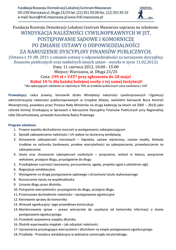 Fundacja Rozwoju Demokracji Lokalnej Centrum Mazowsze zaprasza na szkolenie: WINDYKACJA NALEŻNOŚCI CYWILNOPRAWNYCH W JST, POSTĘPOWANIE SĄDOWE I KOMORNICZE PO ZMIANIE USTAWY O ODPOWIEDZIALNOŚCI ZA NARUSZENIE DYSCYPLINY FINANSÓW PUBLICZNYCH. (Ustawa z 19 .08. 2011 o zmianie ustawy o odpowiedzialności za naruszenie dyscypliny finansów publicznych oraz niektórych innych ustaw - weszła w życie 11.02.2012) Data: 11 czerwca 2012, 10:00 - 15:00 Miejsce: Warszawa, ul. Długa 23/25 Cena: 299 zł + VAT* przy zgłoszeniu do 28 maja! Rabat 10 % dla każdej kolejnej osoby z tej samej Instytucji! *dla opłacających szkolenie co najmniej w 70% ze środków publicznych cena zwolniona z VAT Prowadzący: radca prawny, kierownik działu Windykacji należności cywilnoprawnych i Egzekucji administracyjnej należności publicznoprawnych w Urzędzie Miasta, wieloletni kierownik Biura Kontroli Wewnętrznej, powołana przez Prezesa Rady Ministrów na drugą kadencję (w latach od 2005 – 2013) jako członek Komisji Orzekającej w Sprawach o Naruszenie Dyscypliny Finansów Publicznych przy Regionalnej Izbie Obrachunkowej, prowadzi Kancelarię Radcy Prawnego. Program szkolenia: 1. Prawne aspekty dochodzenia roszczeń w postępowaniu zabezpieczającym 2. Sposób zabezpieczenia należności i ich wpływ na skuteczną windykację 3. Stosowanie zabezpieczeń rzeczowych – hipoteka, zastaw rejestrowy, zastaw zwykły, blokada środków na rachunku bankowym, przelew wierzytelności na zabezpieczenie, przewłaszczenie na zabezpieczenie 4. Istota oraz stosowanie zabezpieczeń osobistych – poręczenie, weksel in blanco, poręczenie wekslowe, przejęcie długu, przystąpienie do długu 5. Przedsądowe czynności (wezwania, porozumienia, ugody, projekty ugod o udzielenie ulgi) 6. Negocjacje windykacyjne. 7. Wystąpienie na drogę postępowania sądowego i otrzymanie tytułu wykonawczego 8. Rozszerzenie tytułu na współmałżonka 9. Uznanie długu przez dłużnika. 10. Potrącenie wierzytelności, przystąpienie do długu, przejęcie długu. 11. Przymusowe dochodzenie należności – postępowanie egzekucyjne 12. Kierowanie sprawy do komornika 13. Wniosek egzekucyjny i jego prawidłowa konstrukcja 14. Monitorowanie spraw – prawo wierzyciela do uzyskania od komornika informacji o stanie postępowania egzekucyjnego 15. Przesłanki wyjawienia majątku dłużnika 16. Dłużnik wyprowadza majątek – jak odzyskać należności 17. Uprawnienia przysługujące wierzycielom i dłużnikom na etapie postępowania egzekucyjnego 18. Przykłady - Procedura windykacyjna w jednostce samorządu terytorialnego. 19. Zasady i tryb udzielania ulg w zapłacie należności cywilnoprawnych na podstawie ustawy z dnia 27.08.2009 o finansach publicznych 20. Omówienie ustawy z dnia 12 lutego 2010 r. o zmianie ustawy o komornikach sądowych i egzekucji (weszła w życie 17 czerwca 2010 r.) i ustawy z dnia 22 lipca 2010 r. o zmianie ustawy o komornikach sądowych i egzekucji ( Dz. U. Nr 155 poz. 1038 – weszła w życie 9 września 2010r.) 21. Przedstawienie ustawy z dnia 9 kwietnia 2010 r. o udostępnianiu informacji gospodarczych i wymianie danych gospodarczych (weszła w życie 14 czerwca 2010 r.) 22. Nowelizacja ustawy z dnia 6 czerwca 1982 r. o księgach wieczystych i hipotece (weszła w życie 20 II 2011). 23. Omówienie Ustawy z dnia 19 sierpnia 2011 r. o zmianie ustawy o odpowiedzialności za naruszenie dyscypliny finansów publicznych oraz niektórych innych ustaw w tym ustawy o finansach publicznych (nowy art. 42) ZGŁOSZENIE WINDYKACJA NALEŻNOŚCI CYWILNOPRAWNYCH W JST, POSTĘPOWANIE SĄDOWE I KOMORNICZE PO ZMIANIE USTAWY O ODPOWIEDZIALNOŚCI ZA NARUSZENIE DYSCYPLINY FINANSÓW PUBLICZNYCH. Data: 11 czerwca 2012, 10:00 - 15:00 Miejsce: Warszawa, ul. Długa 23/25 Cena: 299 zł + VAT* przy zgłoszeniu do 28 maja! Rabat 10 % dla każdej kolejnej osoby z tej samej Instytucji! *dla opłacających szkolenie co najmniej w 70% ze środków publicznych cena zwolniona z VAT Instytucja: .................................................................................................................. Adres:......................................................................................................................... NIP: ............................................................................................................................ L.p. Imię i nazwisko Wydział tel. e-mail 1................................................................................................................................. 2................................................................................................................................. 3................................................................................................................................. ........................................................... podpis i pieczątka osoby delegującej Zgłoszenie na szkolenie Zgłoszenia prosimy przesyłać do 4 czerwca 2012 r. faxem pod nr (22) 351 93 10 lub e-mailem na adres [email protected] lub wybrać opcje zapisu przez stronę www.frdl.mazowsze.pl Przy zgłoszeniu w ramach Forów prosimy o wpisanie w uwagach: „Zgłoszenie w ramach Forum (nazwa Forum)”. Ewentualną rezygnację ze szkolenia można zgłosić najpóźniej na dwa dni robocze przed szkoleniem. W przypadku niewykorzystania zgłoszonego uczestnictwa - Urząd będzie zobowiązany do finansowania 60% odpłatności za uczestnictwo i materiały. FRDL zastrzega sobie prawo odwołania szkolenia. Cena: 299 zł + VAT* przy zgłoszeniu do 28 maja! Cena po 28 maja to 350 zł+ VAT*. *dla opłacających szkolenie co najmniej w 70% ze środków publicznych cena zwolniona z VAT Rabat 10 % dla każdej kolejnej osoby z tej samej Instytucji! W cenie materiały szkoleniowe, zaświadczenie, lunch oraz przerwy kawowe. Płatność przelewem, na podstawie faktury wystawionej w dniu szkolenia. Miejsce szkolenia: Centrum Warszawy, ul. Długa 23/25, sala Konfere