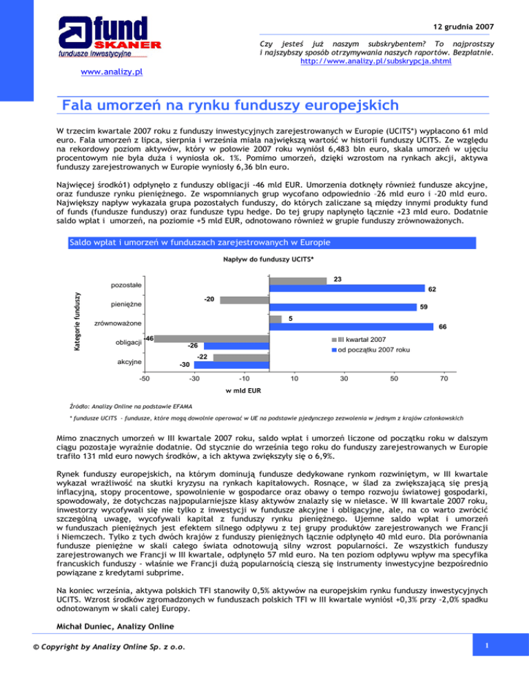12 grudnia 2007 Czy jesteś już naszym subskrybentem? To najprostszy i najszybszy sposób otrzymywania naszych raportów. Bezpłatnie. http://www.analizy.pl/subskrypcja.shtml www.analizy.pl Fala umorzeń na rynku funduszy europejskich W trzecim kwartale 2007 roku z funduszy inwestycyjnych zarejestrowanych w Europie (UCITS*) wypłacono 61 mld euro. Fala umorzeń z lipca, sierpnia i września miała największą wartość w historii funduszy UCITS. Ze względu na rekordowy poziom aktywów, który w połowie 2007 roku wyniósł 6,483 bln euro, skala umorzeń w ujęciu procentowym nie była duża i wyniosła ok. 1%. Pomimo umorzeń, dzięki wzrostom na rynkach akcji, aktywa funduszy zarejestrowanych w Europie wyniosły 6,36 bln euro. Najwięcej środkó1) odpłynęło z funduszy obligacji -46 mld EUR. Umorzenia dotknęły również fundusze akcyjne, oraz fundusze rynku pieniężnego. Ze wspomnianych grup wycofano odpowiednio –26 mld euro i -20 mld euro. Największy napływ wykazała grupa pozostałych funduszy, do których zaliczane są między innymi produkty fund of funds (fundusze funduszy) oraz fundusze typu hedge. Do tej grupy napłynęło łącznie +23 mld euro. Dodatnie saldo wpłat i umorzeń, na poziomie +5 mld EUR, odnotowano również w grupie funduszy zrównoważonych. Saldo wpłat i umorzeń w funduszach zarejestrowanych w Europie Napływ do funduszy UCITS* 23 Kategorie funduszy pozostałe 62 -20 pieniężne 59 5 zrównoważone obligacji 66 -46 akcyjne III kwartał 2007 -26 od początku 2007 roku -22 -30 -50 -30 -10 10 30 50 70 w mld EUR Źródło: Analizy Online na podstawie EFAMA * fundusze UCITS - fundusze, które mogą dowolnie operować w UE na podstawie pjedynczego zezwolenia w jednym z krajów członkowskich Mimo znacznych umorzeń w III kwartale 2007 roku, saldo wpłat i umorzeń liczone od początku roku w dalszym ciągu pozostaje wyraźnie dodatnie. Od stycznie do września tego roku do funduszy zarejestrowanych w Europie trafiło 131 mld euro nowych środków, a ich aktywa zwiększyły się o 6,9%. Rynek funduszy europejskich, na którym dominują fundusze dedykowane rynkom rozwiniętym, w III kwartale wykazał wrażliwość na skutki kryzysu na rynkach kapitałowych. Rosnące, w ślad za zwiększającą się presją inflacyjną, stopy procentowe, spowolnienie w gospodarce oraz obawy o tempo rozwoju światowej gospodarki, spowodowały, że dotychczas najpopularniejsze klasy aktywów znalazły się w niełasce. W III kwartale 2007 roku, inwestorzy wycofywali się nie tylko z inwestycji w fundusze akcyjne i obligacyjne, ale, na co warto zwrócić szczególną uwagę, wycofywali kapitał z funduszy rynku pieniężnego. Ujemne saldo wpłat i umorzeń w funduszach pieniężnych jest efektem silnego odpływu z tej grupy produktów zarejestrowanych we Francji i Niemczech. Tylko z tych dwóch krajów z funduszy pieniężnych łącznie odpłynęło 40 mld euro. Dla porównania fundusze pieniężne w skali całego świata odnotowują silny wzrost popularności. Ze wszystkich funduszy zarejestrowanych we Francji w III kwartale, odpłynęło 57 mld euro. Na ten poziom odpływu wpływ ma specyfika francuskich funduszy - właśnie we Francji dużą popularnością cieszą się instrumenty inwestycyjne bezpośrednio powiązane z kredytami subprime. Na koniec września, aktywa polskich TFI stanowiły 0,5% aktywów na europejskim rynku funduszy inwestycyjnych UCITS. Wzrost środków zgromadzonych w funduszach polskich TFI w III kwartale wyniósł +0,3% przy -2,0% spadku odnotowanym w skali całej Europy. Michał Duniec, Analizy Online © Copyright by Analizy Online Sp. z o.o. 1 12 grudnia 2007 Czy jesteś już naszym subskrybentem? To najprostszy i najszybszy sposób otrzymywania naszych raportów. Bezpłatnie. http://www.analizy.pl/subskrypcja.shtml www.analizy.pl Spółka Analizy Online jest niezależną firmą analityczną zajmującą się monitoringiem rynku polskich i zagranicznych instytucji zbiorowego lokowania środków: funduszy inwestycyjnych, emerytalnych oraz ubezpieczeniowych funduszy kapitałowych). W zakres analiz rynku funduszy wchodzą między innymi rankingi funduszy, ocena efektywności działań zarządzających oraz analiza ich wpływu na polski rynek finansowy. Niniejsze opracowanie zostało sporządzone wyłącznie w celu informacyjnym zgodnie z najlepszą wiedzą i starannością autorów. Dane wykorzystane przy tworzeniu opracowania pochodzą ze źródeł uważanych przez firmę Analizy Online Sp. z o.o. za wiarygodne i dokładne, lecz nie istnieje gwarancja, iż są one kompletne i odzwierciedlają stan faktyczny. Opinie zawarte w niniejszym opracowaniu częściowo bazują na wartościach szacunkowych, wyznaczanych zgodnie z metodologią stosowaną przez Analizy Online Sp. z o.o., które mogą odbiegać od danych rzeczywistych. Spółka Analizy Online Sp. z o.o. nie ponosi odpowiedzialności za ewentualne szkody spowodowane wykorzystaniem opinii i informacji zawartych w niniejszym opracowaniu. Niniejsze opracowanie jest przeznaczone do wyłącznego, własnego użytku Klientów spółki Analizy Online Sp. z o.o., którzy otrzymali je bezpośrednio od spółki Analizy Online Sp. z o.o. Publikowanie niniejszego opracowania w prasie, internecie i innych środkach masowego przekazu w całości bądź w części, jak również przytaczanie zawartych w nim opinii wymaga pisemnej zgody spółki Analizy Online Sp. z o.o. © Copyright by Analizy Online Sp. z o.o. 2