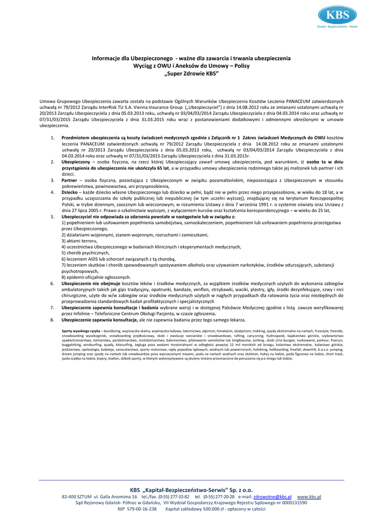 Informacje dla Ubezpieczonego - ważne dla zawarcia i trwania ubezpieczenia Wyciąg z OWU i Aneksów do Umowy – Polisy „Super Zdrowie KBS” Umowa Grupowego Ubezpieczenia zawarta została na podstawie Ogólnych Warunków Ubezpieczenia Kosztów Leczenia PANACEUM zatwierdzonych uchwałą nr 79/2012 Zarządu InterRisk TU S.A. Vienna Insurance Group („Ubezpieczyciel”) z dnia 14.08.2012 roku ze zmianami ustalonymi uchwałą nr 20/2013 Zarządu Ubezpieczyciela z dnia 05.03.2013 roku, uchwałą nr 03/04/03/2014 Zarządu Ubezpieczyciela z dnia 04.03.2014 roku oraz uchwałą nr 07/31/03/2015 Zarządu Ubezpieczyciela z dnia 31.03.2015 roku wraz z postanowieniami dodatkowymi i odmiennymi określonymi w umowie ubezpieczenia. 1. 2. 3. 4. 5. 6. 7. 8. Przedmiotem ubezpieczenia są koszty świadczeń medycznych zgodnie z Załącznik nr 1 Zakres świadczeń Medycznych do OWU kosztów leczenia PANACEUM zatwierdzonych uchwałą nr 79/2012 Zarządu Ubezpieczyciela z dnia 14.08.2012 roku ze zmianami ustalonymi uchwałą nr 20/2013 Zarządu Ubezpieczyciela z dnia 05.03.2013 roku, uchwałą nr 03/04/03/2014 Zarządu Ubezpieczyciela z dnia 04.03.2014 roku oraz uchwałą nr 07/31/03/2015 Zarządu Ubezpieczyciela z dnia 31.03.2015r. Ubezpieczony – osoba fizyczna, na rzecz której Ubezpieczający zawarł umowę ubezpieczenia, pod warunkiem, iż osoba ta w dniu przystąpienia do ubezpieczenia nie ukończyła 65 lat, a w przypadku umowy ubezpieczenia rodzinnego także jej małżonek lub partner i ich dzieci. Partner – osoba fizyczna, pozostająca z Ubezpieczonym w związku pozamałżeńskim, niepozostająca z Ubezpieczonym w stosunku pokrewieństwa, powinowactwa, ani przysposobienia, Dziecko – każde dziecko własne Ubezpieczonego lub dziecko w pełni, bądź nie w pełni przez niego przysposobione, w wieku do 18 lat, a w przypadku uczęszczania do szkoły publicznej lub niepublicznej (w tym uczelni wyższej), znajdującej się na terytorium Rzeczypospolitej Polski, w trybie dziennym, zaocznym lub wieczorowym, w rozumieniu Ustawy z dnia 7 września 1991 r. o systemie oświaty oraz Ustawy z dnia 27 lipca 2005 r. Prawo o szkolnictwie wyższym, z wyłączeniem kursów oraz kształcenia korespondencyjnego – w wieku do 25 lat, Ubezpieczyciel nie odpowiada za zdarzenia powstałe w następstwie lub w związku z: 1) popełnieniem lub usiłowaniem popełnienia samobójstwa, samookaleczeniem, popełnieniem lub usiłowaniem popełnienia przestępstwa przez Ubezpieczonego, 2) działaniami wojennymi, stanem wojennym, rozruchami i zamieszkami, 3) aktami terroru, 4) uczestnictwa Ubezpieczonego w badaniach klinicznych i eksperymentach medycznych, 5) chorób psychicznych, 6) leczeniem AIDS lub schorzeń związanych z tą chorobą, 7) leczeniem skutków i chorób spowodowanych spożywaniem alkoholu oraz używaniem narkotyków, środków odurzających, substancji psychotropowych, 8) epidemii oficjalnie ogłoszonych. Ubezpieczenie nie obejmuje kosztów leków i środków medycznych, za wyjątkiem środków medycznych użytych do wykonania zabiegów ambulatoryjnych takich jak gips tradycyjny, opatrunki, bandaże, venflon, strzykawki, waciki, plastry, igły, środki dezynfekujące, szwy i nici chirurgiczne, użyte do w/w zabiegów oraz środków medycznych użytych w nagłych przypadkach dla ratowania życia oraz niezbędnych do przeprowadzenia standardowych badań profilaktycznych i specjalistycznych Ubezpieczenie zapewnia konsultacje i badania wybrane wersji i w dostępnej Palcówce Medycznej zgodnie z listą zawsze weryfikowanej przez Infolinie – Telefoniczne Centrum Obsługi Pacjenta, w czasie zgłoszenia. Ubezpieczenie zapewnia konsultacje, ale nie zapewnia badania przez tego samego lekarza. Sporty wysokiego ryzyka – bouldering, wspinaczka skalna, wspinaczka lodowa, taternictwo, alpinizm, himalaizm, skialpinizm, trekking, zjazdy ekstremalne na nartach, freestyle, freeride, snowboarding wysokogórski, snowboarding prędkościowy, skoki i ewolucje narciarskie i snowboardowe, rafting, cany oning, hydrospeed, kajakarstwo górskie, szybownictwo spadochroniarstwo, lotniarstwo, paralotniarstwo, motolotniarstwo, baloniarstwo, pilotowanie samolotów lub śmigłowców, zorbing , skoki z/na bungee, nurkowanie, parkour, freerun, buggykitting, windsurfing, quady, kitesurfing, żegluga poza wodami terytorialnymi w odległości powyżej 12 mil morskich od brzegu, kolarstwo ekstremalne, kolarstwo górskie, jeździectwo, speleologia, bobsleje, saneczkarstwo, sporty motorowe, rajdy pojazdów lądowych, wodnych lub powiet rznych, heliskiing, heliboarding, freefall, downhill, b.a.s.e. jumping, dream jumping oraz zjazdy na nartach lub snowboardzie poza wyznaczonymi trasami, jazda na nartach wodnych oraz skeleton, hoke j na lodzie, jazda figurowa na lodzie, short track, jazda szybka na lodzie, bojery, biatlon, skibob sporty, w których wykorzystywane są skutery śnieżne przeznaczone do poruszania się p o śniegu lub lodzie; KBS „Kapitał-Bezpieczeństwo-Serwis” Sp. z o.o. 82-400 SZTUM ul. Galla Anomima 16 tel./fax. (0-55) 277-32-82 tel. (0-55) 277-20-28 e-mail: [email protected] www.kbs.pl Sąd Rejonowy Gdańsk- Północ w Gdańsku, VII Wydział Gospodarczy Krajowego Rejestru Sądowego nr 0000131590 NIP 579-00-16-238 Kapitał zakładowy 500.000 zł - opłacony w całości