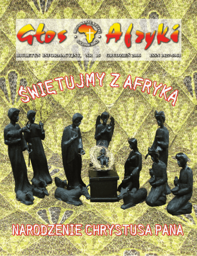 BIULETYN INFORMACYJNY, NR 15 GRUDZIEŃ 2006 ISSN 1427-5961 w numerze 3 4 Refleksje misyjne 5 Wokół Afryki 6 8 II Synod Afrykański Z życia wspólnoty mała kronika wydarzenia Formacja misyjna klerycy mówią o modlitwie Mówią rodziny misjonarzy świadectwo P. Zagułów 10 Zobaczyć Afrykę z Afryki 12 Prosto listy od misjonarzy Boże Narodzenie 14 w Tanzanii, Zamblii, Nigrze Nasz 18 założyciel 114 rocznica śmierci kard. Lavigerie Problemy Afryki wyzysk 20 ekonomiczny Afryki Białe 22 Siostry to co jest dobre w Afryce Dzielmy się wiarą 24 świętowanie Bożego Narodzenia 25 Listy od Czytelników 26 Z potrzeby serca Strona 27 wdzięczności i pamięci str. 2 Drodzy Czytelnicy! Radujemy się, że dzięki zaangażowaniu wielu, możemy, na Święta Bożego Narodzenia, obdarzyć Was jednym więcej prezentem - naszym pismem. Głównym tematem tego wydania są oczywiście Święta. Prezentowane artykuły chiałyby się przysłużyć przeżywaniu tych Świąt jako rodzinnej wspólnoty ludzi wierzących. Chciałyby też pobudzać do przemyśleń, że, aby radość z narodzenia Pana była pełna, nie należy spóźniać się w naprawianiu relacji rodzinnych, aby były one bliskie ideału. Czytając artykuły o Bożym Narodzeniu otwierajmy się rówież na prawdę, że radość świąteczna rozlewa się daleko poza granice naszej Ojczyzny. Niech ta prawda będzie żywo przeżywana szczególnie podczas naszego uczestnictwa w Mszach świętych. Zaś śpiew kolęd niech spotęguje naszą modlitwę w intencji pokoju w ludzkich sercach. Rodzinny charakter tych Świąt chcemy ponadto podkreślić przez świadectwo rodziny, której syn zdecydował się na drogę kapłańską i jest obecnie w Afryce. Piękno więzi rodzinnych niech objawia się też łącznością z nieobecymi przy wigilijnym stole. Żywimy nadzieję, że to świadectwo rodziców rzuci snop Bożego światła na tych, którzy są w takiej właśnie sytuacji pustego talerza przy Wigilii. Wiemy, że są rodziny borykające się z wieloma problemami. Mówi o tym artykuł O. Bogusława. Prosimy o modlitwy w ich intencjach. Nasi “korespondenci” czyli misjonarze i misjonarki są na posterunku, dlatego, poprzez ich artykuły, możemy niejako oglądać na żywo ich życie i działalnośćw Afryce. Zapalmy im, podczas Wigilii, świecę Caritas, jako znak naszej miłości i łączności z nimi. Mamy nadzieję, że niektórzy, pchani ciekawaścią, zaangażują się w kucharzenie i skosztują mandazi [ rodzaj naszych pączków] według przepisu siostry Celiny ze strony 24. Zachęcamy do czytania tych i innych artykułów na naszych stronach, do czytania “od deski do deski”. Prosimy również, Drodzy Czytelnicy, abyście przyjęli nasze najszczersze życzenia na Święta i na Nowy Rok A.D.2007. Zespół redakcyjny Z narodzenia Pana dzień dziś wesoły, Wyśpiewują chwałę Bogu żywioły! Radość ludzi wszędy płynie... Radości, która płynie z wyśpiewania chwały Bogu Radości, która łączy na nowo Rodziny węzłami miłości Radości, która wyraża się wzajemnym obdarowaniem się szacunkiem Radości, która otwiera na spełnianie się marzeń w Nowym A.D. 2007 Życzą Drogim Czytelnikom, Dobrodziejom i Przyjaciołom Polscy Misjonarze - Ojcowie Biali Wydawca: Zgromadzenie Misjonarzy Afryki Redakcja: Wspólnota Ojców w Polsce Adres: Misjonarze Afryki, ul. Ziemska 37 Natalin, 21-002 Jastków, Tel. 081 746 79 85 e-mail: [email protected] www.ojcowiebiali.misje.pl www.ojcowiebiali.prv.pl Zdjęcia: Archiwum własne Druk: Zakład Poligraficzny Mielec Okładka: Szopka afrykańska (zdjęcie Grzegorz Petryniak) refleksje misyjne II Synod Afrykański Papież Benedykt XVI 22 czerwca 2005r. ogłosił decyzję o zwołaniu do Rzymu II Synodu Biskupów Afrykańskich. Wyznaczył też jego temat: “Kościół w Afryce w służbie pojednania, pokoju i sprawiedliwości: wy jesteście solą ziemi... Wy jesteście światłem świata”. (Mt 5:13, 14)”. KRÓTKA HISTORIA SYNODU Dwanaście lat temu od 10 kwietnia do 8 maja 1994r. odbył się Pierwszy Synod Biskupów Afrykańskich. Jego tematem przewodnim było: “Kościół w Afryce i jego misja ewangelizacyjna w perspektywie roku 2000: ‘Wy będziecie moimi świadkami(Dz 1:8)’. Owocem Synodu była Exhortacja Apostolska “Koścół w Afryce”, podpisana 14 września 1995r. podczas podróży apostolskiej Jan Pawła II do Afryki. 13 listopada 2004r. Jan Paweł II, odpowiadając na prośby wielu biskupów, kapłanów, osób konsekrowanych i wiernych świeckich, ogłosił zamiar zwołania II Synodu Afrykańskiego. Papież Benedykt XVI potwierdził ten zamiar, ogłaszając 22 czerwca 2005r. swoją decyzję o zwołaniu do Rzymu II Synodu Biskupów Afrykańskich. ROZWÓJ KOŚCIOŁA W AFRYCE W ciągu ostatnich lat Kościół w Afryce notuje znaczący wzrost. Według kościelnych statystyk z 2004 r. Afryka liczyła 148,817,000 wiernych, którym przewodniczyło i opiekowało się 630 biskupów, 31,259 kapłanów, wśród których 20,358 było księżmi diecezjalnymi a 10,901 należącymi do zakonów i zgromadzeń. Wspierani są oni przez 7,791 braci zakonnych, 57,475 sióstr zakonnych i 379,656 katechistów. Odnotowania godnym jest fakt wielkiego zaangażowania Kościoła w Afryce na polu edukacji młodego pokolenia i niesienia pomocy charytatywnej. CELE NOWEGO SYNODU Dziękując Bogu za ten rozwój, przygotowania do II Synodu powinny być okazją dla całego Ludu Bożego w Afryce do głębokiej modlitewnej refleksji, która przyczyni się do wzrostu inicjatyw duszpasterskich w Afryce. To z kolei przysłuży się do postępu na drodze świętości, którego owocem będzie, że Afryka stanie się jeszcze bardziej “Ojczyzną Jezusa Chrystusa”. Ewangelia tam głoszona jest rzeczywiście solą tamtej ziemi, gwarantem znoszenia wszelkich przeciwności. Dobra Nowina tam przepowiadana, wsparta świadctwem wierzących, jest światłem, które świeci, również w ciemności afrykańskich konfliktów. 
