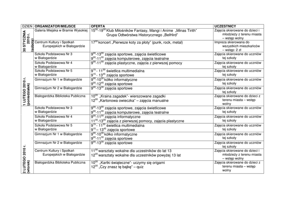 2 LUTEGO 2010 r. (wtorek) 1 LUTEGO 2010 r. (poniedziałek) 30 STYCZNIA 2010 r. (sobota) DZIEŃ ORGANIZATOR/MIEJSCE Galeria Miejska w Bramie Wysokiej OFERTA 1500-1900 Klub Miłośników Fantasy, Mangi i Anime „Minas Tirith” Grupa Odtwórstwa Historycznego „BelHird” Centrum Kultury i Spotkań Europejskich w Białogardzie 1700 koncert „Pierwsze koty za płoty” (punk, rock, metal) Szkoła Podstawowa Nr 3 w Białogardzie Szkoła Podstawowa Nr 4 w Białogardzie Szkoła Podstawowa Nr 5 w Białogardzie Gimnazjum Nr 1 w Białogardzie 900-1300 zajęcia sportowe, zajęcia świetlicowe 900-1100 zajęcia komputerowe, zajęcia teatralne 900-1100 zajęcia plastyczne, zajęcia z pierwszej pomocy Gimnazjum Nr 2 w Białogardzie 915 - 1130 świetlica multimedialna 915 - 1345 zajęcia sportowe 900-1030 kółko informatyczne 900-1245 zajęcia sportowe 900-1330 zajęcia sportowe Białogardzka Biblioteka Publiczna 1000 „Kraina zagadek”- wierszowane zagadki 1200 „Kartonowa owieczka” – zajęcia manualne Szkoła Podstawowa Nr 3 w Białogardzie Szkoła Podstawowa Nr 4 w Białogardzie Szkoła Podstawowa Nr 5 w Białogardzie Gimnazjum Nr 1 w Białogardzie Gimnazjum Nr 2 w Białogardzie 900-1300 zajęcia sportowe, zajęcia świetlicowe 900-1100 zajęcia komputerowe, zajęcia teatralne 900-1100 zajęcia informatyczne 1100-1300 zajęcia z pierwszej pomocy, zajęcia plastyczne 915 - 1130 świetlica multimedialna 915 – 1345 zajęcia sportowe 900-1030 kółko informatyczne 900-1130 zajęcia sportowe 900-1330 zajęcia sportowe Centrum Kultury i Spotkań Europejskich w Białogardzie 1100 warsztaty wokalne dla uczestników do lat 13 1200 warsztaty wokalne dla uczestników powyżej 13 lat Białogardzka Biblioteka Publiczna 1000 „Kartki świąteczne”- uczymy się origami 1200 „Czy znasz tę bajkę” – quiz UCZESTNICY Zajęcia skierowane do dzieci i młodzieży z terenu miasta – wstęp wolny Impreza skierowana do wszystkich mieszkańców – wstęp: 2 zł Zajęcia skierowane do uczniów tej szkoły Zajęcia skierowane do uczniów tej szkoły Zajęcia skierowane do uczniów tej szkoły Zajęcia skierowane do uczniów tej szkoły Zajęcia skierowane do uczniów tej szkoły Zajęcia skierowane do dzieci z terenu miasta – wstęp wolny Zajęcia skierowane do uczniów tej szkoły Zajęcia skierowane do uczniów tej szkoły Zajęcia skierowane do uczniów tej szkoły Zajęcia skierowane do uczniów tej szkoły Zajęcia skierowane do uczniów tej szkoły Zajęcia skierowane do dzieci i młodzieży z terenu miasta – wstęp wolny Zajęcia skierowane do dzieci z terenu miasta – wstęp wolny Szkoła Podstawowa Nr 3 w Białogardzie Szkoła Podstawowa Nr 4 w Białogardzie 3 LUTEGO 2010 r. ( środa) Szkoła Podstawowa Nr 5 w Białogardzie Gimnazjum Nr 1 w Białogardzie Gimnazjum Nr 2 w Białogardzie Galeria Miejska w Bramie Wysokiej 1200-1600 zajęcia plastyczne (przygotowanie prac do konkursu plastycznego „Za oknem”) Białogardzka Biblioteka Publiczna 1000 „120 przygód Koziołka Matołka” - głośne czytanie 1200 „Malujemy Koziołka Matołka” - kolorowanki Szkoła Podstawowa Nr 3 w Białogardzie Szkoła Podstawowa Nr 4 w Białogardzie Szkoła Podstawowa Nr 5 w Białogardzie Gimnazjum Nr 1 w Białogardzie 900-1300 zajęcia sportowe, zajęcia świetlicowe Gimnazjum Nr 2 w Białogardzie Centrum Kultury i Spotkań Europejskich w Białogardzie 4 LUTEGO 2010 r. (czwartek) 900-1300 zajęcia sportowe, zajęcia świetlicowe 900-1100 zajęcia komputerowe, zajęcia teatralne 900-1300 wyjście do Straży Pożarnej 900-1100 zajęcia sportowe 1100-1300 zajęcia biblioteczne 915 -1130 świetlica multimedialna 915 -1345 zajęcia sportowe 900-1030 kółko informatyczne 900-1130 zajęcia sportowe 900-1330 zajęcia sportowe Białogardzka Biblioteka Publiczna 900-1100 zajęcia informatyczne 1100-1300 zajęcia językowe 915 -1130 świetlica multimedialna 915 -1345 zajęcia sportowe 900-1115 kółko informatyczne 900-1245 zajęcia sportowe 900-1330 zajęcia sportowe 1100 warsztaty wokalne dla uczestników do lat 13 1200 warsztaty wokalne dla uczestników powyżej 13 lat 1600 dzień otwarty Teatru Lalek „MARKO” 1000 „Wielka Encyklopedia Krasnoludków” – uczymy się kodeksu etycznego krasnoludków 1200 „Twój ulubiony krasnal” – malujemy wybranego krasnala Zajęcia skierowane do uczniów tej szkoły Zajęcia skierowane do uczniów tej szkoły Zajęcia skierowane do uczniów tej szkoły Zajęcia skierowane do uczniów tej szkoły Zajęcia skierowane do uczniów tej szkoły Zajęcia skierowane do dzieci i młodzieży z terenu miasta – wstęp wolny Zajęcia skierowane do dzieci z terenu miasta – wstęp wolny Zajęcia skierowane do uczniów tej szkoły Zajęcia skierowane do uczniów tej szkoły Zajęcia skierowane do uczniów tej szkoły Zajęcia skierowane do uczniów tej szkoły Zajęcia skierowane do uczniów tej szkoły Zajęcia skierowane do dzieci i młodzieży z terenu miasta – wstęp wolny Zajęcia skierowane do dzieci z terenu miasta – wstęp wolny Szkoła Podstawowa Nr 3 w Białogardzie Szkoła Podstawowa Nr 4 w Białogardzie Szkoła Podstawowa Nr 5 w Białogardzie Gimnazjum Nr 1 w Białogardzie 8 LUEGO 2010 r. (poniedziałek) 6 LUTEGO 5 LUTEGO 2010 r. 2010 r. (piątek) (sobota) Gimnazjum Nr 2 w Białogardzie 900-1300 zajęcia sportowe 900-1300 wyjście do Straży Pożarnej 900-1100 zajęcia sportowe 1100-1300 zajęcia informatyczne 915 - 1130 świetlica multimedialna, zajęcia sportowe 900-1115 kółko informatyczne 900-1245 zajęcia sportowe 900-1200 zajęcia sportowe Galeria Miejska w Bramie Wysokiej 1200-1600 zajęcia plastyczne (przygotowanie prac do konkursu plastycznego „Za oknem”) Centrum Kultury i Spotkań Europejskich w Białogardzie 1700 „Magiczny poranek” – recital iluzjonistyczny Mistrza Jerzego Strzeleckiego Białogardzka Biblioteka Publiczna 1000 „Wesołe maski karnawałowe” – zajęcia manualne 1200 „Zostań mistrzem ortografii” – dyktando Galer