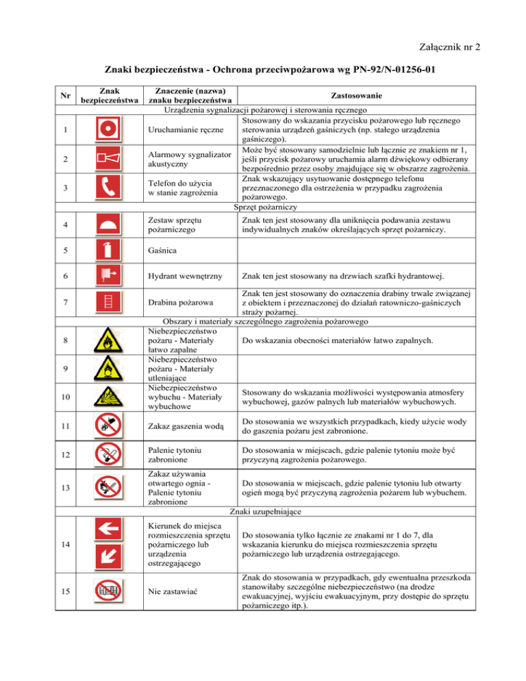 Załącznik nr 2 Znaki bezpieczeństwa - Ochrona przeciwpożarowa wg PN-92/N-01256-01 Nr 1 2 3 Znak bezpieczeństwa Znaczenie (nazwa) Zastosowanie znaku bezpieczeństwa Urządzenia sygnalizacji pożarowej i sterowania ręcznego Stosowany do wskazania przycisku pożarowego lub ręcznego Uruchamianie ręczne sterowania urządzeń gaśniczych (np. stałego urządzenia gaśniczego). Może być stosowany samodzielnie lub łącznie ze znakiem nr 1, Alarmowy sygnalizator jeśli przycisk pożarowy uruchamia alarm dźwiękowy odbierany akustyczny bezpośrednio przez osoby znajdujące się w obszarze zagrożenia. Znak wskazujący usytuowanie dostępnego telefonu Telefon do użycia przeznaczonego dla ostrzeżenia w przypadku zagrożenia w stanie zagrożenia pożarowego. Sprzęt pożarniczy 4 Zestaw sprzętu pożarniczego 5 Gaśnica 6 Hydrant wewnętrzny 7 8 9 10 Znak ten jest stosowany dla uniknięcia podawania zestawu indywidualnych znaków określających sprzęt pożarniczy. Znak ten jest stosowany na drzwiach szafki hydrantowej. Znak ten jest stosowany do oznaczenia drabiny trwale związanej z obiektem i przeznaczonej do działań ratowniczo-gaśniczych straży pożarnej. Obszary i materiały szczególnego zagrożenia pożarowego Niebezpieczeństwo pożaru - Materiały Do wskazania obecności materiałów łatwo zapalnych. łatwo zapalne Niebezpieczeństwo pożaru - Materiały utleniające Niebezpieczeństwo Stosowany do wskazania możliwości występowania atmosfery wybuchu - Materiały wybuchowej, gazów palnych lub materiałów wybuchowych. wybuchowe Drabina pożarowa 11 Zakaz gaszenia wodą Do stosowania we wszystkich przypadkach, kiedy użycie wody do gaszenia pożaru jest zabronione. 12 Palenie tytoniu zabronione Do stosowania w miejscach, gdzie palenie tytoniu może być przyczyną zagrożenia pożarowego. 13 Zakaz używania otwartego ognia Palenie tytoniu zabronione Do stosowania w miejscach, gdzie palenie tytoniu lub otwarty ogień mogą być przyczyną zagrożenia pożarem lub wybuchem. Znaki uzupełniające 14 15 Kierunek do miejsca rozmieszczenia sprzętu pożarniczego lub urządzenia ostrzegającego Do stosowania tylko łącznie ze znakami nr 1 do 7, dla wskazania kierunku do miejsca rozmieszczenia sprzętu pożarniczego lub urządzenia ostrzegającego. Nie zastawiać Znak do stosowania w przypadkach, gdy ewentualna przeszkoda stanowiłaby szczególne niebezpieczeństwo (na drodze ewakuacyjnej, wyjściu ewakuacyjnym, przy dostępie do sprzętu pożarniczego itp.). Załącznik nr 3 Znaki bezpieczeństwa - Ewakuacja wg PN-92/N-01256-02 Nr Znak bezpieczeństwa Znaczenie (nazwa) znaku bezpieczeństwa Zastosowanie 1 Kierunek drogi ewakuacyjnej Znak wskazuje kierunek do wyjścia, które może być wykorzystane w przypadku zagrożenia. Strzałki krótkie - do stosowania z innymi znakami. Strzałka długa - do samodzielnego stosowania. 2 Wyjście ewakuacyjne Znak stosowany do oznakowania wyjść używanych w przypadku zagrożenia. 3 Drzwi ewakuacyjne Znak stosowany nad drzwiami skrzydłowymi, które są wyjściami ewakuacyjnymi (drzwi lewe lub prawe). 4 Przesunąć w celu otwarcia Znak stosowany łącznie ze znakiem nr 3 na przesuwnych drzwiach wyjścia ewakuacyjnego, jeśli są one dozwolone. Strzałka powinna wskazywać kierunek otwierania drzwi przesuwnych. 5 Kierunek do wyjścia drogi ewakuacyjnej Znak wskazuje kierunek drogi ewakuacyjnej do wyjścia; może kierować w lewo lub w prawo. 6 Kierunek do wyjścia drogi ewakuacyjnej schodami w dół Znak wskazuje kierunek drogi ewakuacyjnej schodami w dół na lewo lub prawo. 7 Kierunek do wyjścia drogi ewakuacyjnej schodami w górę Znak wskazuje kierunek drogi ewakuacyjnej schodami w górę na lewo lub prawo. 8 Pchać, aby otworzyć Znak jest umieszczany na drzwiach dla wskazania kierunku otwierania. 9 Ciągnąć, aby otworzyć 10 Stłuc, aby uzyskać dostęp Znak jest umieszczany na drzwiach dla wskazania kierunku otwierania. Znak ten może być stosowany: a) w miejscu, gdzie jest niezbędne stłuczenie szyby dla uzyskania dostępu do klucza lub systemu otwarcia, b) gdy jest niezbędne rozbicie przegrody dla uzyskania wyjścia. Załącznik nr 4 Znaki bezpieczeństwa - Techniczne środki przeciwpożarowe wg PN-N-01256-4 Nr Znak bezpieczeństwa Znaczenie (nazwa) znaku bezpieczeństwa Zastosowanie 1 Przeciwpożarowy wyłącznik prądu W obiektach do oznaczenia wyłącznika odcinającego dopływ prądu do wszystkich obwodów z wyjątkiem obwodów zasilających instalacje, których funkcjonowanie jest niezbędne podczas pożaru. 2 Kurek główny instalacji gazowej W obiektach do oznaczenia miejsca zainstalowania kurka głównego instalacji gazowej. 3 Suchy pion W obiektach do oznaczenia umiejscowienia i podłączenia suchego pionu. 4 Przeciwpożarowy zbiornik wody Do oznaczenia przeciwpożarowego zbiornika wodnego; na znaku dodatkowym możliwość umieszczenia cech charakterystycznych takich, jak: pojemność zbiornika, jego głębokość itp. 5 Hydrant zewnętrzny Do oznaczenia miejsca hydrantu zewnętrznego, wodnego, pianowego, podziemnego lub nadziemnego; wielkości charakterystyczne hydrantu należy umieszczać na znaku dodatkowym. 6 Przeciwpożarowe stanowisko czerpania wody Do oznaczenia stanowiska wodnego dla pomp pożarniczych. 7 Drabina ewakuacyjna Do oznaczenia miejsc umieszczenia drabin ewakuacyjnych. 8 Dźwig przeciwpożarowy W obiektach do oznaczenia dźwigów przystosowanych do potrzeb ekip ratunkowych. 9 Pojemnik z maskami ucieczkowymi Do oznaczenia pojemników z maskami ucieczkowymi chroniącymi drogi oddechowe od dymu lub substancji toksycznych. 10 Droga pożarowa Do oznaczenia zewnętrznych dróg dojazdowych dla prowadzących akcję pożarniczą. 11 Drzwi przeciwpożarowe Do oznaczenia drzwi znajdujących się w ścianach oddzielenia przeciwpożarowego. 12 Miejsce otwierania klap przeciwpożarowych Oznaczenie miejsca urządzenia do otwierania klap przeciwpożarowych w celu przywrócenia drożności przewodu wentylacyjnego. 