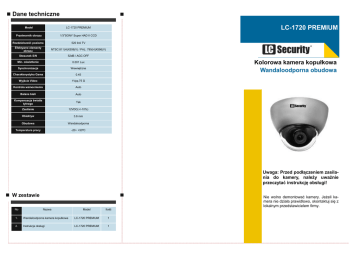 Dane techniczne LC-1720 PREMIUM Model LC-1720 PREMIUM Przetwornik obrazu 1/3"SONY Super HAD II CCD Rozdzielczość pozioma 520 linii TV Efektywne elementy obrazu NTSC:811(H)X508(V) / PAL: 795(H)X596(V) Stosunek S/N 52dB / AGC OFF Min. oświetlenie 0.001 Lux Synchronizacja Wewnętrzna Charakterystyka Gama 0.45 Wyjście Video 1Vpp,75 Ω Kontrola wzmocnienia Auto Balans bieli Auto Kompensacja światła tylnego Tak Zasilanie 12VDC(+/-10%) Obiektyw 3.6 mm Obudowa Wandaloodporna Temperatura pracy -20~ +50ºC Kolorowa kamera kopułkowa Wandaloodporna obudowa Uwaga: Przed podłączeniem zasilania do kamery, należy uważnie przeczytać instrukcję obsługi! W zestawie No Nie wolno demontować kamery. Jeżeli kamera nie działa prawidłowo, skontaktuj się z lokalnym przedstawicielem firmy. Nazwa Model Ilość 1. Wandaloodporna kamera kopułkowa LC-1720 PREMIUM 1 2. Instrukcja obsługi LC-1720 PREMIUM 1 OPIS PRODUKTU WPROWADZENIE POŁĄCZENIA * Przetwornik (CCD)) Zastosowano 1/3" CCD Super HAD II Sony. Monitor Video * Automatyczna kontrola wzmocnienia (AGC) Wbudowana automatyczna regulacja wzmocnienia (AGC) obwodu. Kamera kolorowa może uzyskać wysokiej jakości obraz przy stosunkowo niskim oświetleniu. * Kompensacja światła tylnego (BLC) Wbudowana funkcja kompensacji światła tylnego pozwala na uzyskanie obrazów o wyższym poziomie jakości. 12V DC Gratulujemy zakupu tego produktu. Przedstawiamy instrukcję obsługi serii produktów LC-1720 PREMIUM. W prezentowanej serii produktów zastosowaliśmy najnowsze rozwiązania technologiczne w dziedzinie przetwarzania obrazów firmy SONY. Kamery kolorowe z serii LC-1720 PREMIUM wyróżniają się wysoką rozdzielczością obrazu oraz bogactwem rzeczywistych kolorów. Wandaloodporna obudowa zapewnia efektywny i bezawaryjny nadzór wideo nawet w trudnych warunkach środowiskowych. Wygodny montaż, łatwa obsługa oraz wysokie parametry pracy sprawiają, że jest to produkt doskonale nadający się do budowy efektywnych systemów CCTV. Proszę uważnie przeczytać instrukcję obsługi w celu zapewnienia prawidłowego stosowania produktu. LC-1720 PREMIUM Aby uniknąć pożaru lub porażenia prądem, należy unikać * Automatyczny balans bieli (AWB) długotrwałego, bezpośredniego wpływu wody. * Tryb skanowania Tryb NTSC lub PAL. DC12V Źródło zasilania Symbol ma na celu zwrócenie uwagi użytkownika na istotne zasady eksploatacji i utrzymania (konserwacji) Zasada łączenia: Instrukcje w literaturze towarzyszącej urządzeniu. Video Symbol ma na celu zwrócenie uwagi użytkownika na obecność Zasilanie nieizolowanych “niebezpiecznych napięć”, które mogą mieć wystarczającą wielkość, aby stworzyć ryzyko porażenia osób prądem. OSTRZEŻENIE: RYZYKO PORAŻENIA. NIE OTWIERAĆ ROZWIĄZYWANIE PROBLEMÓW 1. Brak obrazu po podaniu zasilania . Możliwe, że źródło zasilania podaje niewłaściwe napięcie, należy sprawdzić napięcie na wyjściu zasilacza. . Sprawdź wszystkie połączenia kablowe i określi czy zostały wykonane prawidłowo czy nie. UWAGA: ABY ZMNIEJSZYĆ RYZYKO PORAŻENIA PRĄDEM NIE NALEŻY ZDEJMOWAĆ POKRYWY I DOTYKAĆ SPRAWNYCH URZĄDZEŃ WE WNĘTRZU. SERWISOWANIE NALEŻY POWIERZAĆ WYKWALIFIKOWANEMU PERSONE- UWAGA: Aby uniknąć wstrząsów elektrycznych i ryzyka wystąpienia zagrożeń pożarowych, nie należy używać innych niż określone, źródeł zasilania. 2. Na obrazie występują płynące fale zakłóceń . Przyczyną mogą być szumy występujące podczas dostaw zasilania AC, konieczne zastosowanie filtru fali zasilania. . Sprawdź monitor i zastosowane urządzenia peryferyjne. Uwaga: ● Zasilacz musi posiadać atest bezpieczeństwa. Jego napięcie wyjściowe, prąd, napięcie polaryzacji i temperatura robocza muszą być zgodne z wymogami kamery. ● Podczas korzystania z kamery w trakcie wyładowań atmosferycznych, należy pamiętać o zapewnieniu odpowiedniego uziemienia lub odłączyć kabel od źródła zasilania. ● W celu przechwycenia wysokiej jakości obrazu, kabel wideo i kabel zasilający nie powinien być zbyt długi. 3. Tło obrazu kolorowego zmienia się w sposób ciągły . Świetlówki powodują powstanie pola elektromagnetycznego, które wpływa na kolory. Jest to powszechne zjawisko u kamer. . Zmniejszenie liczby lamp fluorescencyjnych lub zwiększenie odległości między kamerą i lampami fluorescencyjnymi może poprawić jakość pracy kamery. . Użyj zewnętrznego źródła synchronizacji. 4. Rozmyty obraz . Niestabilne napięcie źródła zasilania. . Nieprawidłowo wykonane połączenia kablowe lub za wysoka impedancja. Uwaga: ● Należy pamiętać o temperaturze pracy oraz o stosowaniu kamery zgodnie z jej wymogami środowiskowymi. Unikaj stosowania kamery w zbyt wysokiej lub zbyt niskiej temperaturze. Temperatura pracy od –20 do 50 st. C. ● Nie należy ustawiać kamery w kierunku słońca lub silnych źródeł światła, ponieważ może to doprowadzić do uszkodzenia matrycy CCD. ● Nie montować kamery w pobliżu grzejników i silnych źródeł ciepła.