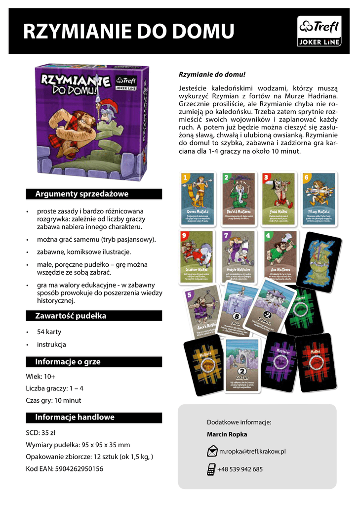 RZYMIANIE DO DOMU Rzymianie do domu! Jesteście kaledońskimi wodzami, którzy muszą wykurzyć Rzymian z fortów na Murze Hadriana. Grzecznie prosiliście, ale Rzymianie chyba nie rozumieją po kaledońsku. Trzeba zatem sprytnie rozmieścić swoich wojowników i zaplanować każdy ruch. A potem już będzie można cieszyć się zasłużoną sławą, chwałą i ulubioną owsianką. Rzymianie do domu! to szybka, zabawna i zadziorna gra karciana dla 1-4 graczy na około 10 minut. 2 1 6 3 Argumenty sprzedażowe • proste zasady i bardzo różnicowana rozgrywka: zależnie od liczby graczy zabawa nabiera innego charakteru. • można grać samemu (tryb pasjansowy). • zabawne, komiksowe ilustracje. • małe, poręczne pudełko – grę można wszędzie ze sobą zabrać. • gra ma walory edukacyjne - w zabawny sposób prowokuje do poszerzenia wiedzy historycznej. Zawartość pudełka • 54 karty • instrukcja Qween McGold Dru’hid McGreen Svord McRed Filchy McGold Przejmujesz siłę ataku innego odkrytego w tej turze wojownika i dodajesz do swojej siły ataku. Jeśli masz najwyższą siłę ataku, możesz przejąć dowolny fort Muru. Możesz dowolnie zmienić położenie swoich jeszcze nieodkrytych wojowników. Nie możesz zdobyć fortu i Twoje punkty nie są brane pod uwagę przy określaniu wygranych i remisów. 7 9 4 Ch’ariott McRed Horsie McViolet Axx McGreen Jeśli inny gracz w tej samej rundzie odkrywa kartę Ch’ariotta, to wszystkie zostają odrzucone. Jeśli nie zdobędziesz w tej rundzie fortu, to musisz odrzucić jednego z odkrytych wojowników. Jeśli zdobyłeś fort w tej turze, nie musisz odrzucać karty Axxa. Możesz zachować ją odkrytą. 5 Fort cViolet W mome Una A rch’r isyMz każdym graArczch’emFora,rtUze. zdnęob, nayttyncchie,migdastyodzdrzobywasz rem rze Wygrywa odsłonił w tej tu który nie ucasz ych wcze śniej fortó jeden w. FortH Naty chm zdob iast wygr ędzie yw sz 3 asz gr FortH ę, je ece. śli ec a Informacje o grze Wiek: 10+ Liczba graczy: 1 – 4 KomFort Gdy zdobywasz ten fort, możesz zachować najsłabszego ze swoich odkrytych wojowników. Czas gry: 10 minut Informacje handlowe SCD: 35 zł Wymiary pudełka: 95 x 95 x 35 mm Opakowanie zbiorcze: 12 sztuk (ok 1,5 kg, ) Kod EAN: 5904262950156 Dodatkowe informacje: Marcin Ropka [email protected] +48 539 942 685