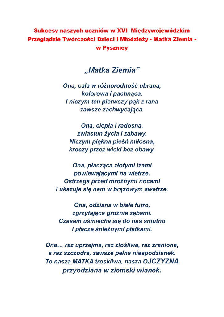 Sukcesy naszych uczniów w XVI Międzywojewódzkim Przeglądzie Twórczości Dzieci i Młodzieży - Matka Ziemia w Pysznicy „Matka Ziemia” Ona, cała w różnorodność ubrana, kolorowa i pachnąca. I niczym ten pierwszy pąk z rana zawsze zachwycająca. Ona, ciepła i radosna, zwiastun życia i zabawy. Niczym piękna pieśń miłosna, kroczy przez wieki bez obawy. Ona, płacząca złotymi łzami powiewającymi na wietrze. Ostrzega przed mroźnymi nocami i ukazuje się nam w brązowym swetrze. Ona, odziana w białe futro, zgrzytająca groźnie zębami. Czasem uśmiecha się do nas smutno i płacze śnieżnymi płatkami. Ona… raz uprzejma, raz złośliwa, raz zraniona, a raz szczodra, zawsze pełna niespodzianek. To nasza MATKA troskliwa, nasza OJCZYZNA przyodziana w ziemski wianek. Wiktoria Jurek, klasa III gimnazjum, lat 15, opiekun Iwona Szczepańska, Publiczne Gimnazjum im. Jana Pawła II w Kraczkowej. Tym wierszem trzecioklasistka naszego Gimnazjum - Wiktoria Jurek zdobyła II miejsce w konkursie literackim w kategorii poezja. Zgodnie z założeniami regulaminowymi wiersz, jako dowolna autorska refleksja na temat piękna Matki Ziemi, miał zawierać osobiste przemyślenia dotyczące uroku ojczystej ziemi, cywilizacyjnych zagrożeń oraz odpowiedzialności za stan środowiska naturalnego, powinien być swoistym ostrzeżeniem przed lawiną zagrożeń wynikających z cywilizacji, która bezmyślnie i agresywnie wypiera świat przyrody. Wiktoria w sposób metaforyczny podkreśliła urok Matki Ziemi, a tym samym przekonuje, że warto o nią zadbać. Sukcesem może pochwalić się także Dawid Rogowski – również uczeń klasy III b, który wziął udział w konkursie w kategorii plastyka, zdobywca III miejsca. Dawid uwrażliwił na piękno przyrody i konieczność jej rozumienia, posługując się przemyślaną kompozycją obrazu, różnorodnością wspaniale dobranej barwy i światłocieniem w przedstawieniu polskiego lasu. Opiekunem artystycznym jego pracy była pani Malgorzata Tymińska – Łojko. Prace naszych uczniów można podziwiać na pokonkursowej wystawie w Zespole Szkół w Pysznicy oraz w publikacjach wydanych w liczbie 200 egzemplarzy. Serdecznie w przyszłości. gratulujemy sukcesów i życzymy weny twórczej
