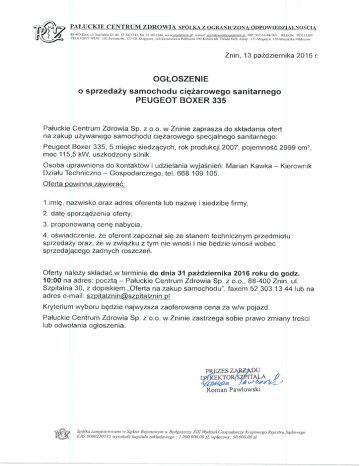 Paluckie Centrum Zdrowia Sp. z o.o. w Zninie zaprasza do sktadania ofert