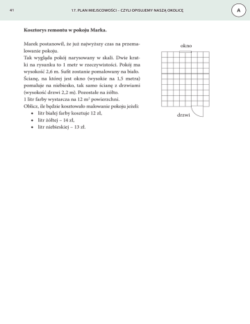 41 17. PLAN MIEJSCOWOŚCI – CZYLI OPISUJEMY NASZĄ OKOLICĘ Kosztorys remontu w pokoju Marka. Marek postanowił, że już najwyższy czas na przemalowanie pokoju. Tak wygląda pokój narysowany w skali. Dwie kratki na rysunku to 1 metr w rzeczywistości. Pokój ma wysokość 2,6 m. Sufit zostanie pomalowany na biało. Ścianę, na której jest okno (wysokie na 1,5 metra) pomaluje na niebiesko, tak samo ścianę z drzwiami (wysokość drzwi 2,2 m). Pozostałe na żółto. 1 litr farby wystarcza na 12 m2 powierzchni. Oblicz, ile będzie kosztowało malowanie pokoju jeżeli: ◆ litr białej farby kosztuje 12 zł, ◆ litr żółtej – 14 zł, ◆ litr niebieskiej – 13 zł. okno drzwi A 42 17. PLAN MIEJSCOWOŚCI – CZYLI OPISUJEMY NASZĄ OKOLICĘ Remont w pokoju Krysi Krysia postanowiła przemalować swój pokój. Tak wygląda pokój narysowany w skali. Dwie kratki na rysunku to 1 metr w rzeczywistości. Pokój ma wysokość 2,6 m. Wysokość okna wynosi 1,5 m, a wysokość drzwi 2,2 m. Kasia wymyśliła, że pomaluje pokój tak, że będzie wyglądał jak tapetowany. Sufit pomaluje w pasy szaro-żółte biegnące od drzwi do okna. Pasy mają mieć 25 cm szerokości. Szary pas będzie zaczynał układ kolorów na suficie. Ściany pomaluje w pionowe pasy o szerokości 50 cm. Będą niebieskie i szare. Zacznie koło drzwi, po lewej stronie niebieskim kolorem. Ile będzie kosztowało pomalowanie pokoju? 1 litr farby wystarcza na 12 m2 powierzchni. Oblicz, ile będzie kosztowało malowanie pokoju jeżeli: ◆ litr szarej farby kosztuje 14 zł, ◆ litr żółtej – 14 zł, ◆ litr niebieskiej – 13 zł. okno drzwi B