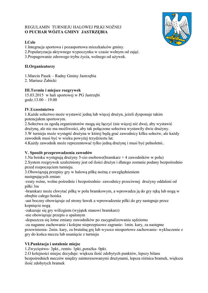 REGULAMIN TURNIEJU HALOWEJ PIŁKI NOŻNEJ O PUCHAR WÓJTA GMINY JASTRZĘBIA I.Cele 1.Integracja sportowa i pozasportowa mieszkańców gminy. 2.Popularyzacja aktywnego wypoczynku w czasie wolnym od zajęć. 3.Propagowanie zdrowego trybu życia, wolnego od używek. II.Organizatorzy 1.Marcin Pasek – Radny Gminy Jastrzębia 2. Mariusz Żabicki III.Termin i miejsce rozgrywek 15.03.2015 w hali sportowej w PG Jastrzębi godz.13.00 – 19.00 IV.Uczestnictwo 1.Każde sołectwo może wystawić jedną lub więcej drużyn, jeżeli dysponuje takim potencjałem sportowym. 2.Sołectwa za zgodą organizatorów mogą się łączyć (nie więcej niż dwa), aby wystawić drużynę, ale nie ma możliwości, aby tak połączone sołectwa wystawiły dwie drużyny. 3.W turnieju może wystąpić drużyna w której będą grać zawodnicy kilku sołectw, ale każdy zawodnik musi być w wieku powyżej trzydziestu lat. 4.Każdy zawodnik może reprezentować tylko jedną drużynę i musi być pełnoletni.. V. Sposób przeprowadzenia zawodów 1.Na boisku występują drużyny 5-cio osobowe(bramkarz + 4 zawodników w polu) 2.System rozgrywek uzależniony jest od ilości drużyn i dlatego zostanie podany bezpośrednio przed rozpoczęciem turnieju. 3.Obowiązują przepisy gry w halową piłkę nożną z uwzględnieniem następujących zmian: -rzuty rożne, wolne pośrednie i bezpośrednie- zawodnicy przeciwnej drużyny oddaleni od piłki 3m -bramkarz może chwytać piłkę w polu bramkowym, a wprowadza ją do gry ręką lub nogą w obrębie całego boiska -aut boczny obowiązuje od strony ławek a wprowadzenie piłki do gry następuje przez kopnięcie nogą -zakazuje się gry wślizgiem (wyjątek stanowi bramkarz) -nie obowiązuje przepis o spalonym -dopuszcza się lotne zmiany zawodników po zasygnalizowaniu sędziemu -za naganne zachowanie i kolejne nieprzepisowe zagranie- 1min. kary, za następne przewinienia- 2min. kary, za brutalną grę lub wysoce niesportowe zachowanie- wykluczenie z gry do końca meczu lub usunięcie z turnieju VI.Punktacja i ustalenie miejsc 1.Zwycięstwo- 3pkt., remis- 1pkt.,porażka- 0pkt. 2.O kolejności miejsc decyduje: większa ilość zdobytych punktów, lepszy bilans bezpośrednich meczów między zainteresowanymi drużynami, lepsza różnica bramek, większa ilość zdobytych bramek VII.Nagrody 1.Pierwsze trzy drużyny dostaną puchary 2.Przewidziane są nagrody dla najlepszego strzelca i bramkarza VIII.Uwagi końcowe 1.Organizator zapewnia obsługę sędziowską turnieju oraz pomoc medyczną w zakresie podstawowym (pielęgniarkę) 2.Organizatorzy nie ponoszą odpowiedzialności za skutki kontuzji zawodników odniesionych podczas turnieju 3.Organizatorzy nie odpowiadają za skutki kradzieży w trakcie trwania turnieju 4.Organizator zastrzega sobie prawo do podejmowania decyzji w kwestiach spornych 5.Nie przewiduje się protestów i odwołań od wyników sportowych. Każdy uczestnik obowiązany jest do posiadania stroju sportowego i obuwia halowego na jasnym spodzie oraz do przestrzegania regulaminu obowiązującego na terenie obiektów Gimnazjum ZABRANIA SIĘ PICIA ALKOHOLU I PALENIA TYTONIU NA TERENIE OBIEKTÓW PUBLICZNEGO GIMNAZJUM W JASTRZĘBI
