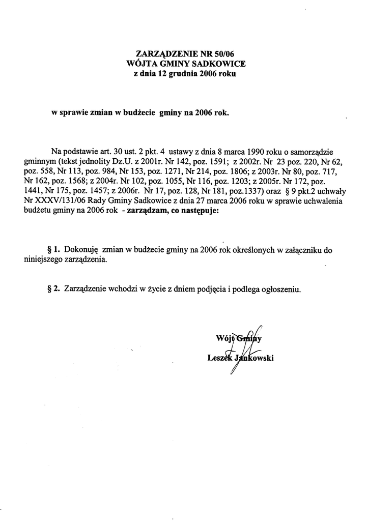 ZARZ¥DZENIE NR 50/06 WÓJT A GMINY SADKOWICE z dnia 12 grudnia 2006 roku w sprawie zmian w bud¿ecie gminy na 2006rok. Na podstawieart. 30 ust. 2 pkt. 4 ustawyz dnia 8 marca1990roku o samorz¹dzie gminnym(tekstjednolity Dz.U. z 2001r.Nr 142,poz. 1591; z 2002r. Nr 23 poz. 220, Nr 62, poz. 558, Nr 113,poz. 984, Nr 153,poz. 1271,Nr 214,poz. 1806;z 2003r.Nr 80, poz. 717, Nr 162,poz. 1568;z 2004r. Nr 102,poz. 1055,Nr 116,poz. 1203;z 2005r.Nr 172,poz. 1441,Nr 175,poz. 1457;z 2006r. Nr 17,poz. 128,Nr 181,poz.1337)oraz § 9 pkt.2 uchwa³y Nr XXXV/131/06 Rady Gminy Sadkowicez dnia 27 marca2006 roku w sprawieuchwalenia bud¿etugminy na 2006 rok -zarz¹dzam, co nastêpuje: § 1. Dokonujê zmian w bud¿eciegminy na 2006 rok okreœlonych w za³¹cznikudo niniejszegozarz¹dzenia. § 2. Zarz¹dzeniewchodzi w ¿yciez dniempodjêciai podlegaog³oszeniu. Wó Lesz ~ y owski Za³¹cznik do zarz¹dzenia Nr 50/06 Wójta Gminy Sadkowice z dnia 12 grudnia 2006r. PRZENIESIENIA WYDATKÓW MIÊDZY PARAGRAFAMI Dzia³ Rozdz. § 751 T r e Œæ Zmniejszono URZÊDY NACZELNYCH ORGANÓW W£ADZY wz³ Zwiêkszono 873 873 873 873 PAÑSTWOWEJ, KONTROLI I OCHRONY PRAWA ORAZ S¥DOWNICTWA 75109 Wybory do rad gmin, rad powiatów i sejmików województw, wybory wójtów, burmistrzów i prezydentów miast oraz referenda gminne, powiatowe i wojewódzkie . (zadania zlecone) 4110 Sk³adki na ubezpieczenia spo³eczne 4120 Sk³adki na Fundusz Pracy 105 17 4170 Wynagrodzenia bezosobowe 4210 Zakup materia³ów i wyposa¿enia 4300 Zakup us³ug pozosta³ych 214 751 186 4410 Podró¿e s³u¿bowekrajowe 473 O gó ³em 873 873 Wój Lesz ski