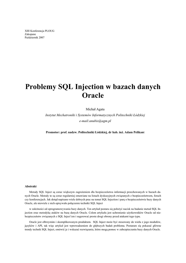 XIII Konferencja PLOUG Zakopane Październik 2007 Problemy SQL Injection w bazach danych Oracle Michał Agata Instytut Mechatroniki i Systemów Informatycznych Politechniki Łódzkiej e-mail:[email protected] Promotor: prof. nadzw. Politechniki Łódzkiej, dr hab. inż. Adam Pelikant Abstrakt Metody SQL Inject są coraz większym zagrożeniem dla bezpieczeństwa informacji przechowanych w bazach danych Oracle. Metody te są coraz regularniej omawiane na listach dyskusyjnych związanych z bezpieczeństwem, forach czy konferencjach. Jak dotąd napisano wiele dobrych prac na temat SQL Injection i parę o bezpieczeństwie bazy danych Oracle, ale niewiele z nich opisywało połączenie techniki SQL Inject w zależności od oprogramowywania bazy danych. Ten artykuł postara się położyć nacisk na badanie metod SQL Injection oraz metodykę ataków na bazę danych Oracle. Celem artykułu jest uchronienie użytkowników Oracle od niebezpieczeństw związanych z SQL Inject’em i sugerować proste drogi obrony przed atakami tego typu. Oracle jest olbrzymim i skomplikowanym produktem. SQL Inject może być stosowany do wielu z jego modułów, języków i API, tak więc artykuł jest wprowadzeniem do głębszych badań problemu. Postaram się pokazać główne trendy technik SQL Inject, omówić je i wskazać rozwiązania, które mogą pomoc w zabezpieczaniu bazy danych Oracle. Problemy SQL Injection w bazach danych Oracle Czym jest SQL Injection? SQL Injection to sposób ataku na dane znajdujące się w bazie – nawet, kiedy sam serwer jest chroniony zaporą ogniową (FIREWALL). Jest to metoda, dzięki której parametry aplikacji sieciowej są zmodyfikowane tak, aby zmienić deklaracje SQL, które przechodzą do bazy danych aby otrzymać dane w postaci odpowiedzi. Na przykład, przez dodawanie jednego apostrofu (‘) do listy parametrów, można spowodować wykonanie drugiego zapytania zagnieżdżonego w pierwszym. Atak na bazę danych używając metody SQL Injection, może być motywowany przez dwa główne założenia: 1. Ukraść dane z bazy danych (którego to dane w sposób jawny nie powinny być dostępne) lub uzyskać dane odnośnie konfiguracji systemu (których znajomość zezwoliłaby na sporządzenie profilu późniejszego ataku). Przykładem może być atak mający na celu pozyskanie hash’y haseł bazy danych, które w późniejszym czasie mogą być złamane metodą siłową (brute-force). 2. Dostać się do wewnątrz struktury organizacji poprzez komputery, na których zainstalowana jest działająca baza danych. Cel może zostać osiągnięty poprzez użycie pakietów procedur i rozszerzeń języka 3GL, które pozwalają na dostęp O/S. Jest wiele sposobów by wykorzystać metodę SQL Inject na bazie danych Oracle. Atak bazuje na użytym języku programowania oraz API. Poniżej prezentuję podstawowe języki i narzędzia, mogące być części aplikacji sieciowej, mające jednocześnie możliwość łączenia się z bazą danych Oracle: • • • • • • • • JSP ASP XML, XSL i XSQL Javascript VB, MFC, i inne narzędzia oraz API bazujące na ODBC Raporty, typowe narzędzia Oracle Języki 3- i 4GL takie jak C, OCI, Pro C, COBOL Perl i skrypty CGI, które posiadają możliwość łączenia się z bazą danych Oracle Każdy z powyższych może służyć jako baza do przeprowadzenia ataku SQL Inject na bazę danych Oracle. Do przeprowadzenia ataku, musi być jednak spełniony podstawowy warunek. Przede wszystkim, aby SQL Inject był możliwy do przeprowadzenia, w aplikacji, produkcie czy narzędziu, musi być dozwolone użycie dynamicznego SQL. Ostatnim ważnym punktem, który zazwyczaj nie jest omawiany to fakt, iż SQL Inject przeprowadzany wobec bazy danych, nie jest tylko problemem aplikacji sieciowej. Groźny kod SQL, używany przy ataku SQL Inject, może być wstrzyknięty w przypadku każdej aplikacji, która umożliwia użytkownikowi wprowadzanie danych oraz korzysta z dynamicznego SQL’a. Oczywiście, aplikacje sieciowe przedstawiają najwyższy poziom ryzyka, jako, że każdy użytkownik, posiadający przeglądarkę sieciową oraz połączenie internetowe, może być w stanie przeprowadzić atak SQL Inject. Metody ochrony przez takimi atakami zostaną omówione Michał Agata w dalszej części artykułu, jednakże w tym miejscu chciałbym wspomnieć o kilku faktach. Dane osadzone w bazie danych Oracle, powinny być chronione przez dostępem użytkowników korporacji, pracowników korporacji czy użytkowników zewnętrznych, upoważnionych do pracy z aplikacjami, które operują na chronionych danych. Użytkownicy mogą oczywiście chcieć uzyskać dostęp do danych, które nie są dla nich przeznaczone (do wglądu, odczytu). Należy więc pamiętać, że największe niebezpieczeństwo będzie pochodziło właśnie od uprawnionych użytkowników (pracowników, użytkowników „wewnętrznych”). Obrona przez atakiem typu SQL Inject składa się głównie z dwóch etapów. Są to: 1. 2. Kontrola kodu źródłowego aplikacji i zapobieganie wszelkim próbom wstrzykiwania kodu SQL. (zapobieganie od strony programistycznej poprzez walidację i sprawdzanie czy na przykład – utworzenie logicznych limitów oraz zasad bezpieczeństwa) Stosowanie zasady „najniższego dostępu”, wedle której wobec przeprowadzonego ataku SQL Inject, użytkownik jest w stanie ukraść NIE WIĘCEJ danych, niż projektant zezwala w przypadku poprawnej pracy aplikacji. Czy SQL Injection może być wykryte? SQL Injection można wykryć, ale prawdopodobnie nie zawsze i nie w czasie rzeczywistym. Jest wiele skomplikowanych powodów: • Wiele różnych form ataku SQL Inject, które mogą mają miejsce - są ograniczone tylko przez wyobraźnię hackera oraz dalekowzroczność DBA (a właściwie jej brak) – wobec ochrony i przestrzegania zasad dostępu do bazy danych • Identyfikowanie kodu SQL, który nie powinien wystąpić, nie jest proste. SQL Inject jest możliwe poprzez możliwość