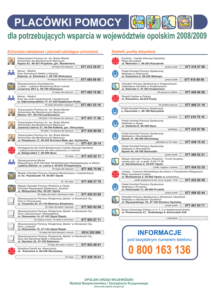 PLACÓWKI POMOCY dla potrzebuj¹cych wsparcia w województwie opolskim 2008/2009 Schroniska ca³odobowe i placówki udzielaj¹ce schronienia Sto³ówki, punkty do¿ywiania Towarzystwo Pomocy im. œw. Brata Alberta Schronisko dla Bezdomnych Mê¿czyzn Pêpice 81, 49-351 Przylesie, gm. Skarbimierz 48 miejsc dla mê¿czyzn Kuchnia - Caritas Diecezji Opolskiej Rejon Kluczbork ul. Wolnoœci 1, 46-203 Kluczbork 077 412 39 87 Monar - Markot Dom Samotnych Matek z Dzieæmi Zopowy, ul. Zamkowa 1, 48-100 G³ubczyce 44 miejsca dla kobiet i dzieci gor¹ce posi³ki K S 15 miejsc dla mê¿czyzn gor¹ce posi³ki 077 485 76 96 077 481 53 18 K S 077 431 11 56 K S Towarzystwo Pomocy im. œw. Brata Alberta Schronisko dla Bezdomnych Mê¿czyzn Jasienica Górna 37, 48-364 Ka³ków, gm. Otmuchów 45 ³ó¿ek + 5 materacy dla mê¿czyzn 077 435 69 90 K S Towarzystwo Pomocy im. œw. Brata Alberta Schronisko dla Bezdomnych Mê¿czyzn ul. Klasztorna 17, 48-325 Œcinawa Ma³a, gm. Korfantów 39 miejsc 39 miejsc dla mê¿czyzn 077 431 29 14 K S Noclegownia dla Osób Bezdomnych Caritas Diecezji Opolskiej + pokój przeznaczony dla ofiar przemocy w rodzinie ul. Baligrodzka 7, 48-300 Nysa 35 miejsc 077 803 62 00 Stowarzyszenie Pomocy Wzajemnej „Barka” w Strzelcach Op. Dom „Kaczorownia” Warm¹towice ul. Olszowska 14, 47-143 Ujazd Œl¹ski, 22 miejsca w domu, 16 miejsc w schronisku jad³odajnia na 30 miejsc 077 439 15 32 077 460 62 21 077 454 53 35 077 453 65 59 Polski Komitet Pomocy Spo³ecznej Sto³ówka w Prudniku ul. Koœciuszki 11, 48-200 Prudnik gor¹ce posi³ki 077 406 62 44 Oœrodek Pomocy Spo³ecznej w Strzelcach Opolskich Sto³ówka w Strzelcach Opolskich ul. Wyszyñskiego 10, 47-100 Strzelce Opolskie gor¹ce posi³ki 077 461 03 71 Domy Dziennego Pobytu nr 2, 3, 5 w Kêdzierzynie-KoŸlu ul. Piramowicza 27, Grabskiego 6, Koœciuszki 43A 3 jad³odajnie 077 803 67 11 0514 352 008 INFORMACJE pod bezp³atnym numerem telefonu 077 803 69 01 Œwietlica Parafii œw. Wawrzyñca ul. Koœcielna 4, 48-340 G³ucho³azy 40 miejsc 077 435 87 96 Polski Komitet Pomocy Spo³ecznej Sto³ówka w Niemodlinie Rynek 44, 49-100 Niemodlin Stowarzyszenie Pomocy Wzajemnej „Barka” w Strzelcach Op. Dom dla Samotnej Matki z Dzieckiem ul. Opolska 32, 47-120 ¯êdowice 8 miejsc dla matek z dzieæmi jad³odajna Polski Komitet Pomocy Spo³ecznej Sto³ówka w G³ucho³azach Rynek 31, 48-340 G³ucho³azy Stowarzyszenie Pomocy Wzajemnej „Barka” w Strzelcach Op. Dom „Leopold” ul. Olszowska 15, 47-143 Ujazd Œl¹ski 16 miejsc dla osób starszych i chorych 077 410 75 16 Polski Komitet Pomocy Spo³ecznej Sto³ówka w Nysie ul. Sudecka 8, 48-300 Nysa posi³ki wydawane od pon. do pt. od godz. 15.00 K S 077 455 63 80 jad³odajna Caritas - Centrum Rehabilitacji dla Dzieci z Pora¿eniem Mózgowym Misja Gara¿owa Caritas ul. Mickiewicza 5, 45-062 Opole (w podwórku) 077 456 27 76 Stowarzyszenie Pomocy Wzajemnej „Barka” w Strzelcach Op. Dom w Doryszowie ul. Toszecka 23, 47-134 B³otnica Strzelecka 25 miejsc dla kobiet i mê¿czyzn 077 469 31 18 posi³ki, magazyn z odzie¿¹ 077 402 75 90 Miejski Oœrodek Pomocy Rodzinie w Opolu Oœrodek Readaptacji Spo³ecznej „Szansa” ul. Ma³opolska 20a, 45-301 Opole 120 miejsc dla rodzin i samotnych matek 50 posi³ków dziennie Polski Komitet Pomocy Spo³ecznej u. Harcerska 1, 46-100 Namys³ów Miejski Oœrodek Pomocy Rodzinie - Punkt Socjalny czynny pon.-pt. w godz. 9.00-17.00 ul. Sienkiewicza 2, 45-037 Opole Miejski Oœrodek Pomocy Osobom Bezdomnym i Uzale¿nionym ul. ks. Popie³uszki 18, 45-601 Opole 60 - 90 miejsc 077 446 66 98 gor¹ce posi³ki 077 435 52 11 Stowarzyszenie Monar Niepubliczny ZOZ Oœrodek Rehabilitacyjno-Readaptacyjny w Zbicku Lêdziny-Zbicko, ul. Leœna 2, 46-053 Chrz¹stowice 20 miejsc dla mê¿czyzn 100 gor¹cych posi³ków Zespó³ Caritas w Pokoju ul. Koœcielna, 46-034 Pokój Towarzystwo Pomocy im. œw. Brata Alberta Schronisko dla Bezdomnych Mê¿czyzn Bielice 127, 48-316 £ambinowice 160 ³ó¿ek + 40 materacy dla mê¿czyzn 077 418 89 80 Oœrodek Pomocy Spo³ecznej w Krapkowicach Jad³odajnia Oœrodka w Krapkowicach ul. Damrota 2, 47-303 Krapkowice Monar - Markot Dom dla osób najubo¿szych i bezdomnych ul. D¹browszczaków 11, 47-230 Kêdzierzyn-KoŸle 40 miejsc dla kobiet i mê¿czyzn Polski Komitet Pomocy Spo³ecznej Sto³ówka w Wo³czynie ul. Koœcielna 2, 46-250 Wo³czyn 077 485 98 00 Stowarzyszenie Charytatywne „Ludzie - Ludziom Bezdomnej Braci Leœnej” Lenarcice 29/1-2, 48-100 G³ubczyce 077 418 57 88 077 439 16 01 0 800 163 136 OPOLSKI URZ¥D WOJEWÓDZKI Wydzia³ Bezpieczeñstwa i Zarz¹dzania Kryzysowego www.wzk.opole.uw.gov.pl