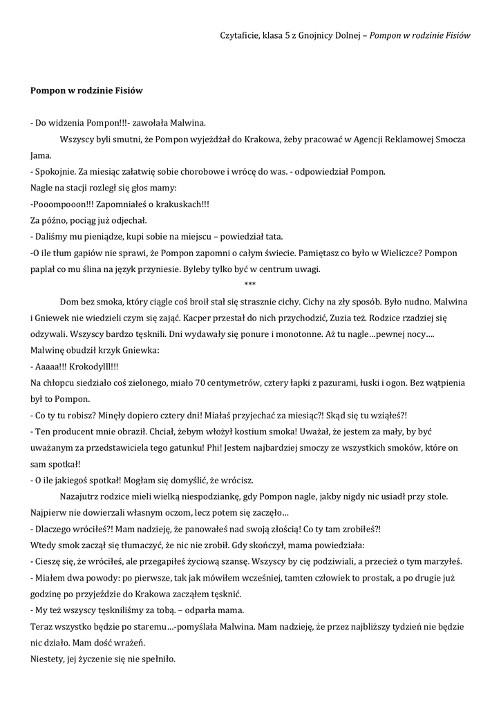 Czytaficie, klasa 5 z Gnojnicy Dolnej – Pompon w rodzinie Fisiów Pompon w rodzinie Fisiów - Do widzenia Pompon!!!- zawołała Malwina. Wszyscy byli smutni, że Pompon wyjeżdżał do Krakowa, żeby pracować w Agencji Reklamowej Smocza Jama. - Spokojnie. Za miesiąc załatwię sobie chorobowe i wrócę do was. - odpowiedział Pompon. Nagle na stacji rozległ się głos mamy: -Pooompooon!!! Zapomniałeś o krakuskach!!! Za późno, pociąg już odjechał. - Daliśmy mu pieniądze, kupi sobie na miejscu – powiedział tata. -O ile tłum gapiów nie sprawi, że Pompon zapomni o całym świecie. Pamiętasz co było w Wieliczce? Pompon paplał co mu ślina na język przyniesie. Byleby tylko być w centrum uwagi. *** Dom bez smoka, który ciągle coś broił stał się strasznie cichy. Cichy na zły sposób. Było nudno. Malwina i Gniewek nie wiedzieli czym się zająć. Kacper przestał do nich przychodzić, Zuzia też. Rodzice rzadziej się odzywali. Wszyscy bardzo tęsknili. Dni wydawały się ponure i monotonne. Aż tu nagle…pewnej nocy…. Malwinę obudził krzyk Gniewka: - Aaaaa!!! Krokodylll!!! Na chłopcu siedziało coś zielonego, miało 70 centymetrów, cztery łapki z pazurami, łuski i ogon. Bez wątpienia był to Pompon. - Co ty tu robisz? Minęły dopiero cztery dni! Miałaś przyjechać za miesiąc?! Skąd się tu wziąłeś?! - Ten producent mnie obraził. Chciał, żebym włożył kostium smoka! Uważał, że jestem za mały, by być uważanym za przedstawiciela tego gatunku! Phi! Jestem najbardziej smoczy ze wszystkich smoków, które on sam spotkał! - O ile jakiegoś spotkał! Mogłam się domyślić, że wrócisz. Nazajutrz rodzice mieli wielką niespodziankę, gdy Pompon nagle, jakby nigdy nic usiadł przy stole. Najpierw nie dowierzali własnym oczom, lecz potem się zaczęło… - Dlaczego wróciłeś?! Mam nadzieję, że panowałeś nad swoją złością! Co ty tam zrobiłeś?! Wtedy smok zaczął się tłumaczyć, że nic nie zrobił. Gdy skończył, mama powiedziała: - Cieszę się, że wróciłeś, ale przegapiłeś życiową szansę. Wszyscy by cię podziwiali, a przecież o tym marzyłeś. - Miałem dwa powody: po pierwsze, tak jak mówiłem wcześniej, tamten człowiek to prostak, a po drugie już godzinę po przyjeździe do Krakowa zacząłem tęsknić. - My też wszyscy tęskniliśmy za tobą. – odparła mama. Teraz wszystko będzie po staremu…-pomyślała Malwina. Mam nadzieję, że przez najbliższy tydzień nie będzie nic działo. Mam dość wrażeń. Niestety, jej życzenie się nie spełniło. Czytaficie, klasa 5 z Gnojnicy Dolnej – Pompon w rodzinie Fisiów *** - Malwina! Malwina! – krzyczał Pompon. Należy wspomnieć, że minęły zaledwie dwa dni od jego powrotu. – Musisz to zobaczyć! Szybko! Dziewczynka układała pasjansa w internecie. Smok krzyczał na zewnątrz, więc Malwina musiała do niego pójść. Niechętnie zwlekła się z fotela… -Co?-spytała, lecz zanim Pompon zdołał coś powiedzieć sama zauważyła przyczynę jego krzyku. Przed nim stał jasnozielony jak groszek … smok. I nie był to Pompon. Malwina przyjrzała się uważniej… To była smoczyca! - Pompon!!! Kto to jest?!- zawołała. -Nazywam się Pepsikola i uciekłam z ZOO. – uprzedziła Pompona smoczyca. -To w ZOO mają smoki?!-zdziwiła się dziewczynka. - Nie cały czas brali mnie za legwana, uwierz mi, nie da się wytrzymać, gdy cały czas trzymają cię w klatce. - Pompon jest u nas już około roku, może nic się nie stanie, jeśli będziemy mieli dwa smoki…- zaproponowała Malwina.